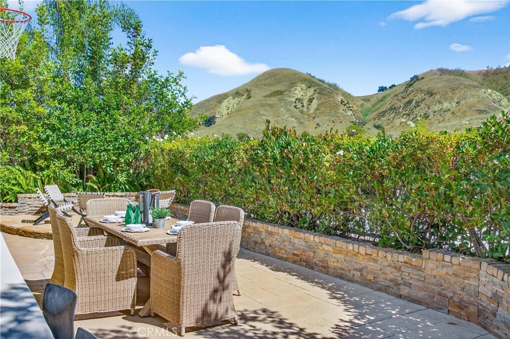 Welcome to Cielo Circle! This chic home is tucked into the rolling hills of Calabasas and offers one of the premier view locations (with no immediate neighbor on one side) within The Colony at Calabasas, a peaceful, gated enclave combining privacy, convenience, style and a floor plan tailored for today’s lifestyle.  Featuring five bedrooms and four baths, this modern home is enhanced by wood floors, recessed lighting, tall ceilings, and wide blade shutters throughout.  The open concept kitchen seamlessly connects to the family room with fireplace and is outfitted with top-tier stainless steel appliances, including a Thermador six-burner range with oven, an additional Thermador wall oven, Sub-Zero refrigerator, and a center island ideal for gathering. A formal dining room adds versatility for both intimate meals and large-scale entertaining. Upstairs, the primary suite is set on its own serving as a serene retreat with custom wood wall trim. The generous spa like bathroom offers a walk-in closet, soaking tub, dual sink vanity, separate rimless glass shower and private balcony overlooking the rolling hills and mature oak trees. Conveniently the laundry room is on this level as well, while a downstairs office offers excellent work-from-home functionality. Freshly painted inside and out, the home features a tankless water heater, updated AC compressors, updated lighting, EV charger, and added garage air conditioning.  Outdoors, enjoy the peaceful and quiet surroundings while entertaining around the built-in BBQ island, fire ring, and tranquil natural surroundings—perfect for everyday relaxation or entertaining guests. Residents of The Colony enjoy a pool, playground, gated security, and a prime location close to the local freeways, 15 min drive to Malibu, two blocks from Erewhon Market, local restaurants, play parks, dog park, hiking and biking trails, and award-winning Las Virgenes Schools.  This is your chance to own a home in one of Calabasas’ most coveted communities!