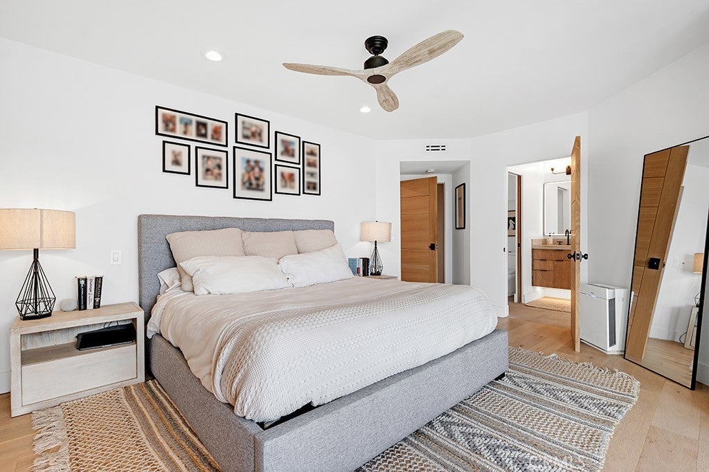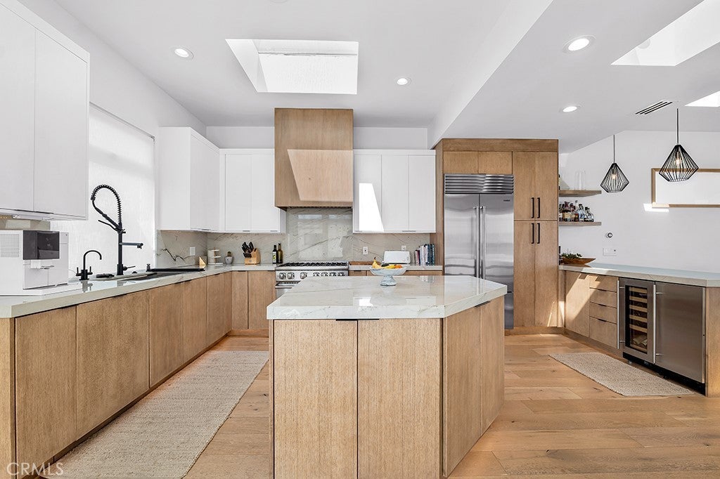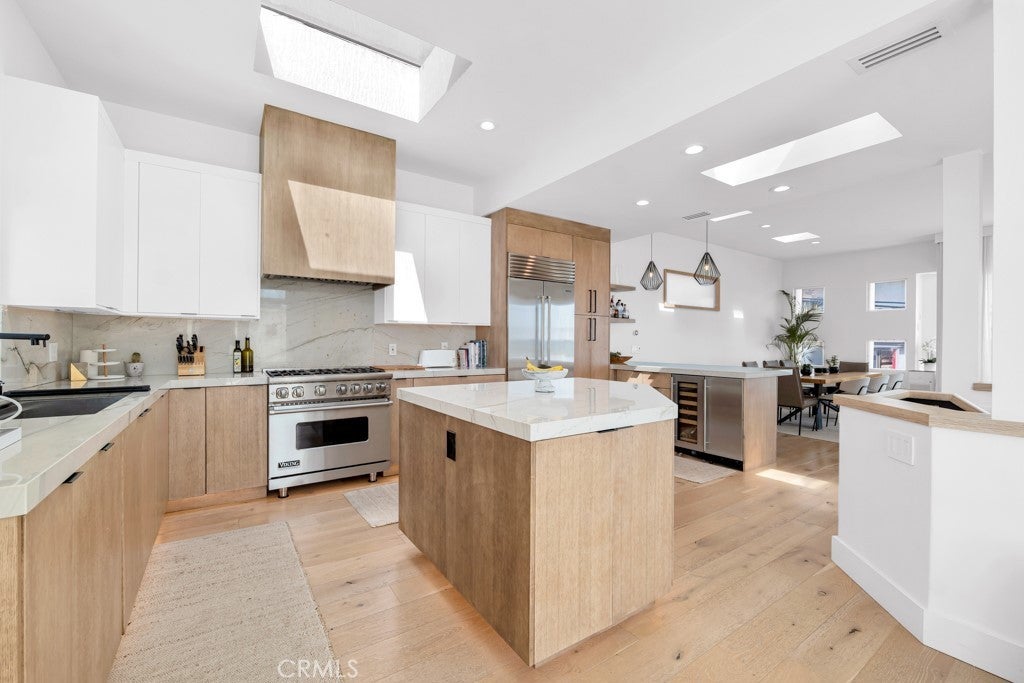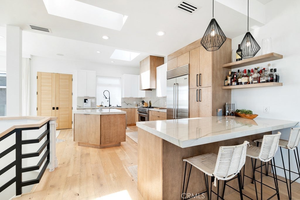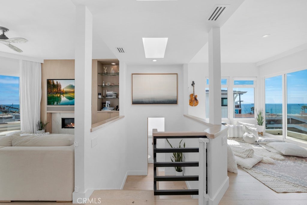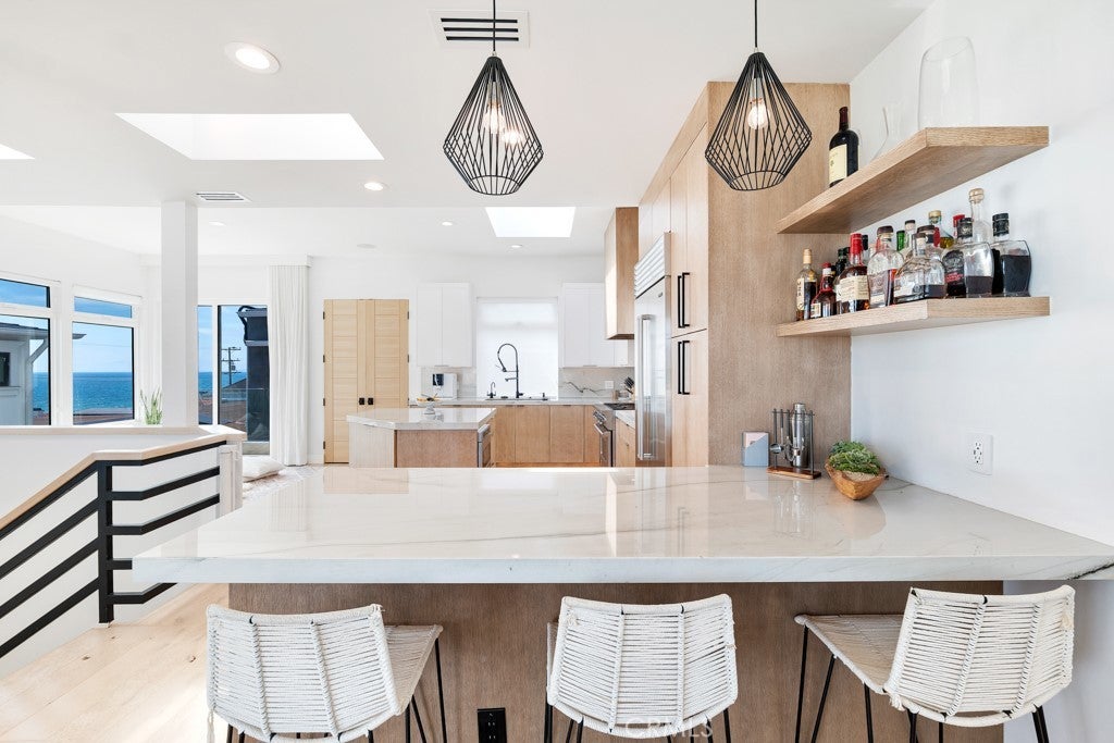 YOUR PRIVATE ARCHITECTURAL CONTEMPORARY BEACH HOUSE AWAITS! BREATHTAKING, PANORAMIC 180-DEGREE WHITE WATER AND COASTLINE VIEWS FROM MALIBU TO PALOS VERDES! MAJOR REMODEL RENOVATION COMPLETED 2021! MODERN FLOORPLAN, ELEVATION AND DESIGN! PREMIUM LOCATION IN THE SAND SECTION OF MANHATTAN BEACH, JUST FOUR HOUSES UP FROM THE STRAND, JUST STEPS TO THE BEACH & BOARDWALK YET ELEVATED TO GIVE YOU THE MOST INCREDIBLE PANORAMIC VIEWS, THE PERFECT LOCATION! 'BRUSH-FREE NEIGHBORHOOD!' JUST MINUTES TO LAX! Luxury and effortless BEACH LIVING converge at 129 Moonstone Street, architecturally stunning, with TEN FOOT CEILINGS, contemporary (2,143 SQ FT) SINGLE FAMILY HOME. (NO HOA!) This rare residence sits quietly WEST OF HIGHLAND on a PRIVATE and QUIET STREET offering the ultimate in exclusivity and tranquility. Inside, nearly every inch has been thoughtfully reimagined for modern luxury, from the ten-foot ceilings and walls of glass to skylights to the wide-plank white oak hardwood floors and designer finishes throughout. The sun-lit, open-concept floorplan is ideal for sophisticated entertaining or laid-back coastal beach days, featuring a state-of-the-art chef's center island gourmet kitchen with quartzite stone countertops, Viking and Sub-Zero appliances, a wine fridge, dry bar with ice maker, and a seamless transition to indoor/outdoor dining on one of four private balconies. Retreat to the palatial primary suite with marble fireplace, TWO WALK-IN CLOSETS, spa-like bath with freestanding tub and oversized shower. ALL THREE BEDROOMS ARE ENSUITES and OVERSIZED with lavish, modern baths, and an additional versatile DEN/OFFICE ADDS flexible space for work or guests. Enjoy peace of mind and effortless living with a fully integrated SMART HOME SYSTEM--security, cameras, Sonos whole-home sound, lighting and climate--all controlled via Apple HomeKit. Additional highlights include a built-in marble fireplace entertainment center in living room, interior laundry room, tankless hot water heater, whole-home filtration and softener, central A/C and heat, recessed and under-cabinet lighting and ceiling fans throughout. The finished two-car garage with Tesla charger and extra storage adds convenience, while a city-funded undergrounding project (now in Phase 3 of 4 phases), promises future value and EVEN BETTER panoramic white water and coastline VIEWS! CAN BE SOLD FURNISHED. CONCESSIONS.