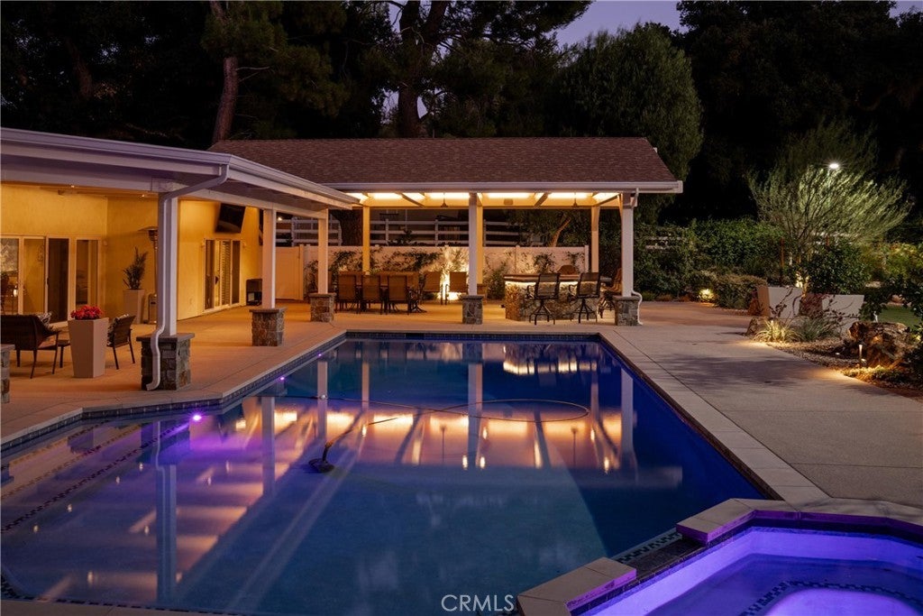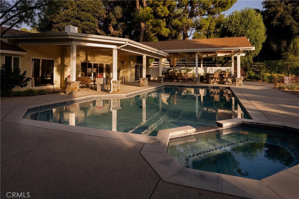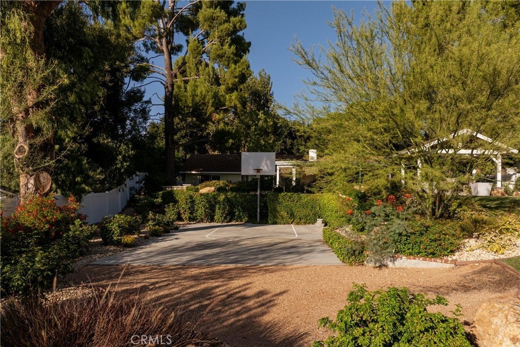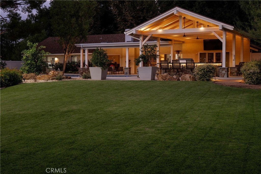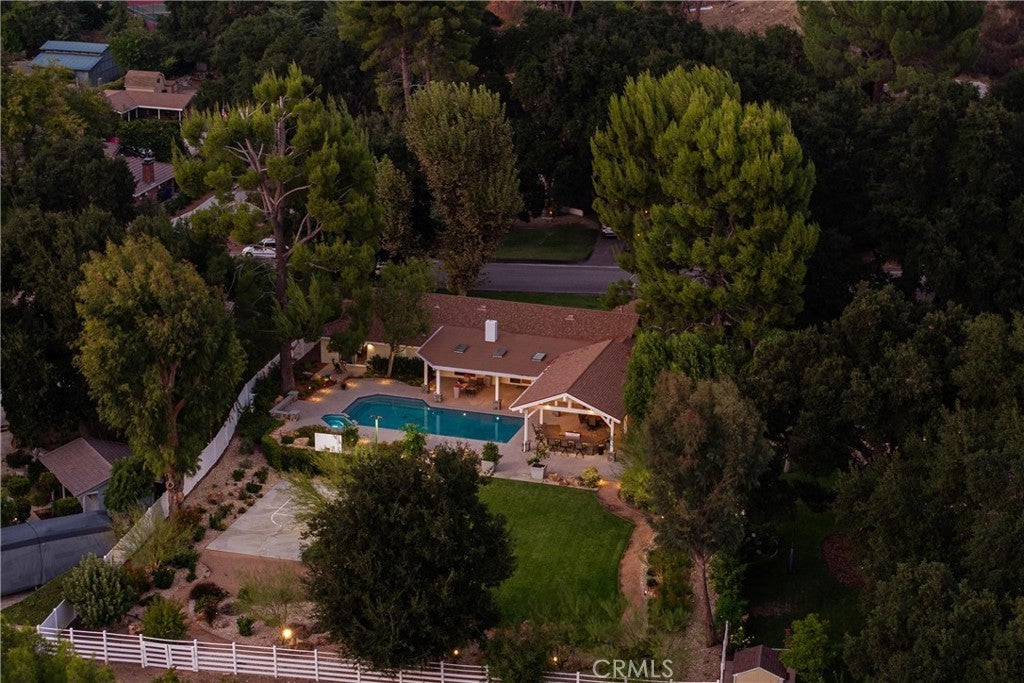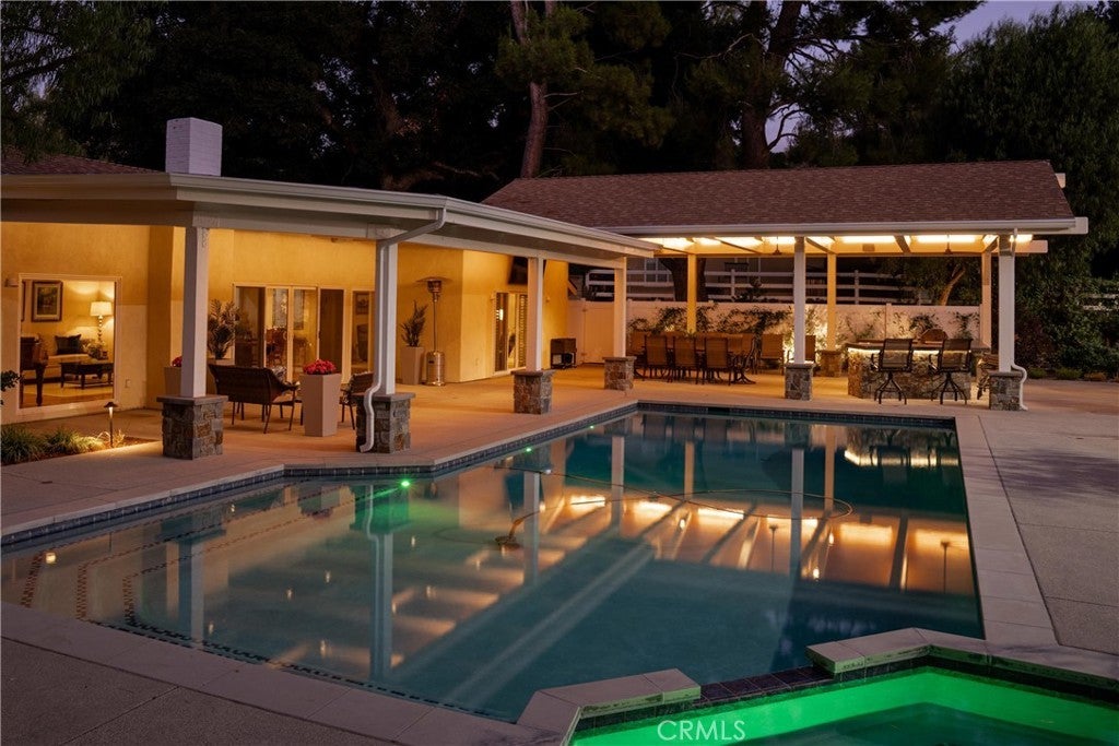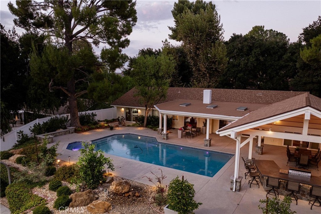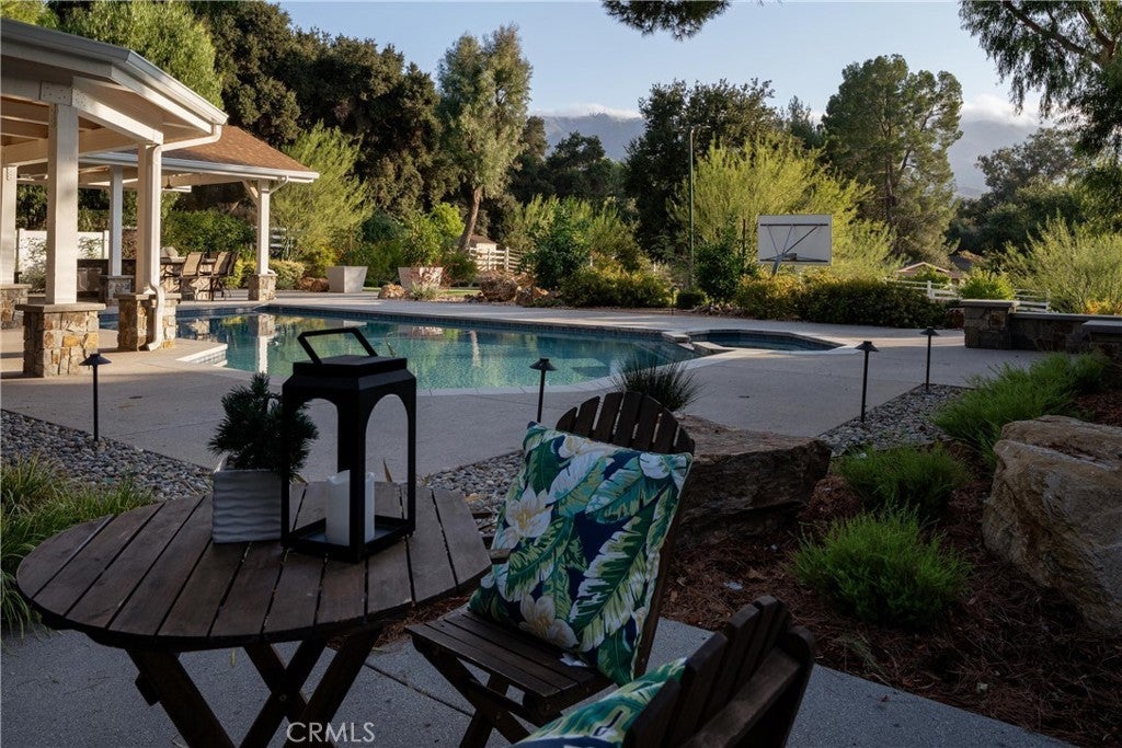 Single-Story Entertainer’s Dream home in Sand Canyon. The backyard is a true resort-style oasis with a sparkling pool and spa, oversized covered patio with skylights and commercial-grade lighting, 83” outdoor TV with sound system, masonry BBQ island, huge lawn, sports court, fruit trees, and mature trees for privacy. Perfect for entertaining or relaxing, this yard was designed to enjoy year-round. Designed with seamless California indoor-outdoor living in mind, this home offers an open floor plan with family and living rooms and the chef’s kitchen boasts granite counters, a farmhouse sink, tile backsplash, updated appliances, and pantry with pull-out shelving. The den features a custom-built entertainment center for added functionality. The expanded primary suite is a true retreat, featuring its own private patio with mountain views, a spacious sitting area, custom walk-in closet, and a spa-like bathroom with heated tile floors, dual vanities, a makeup station, jacuzzi tub, walk-in shower, and bidet-style toilet. Three additional bedrooms include custom closets and fresh finishes, while the remodeled guest bath offers new cabinetry, sinks, and a beautifully tiled shower enclosure. Major upgrades include a new Class A roof, 16 SEER HVAC, water heater, energy-efficient windows/doors, solid-core interior doors, crown/base moldings, updated flooring, new epoxy garage, and upgraded 200-amp electrical panel. A rare opportunity to own one of Sand Canyon’s premier homes!
