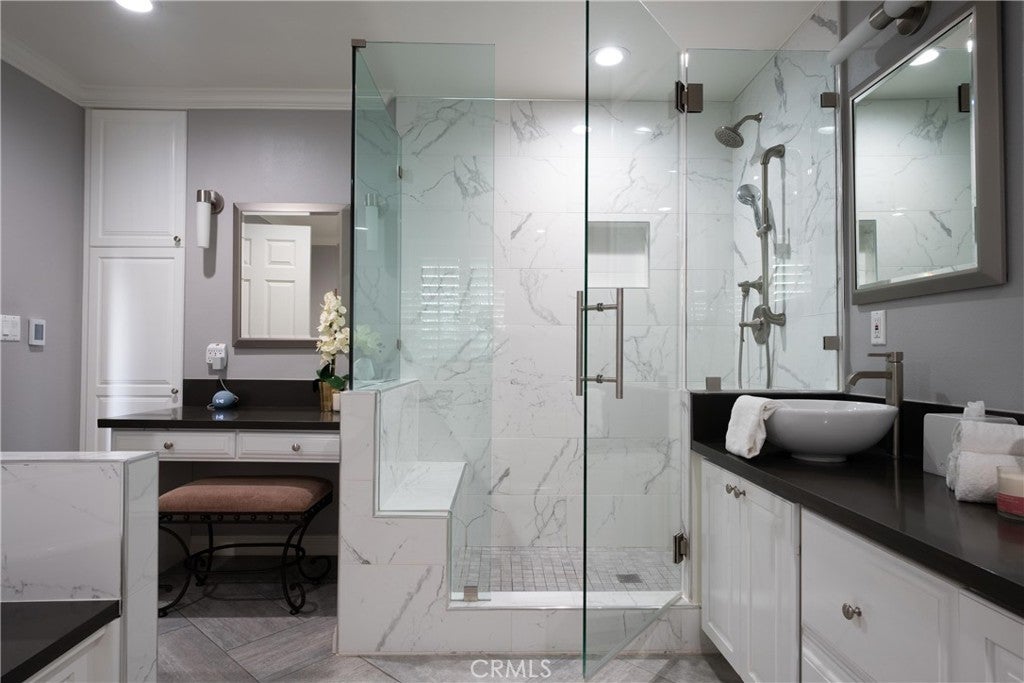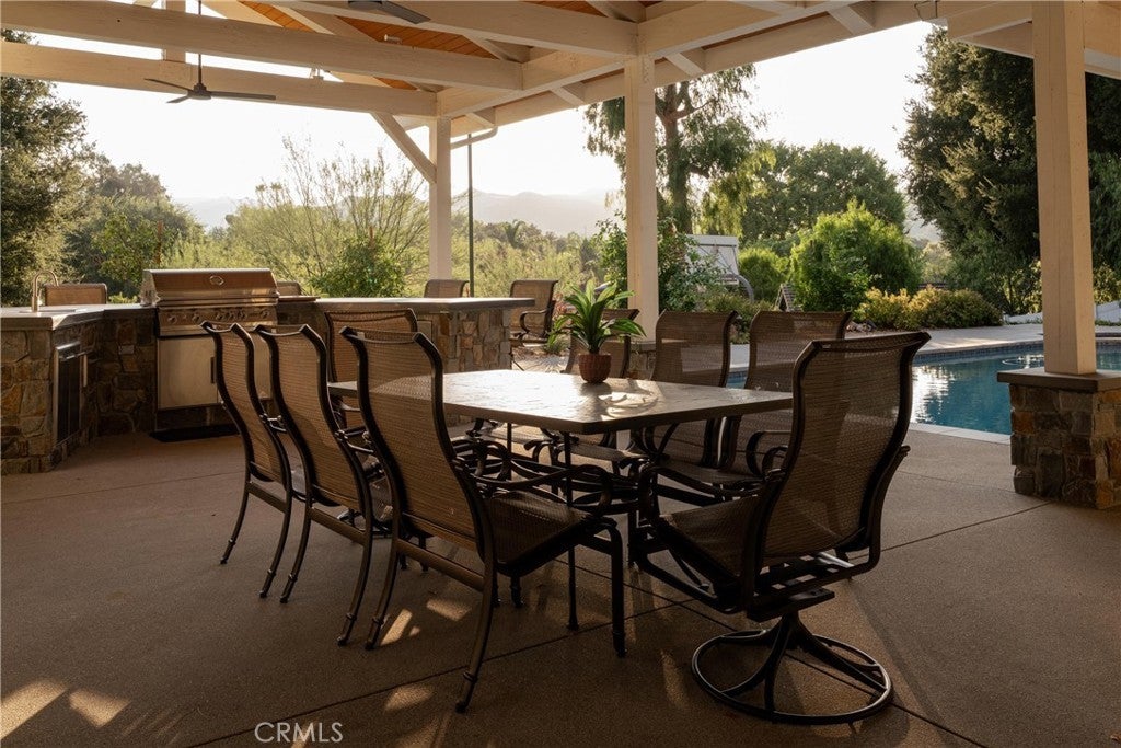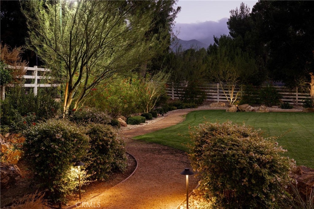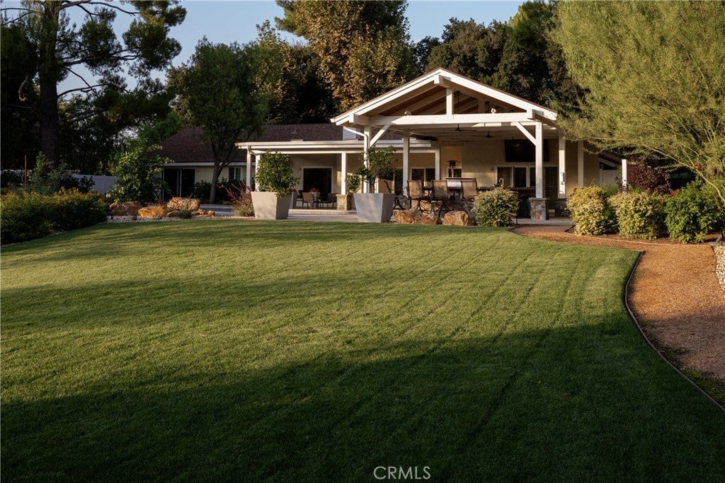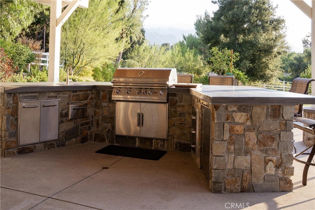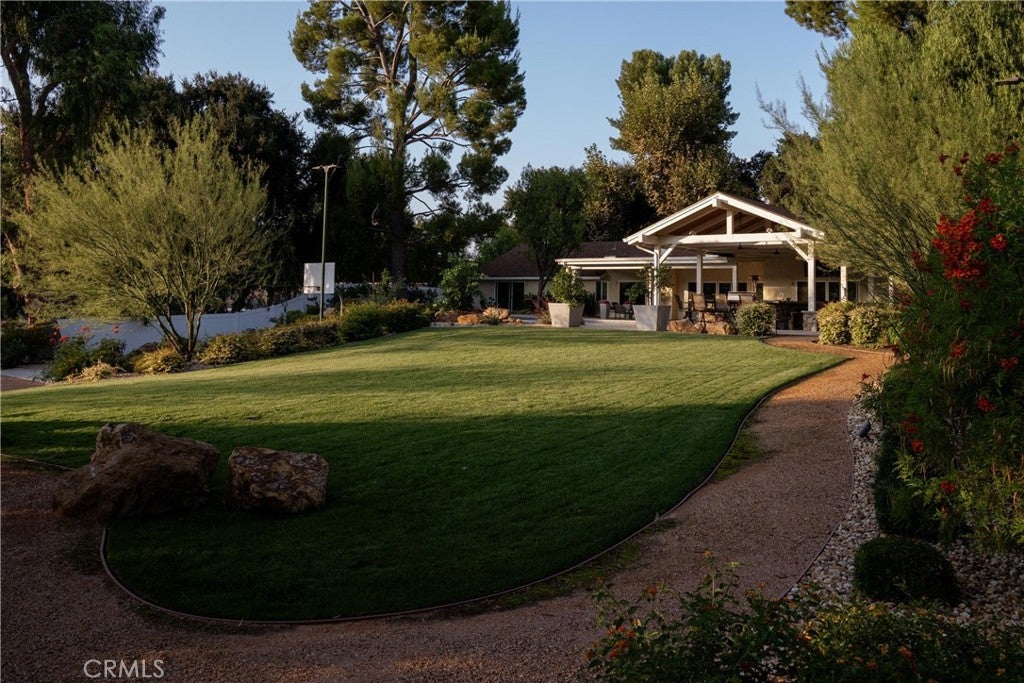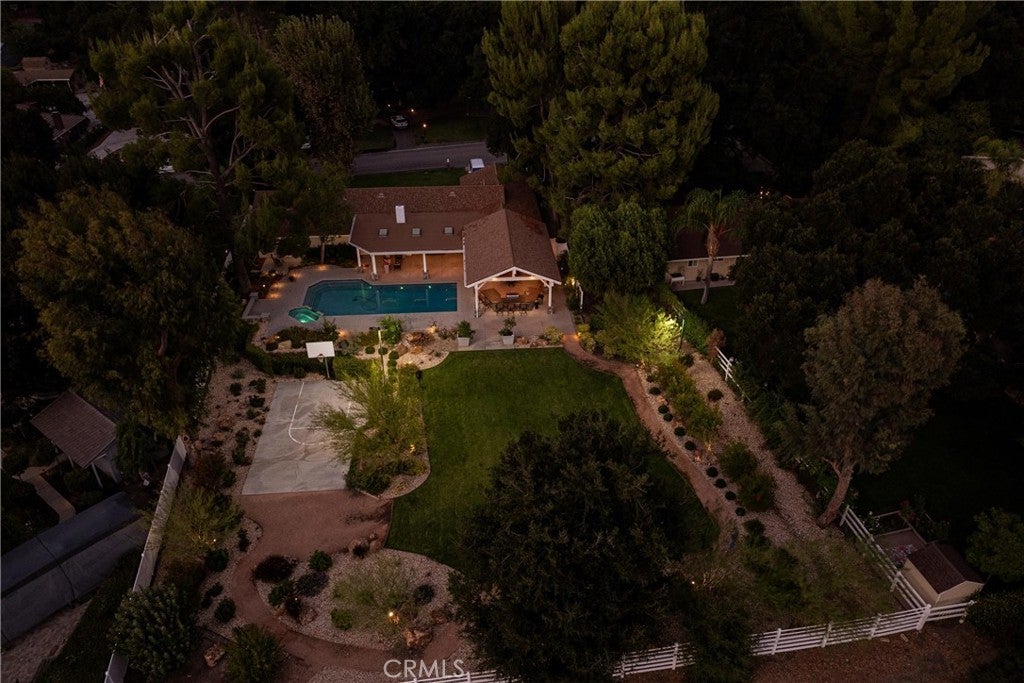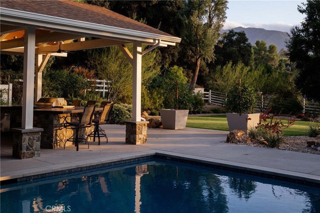 Single-Story Entertainer’s Dream home in Sand Canyon. The backyard is a true resort-style oasis with a sparkling pool and spa, oversized covered patio with skylights and commercial-grade lighting, 83” outdoor TV with sound system, masonry BBQ island, huge lawn, sports court, fruit trees, and mature trees for privacy. Perfect for entertaining or relaxing, this yard was designed to enjoy year-round. Designed with seamless California indoor-outdoor living in mind, this home offers an open floor plan with family and living rooms and the chef’s kitchen boasts granite counters, a farmhouse sink, tile backsplash, updated appliances, and pantry with pull-out shelving. The den features a custom-built entertainment center for added functionality. The expanded primary suite is a true retreat, featuring its own private patio with mountain views, a spacious sitting area, custom walk-in closet, and a spa-like bathroom with heated tile floors, dual vanities, a makeup station, jacuzzi tub, walk-in shower, and bidet-style toilet. Three additional bedrooms include custom closets and fresh finishes, while the remodeled guest bath offers new cabinetry, sinks, and a beautifully tiled shower enclosure. Major upgrades include a new Class A roof, 16 SEER HVAC, water heater, energy-efficient windows/doors, solid-core interior doors, crown/base moldings, updated flooring, new epoxy garage, and upgraded 200-amp electrical panel. A rare opportunity to own one of Sand Canyon’s premier homes!