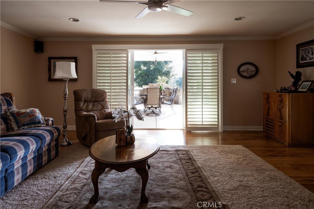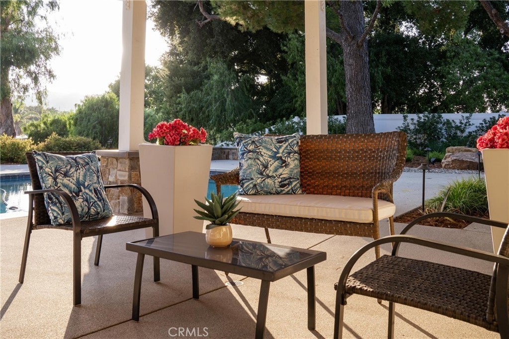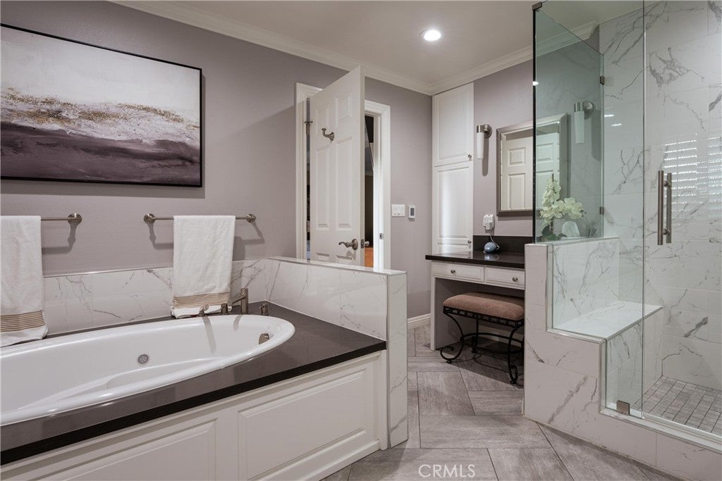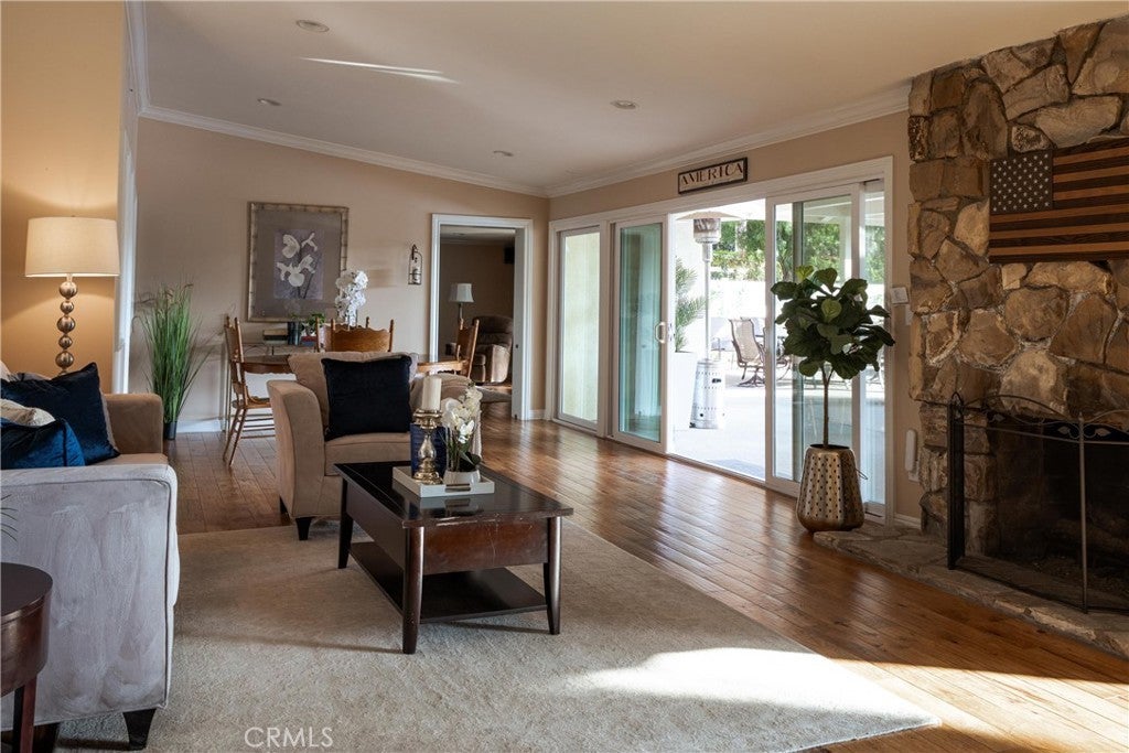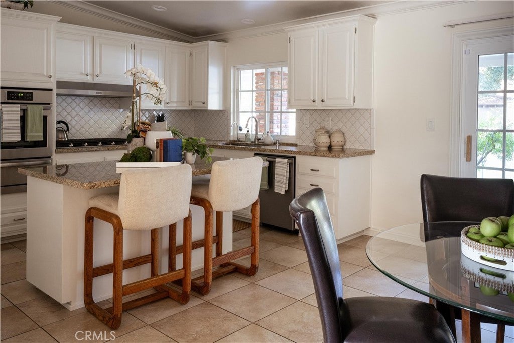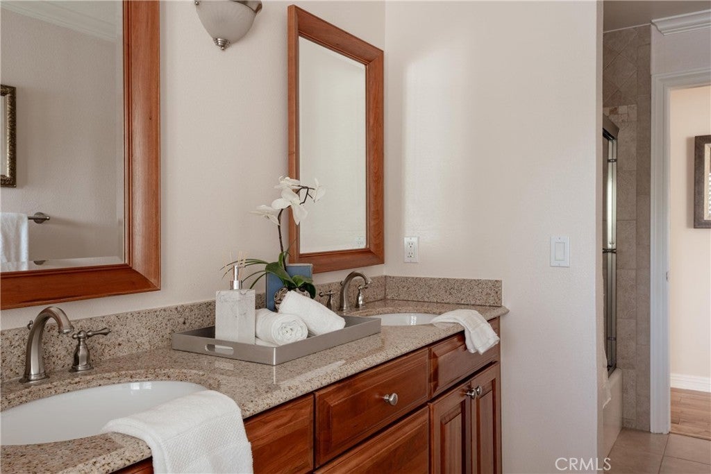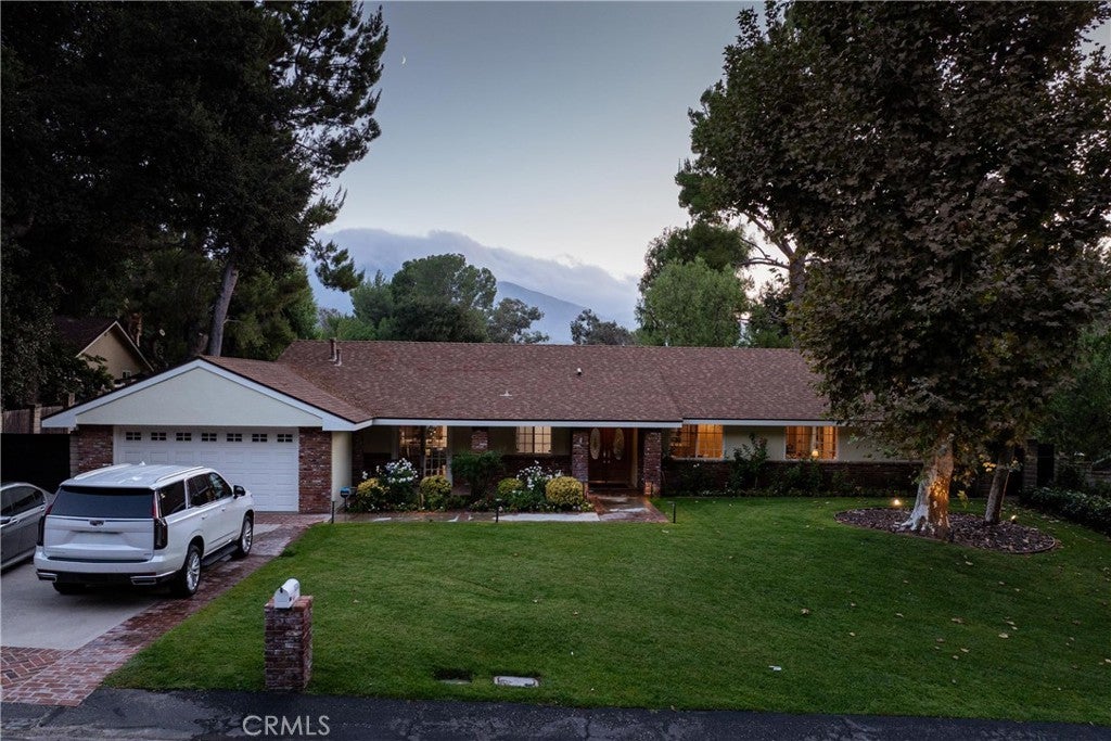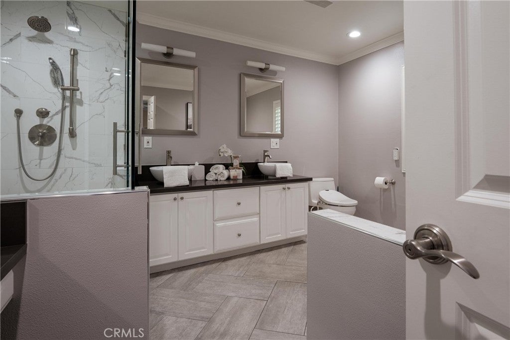 Single-Story Entertainer’s Dream home in Sand Canyon. The backyard is a true resort-style oasis with a sparkling pool and spa, oversized covered patio with skylights and commercial-grade lighting, 83” outdoor TV with sound system, masonry BBQ island, huge lawn, sports court, fruit trees, and mature trees for privacy. Perfect for entertaining or relaxing, this yard was designed to enjoy year-round. Designed with seamless California indoor-outdoor living in mind, this home offers an open floor plan with family and living rooms and the chef’s kitchen boasts granite counters, a farmhouse sink, tile backsplash, updated appliances, and pantry with pull-out shelving. The den features a custom-built entertainment center for added functionality. The expanded primary suite is a true retreat, featuring its own private patio with mountain views, a spacious sitting area, custom walk-in closet, and a spa-like bathroom with heated tile floors, dual vanities, a makeup station, jacuzzi tub, walk-in shower, and bidet-style toilet. Three additional bedrooms include custom closets and fresh finishes, while the remodeled guest bath offers new cabinetry, sinks, and a beautifully tiled shower enclosure. Major upgrades include a new Class A roof, 16 SEER HVAC, water heater, energy-efficient windows/doors, solid-core interior doors, crown/base moldings, updated flooring, new epoxy garage, and upgraded 200-amp electrical panel. A rare opportunity to own one of Sand Canyon’s premier homes!