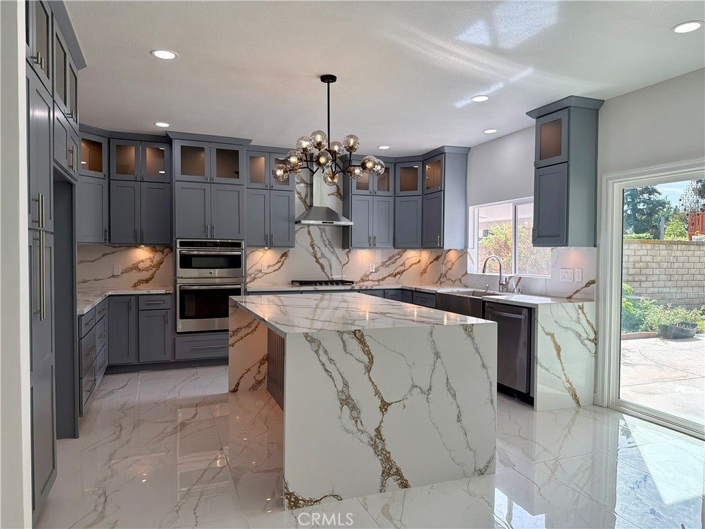 Tastefully remodeled 5-bedroom, 3.5-bath home in a private Northridge gated community. This spacious 3,864 sq. ft. residence features soaring ceilings, brand new porcelain and luxury vinyl flooring, fresh paint, recessed lighting, and three fireplaces. The chef’s kitchen showcases quartz counters, a dramatic waterfall island, stainless steel appliances, 5-burner gas stove, dual ovens, farmhouse sink, wine rack, and cabinet lighting. The luxurious primary suite offers vaulted ceilings, a fireplace, and a completely remodeled spa-like bath with dual vanities, walk-in shower, jetted soaking tub, and walk-in closet. Additional highlights include a versatile downstairs bedroom with en-suite bath, loft with wet bar, covered patio, outdoor kitchen, play area, and 3-car garage. Conveniently located near CSUN, Sherwood Forest, shopping, dining, and major freeways.