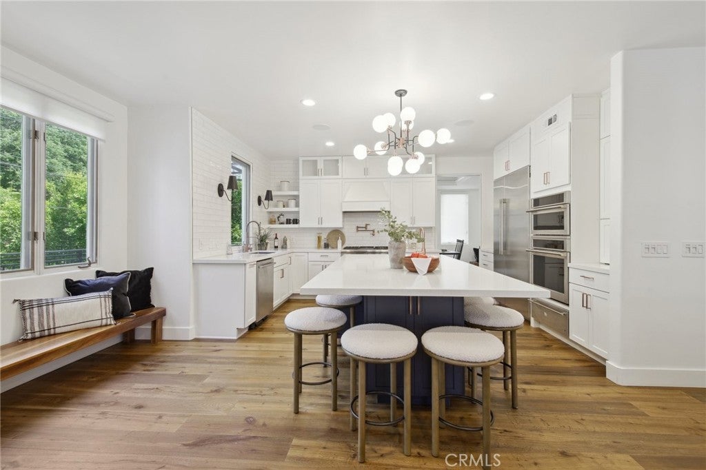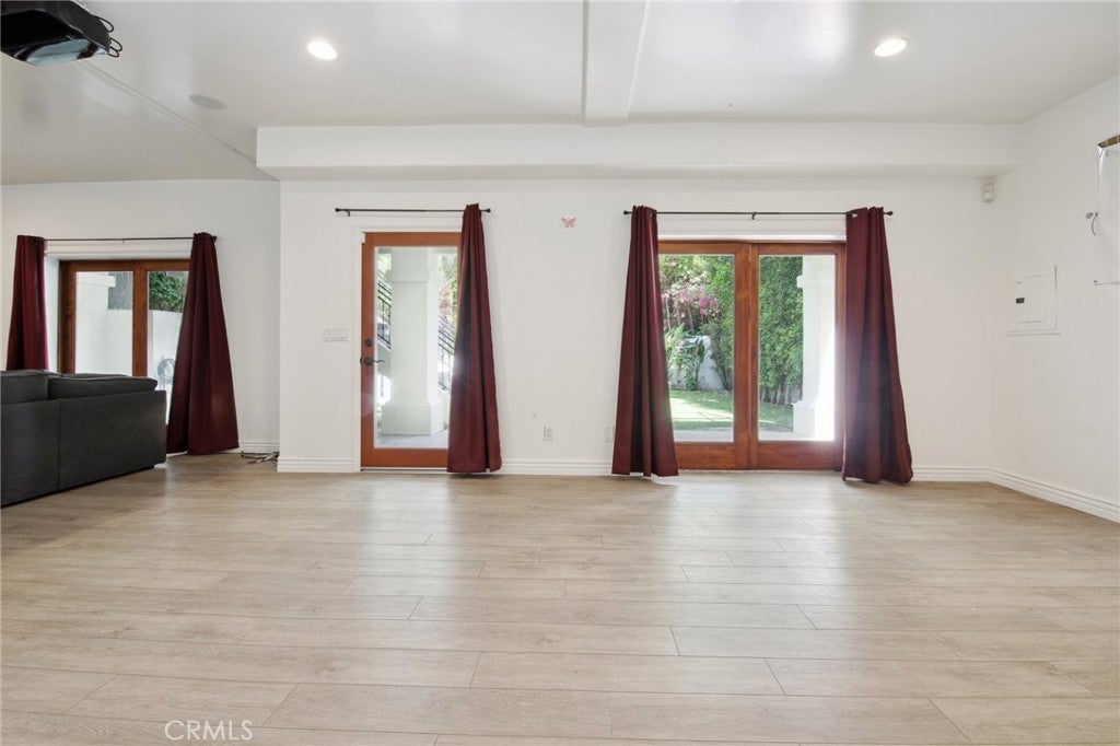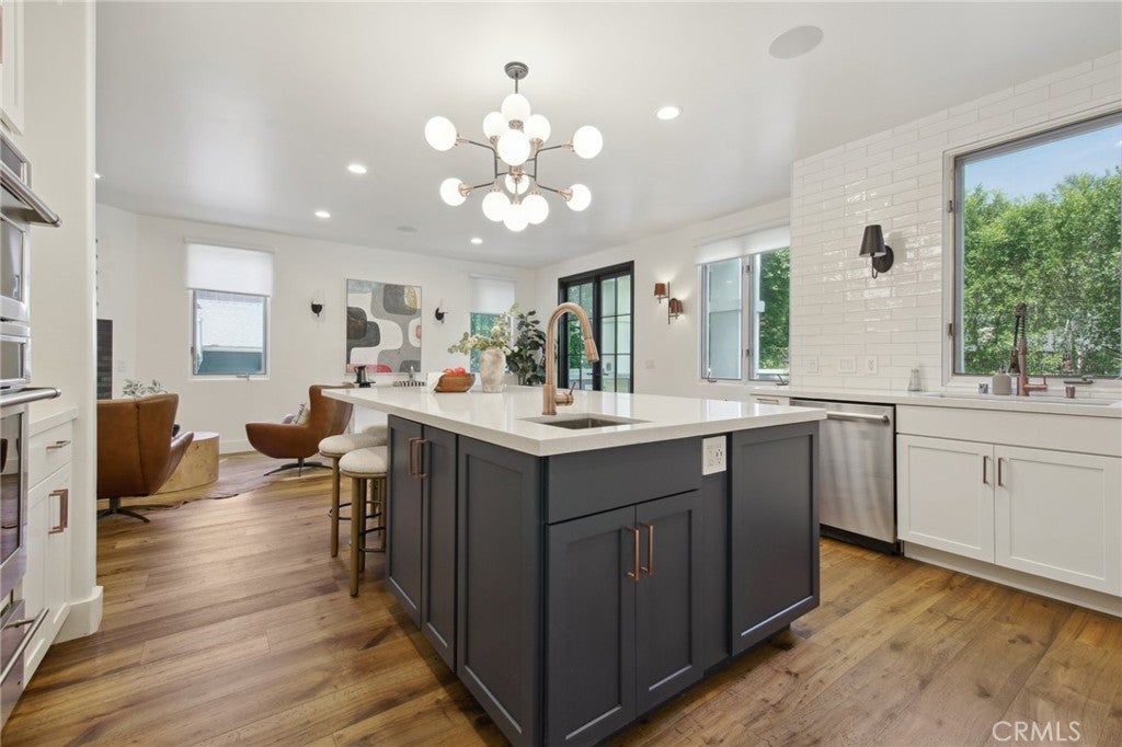 One of a kind Studio City home with over 4,600 sq.ft. of living space. Entry foyer leads to a lovely living room with a cozy fireplace and beautiful wood flooring (installed throughout the house in 2020). The chef’s kitchen was renovated in 2021 with Monogram and Bosch stainless steel appliances, custom cabinetry and an oversized island with breakfast bar and prep sink. It opens to the family room with a fireplace and has a Sonos ceiling speaker system. All of the gorgeous French doors on the main level were installed in 2021. Other main floor features include a large formal dining room, wonderful den, guest bedroom with a full bath and a laundry room. There are 2 patios (redone in 2021) on the main floor, one off the living room, the other opens from both the dining room and the kitchen/family room. It includes a full outdoor kitchen with 30” natural gas griddle, BBQ, Big Green Egg Smoker, refrigerator, sink and storage plus outdoor Bluetooth Sonos speakers. The spacious primary suite has an amazing en-suite bath (redone in 2021) with heated floors, a Mr. Steam shower system with audio, and an oversized spa tub with 30 hydro and air massage jets. Additionally there is a fireplace, a large walk in closet and a balcony. Other upstairs rooms include 3 additional bedrooms (one with en-suite bath and the other two are Jack and Jill bedrooms with a shared bath. The lower level projection TV room has a 10’ screen and projector and a wet bar. It opens to the lovely backyard making it perfect for indoor/outdoor entertaining. The house has solar panels (paid for) on the roof. There is also a large storage room and additional storage in the 3 car garage (one side is tandem). This magnificent home is located near wonderful dining and shopping at the Sportsmen’s Lodge complex, close to great schools like Harvard Westlake upper campus and has easy access to all canyons and freeways.