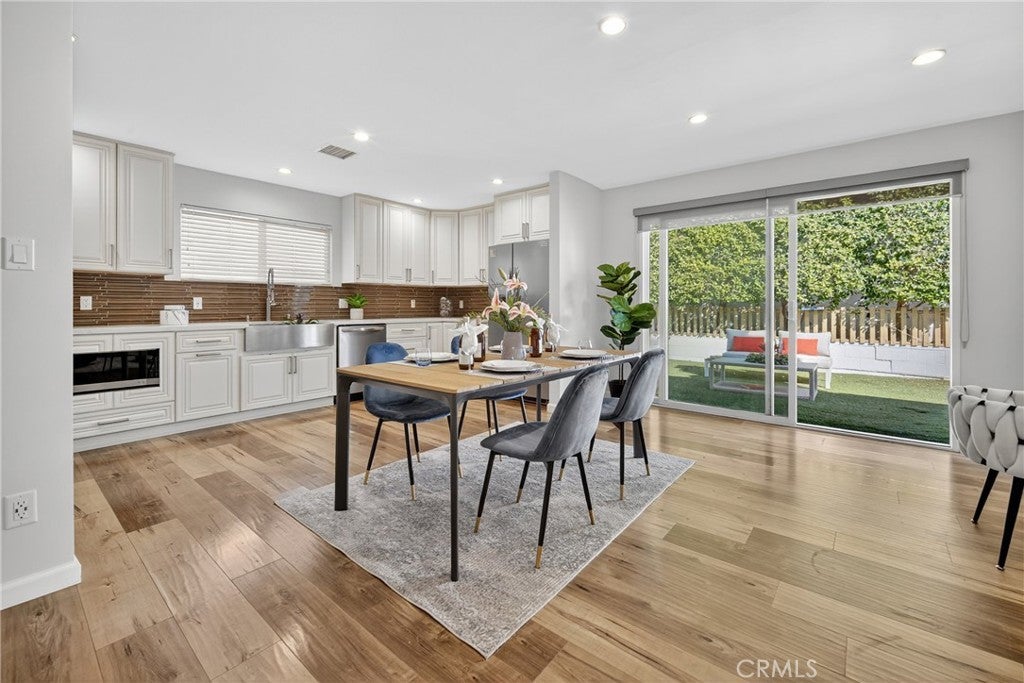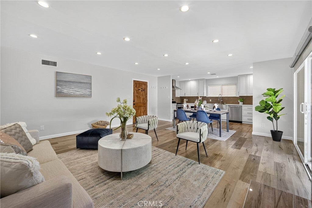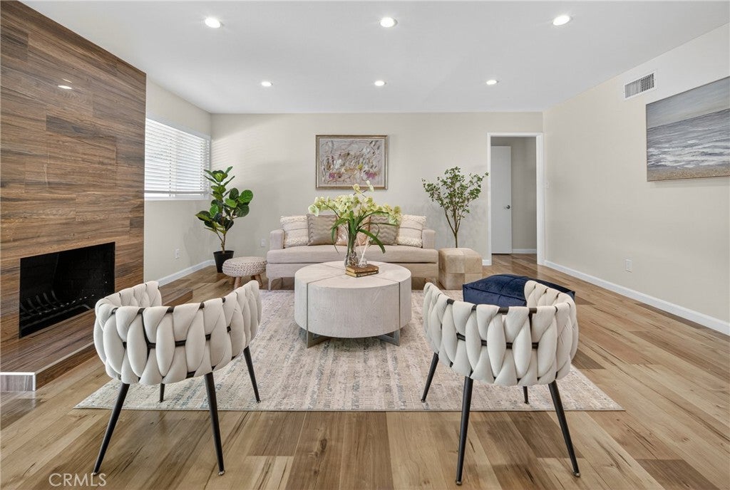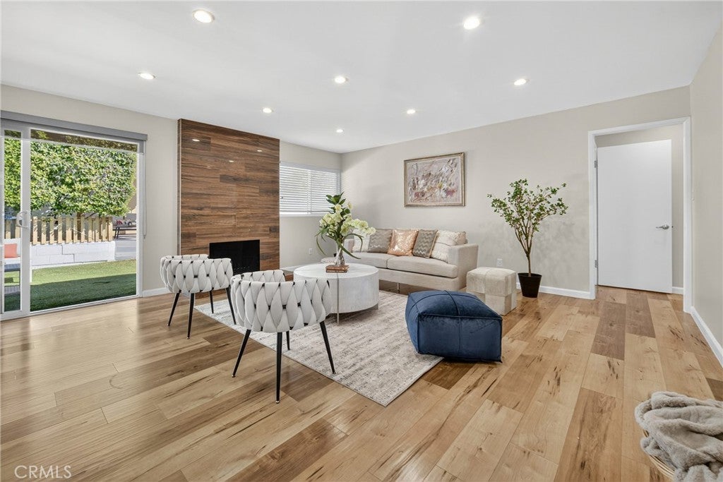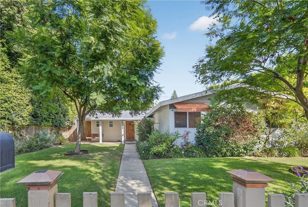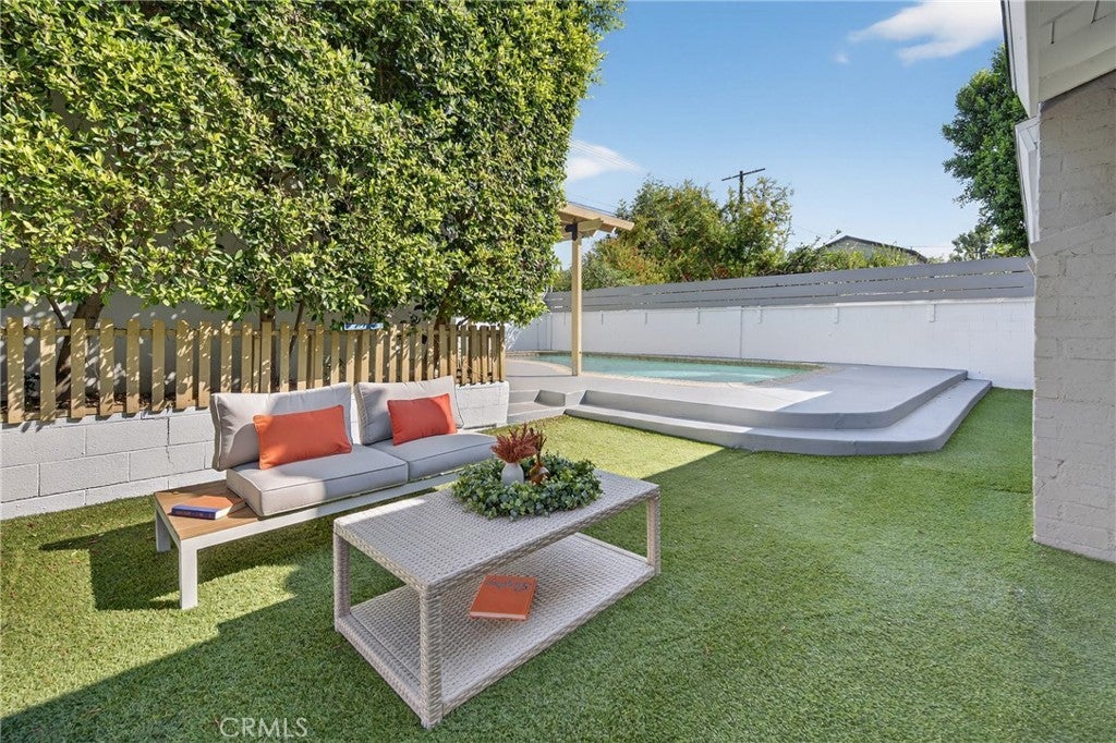 Tucked within a quiet West Hills neighborhood, this picture-perfect West Hills home blends midcentury appeal with modern sophistication. Framed by a classic picket fence, mature trees, and lush landscaping, the home’s inviting curb appeal leads to a covered front porch and an open, sun-filled floorplan designed for comfort and connection. Inside, wide-plank wood flooring flows through the main living spaces, complemented by recessed lighting and dual-pane windows and doors that enhance natural light throughout. The spacious living room centers around a sleek, floor-to-ceiling tiled fireplace, lending a warm, contemporary touch. The spacious kitchen delights with white cabinetry, quartz countertops, stainless-steel appliances, a farmhouse sink, and a modern glass tile backsplash—all part of the seamless great room for effortless entertaining. Sliding glass doors reveal a private backyard oasis featuring an inviting pool surrounded by a wraparound concrete patio, a covered porch area perfect for shaded lounging or outdoor dining, and a low-maintenance faux grass lawn. The primary suite offers serene pool views through a second sliding glass door that also offers direct backyard access, and a beautifully appointed full en-suite bathroom with a dual-sink vanity. Three additional bedrooms share a stylish full hall bath with modern finishes. A two-car garage accessed from the rear alley provides added convenience. Conveniently located near top-rated local parks, shopping, and dining destinations at Fallbrook Center and The Village at Topanga, with easy access to major thoroughfares including Topanga Canyon Blvd and Sherman Way.