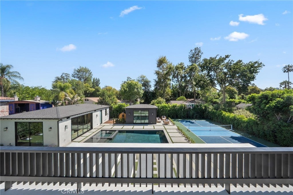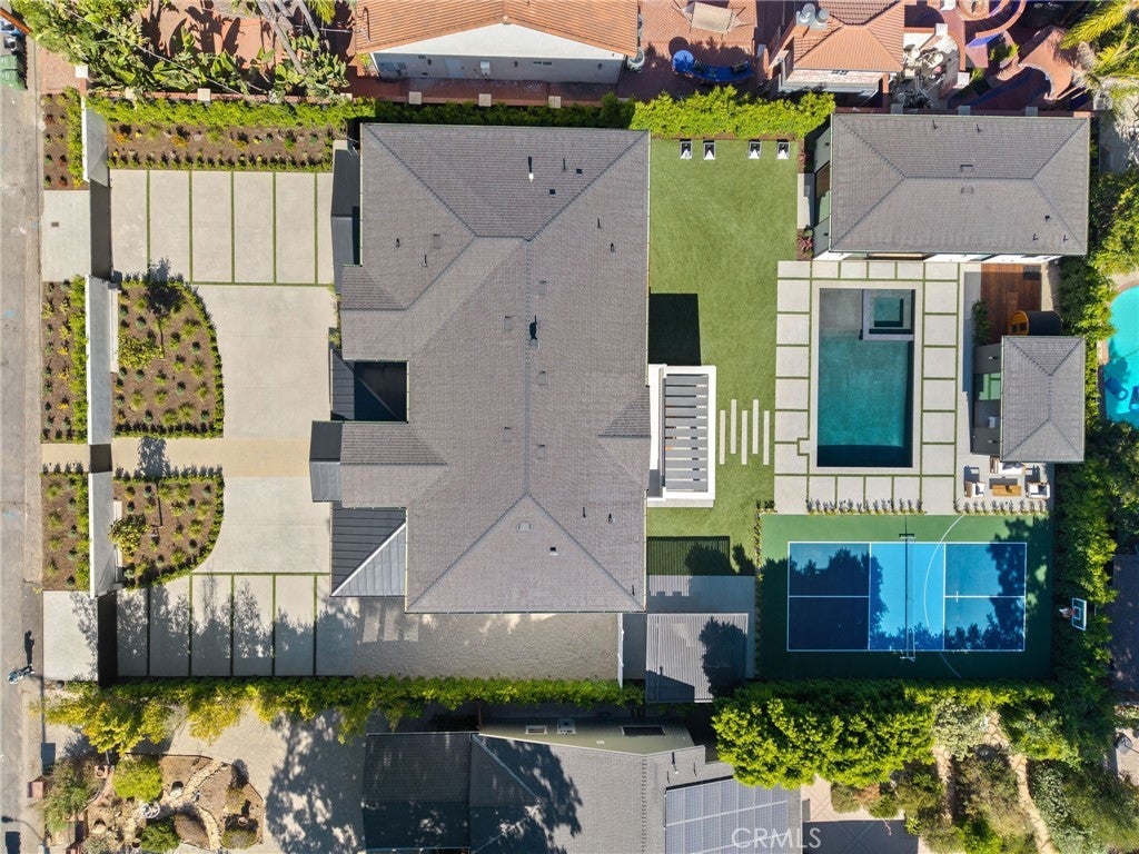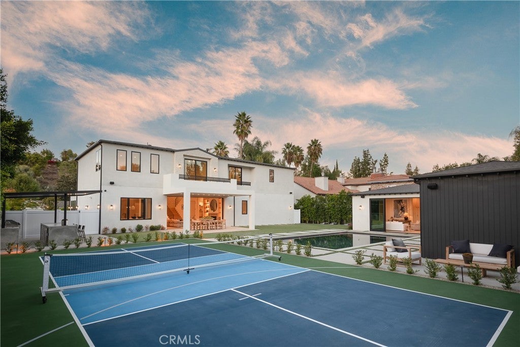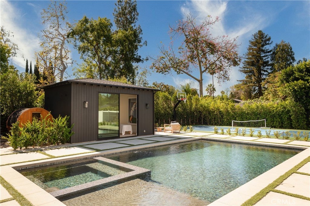 This distinguished gated estate is situated in Woodland Hills, Walnut Acres, on a tranquil street. The recently constructed luxury property encompasses 6,418 square feet of living space on an 18,338-square-foot lot, ideal for entertaining. The main residence features 5,369 square feet, including five bedrooms with en-suite bathrooms, a guest bathroom, an office, a theater room, and laundry facilities on both levels. The property also offers stunning balcony views from the primary suite and family room. Additionally, it includes an 830-square-foot guest house with a spacious bedroom, en-suite bathroom, full kitchen, and laundry facilities. The expansive backyard is designed for gatherings and features a 219-square-foot detached gym, sauna, sports court, pickleball court, and a covered outdoor barbecue area, perfect for hosting events.
