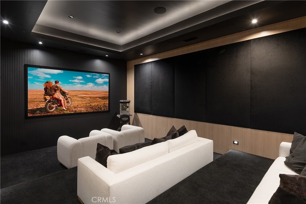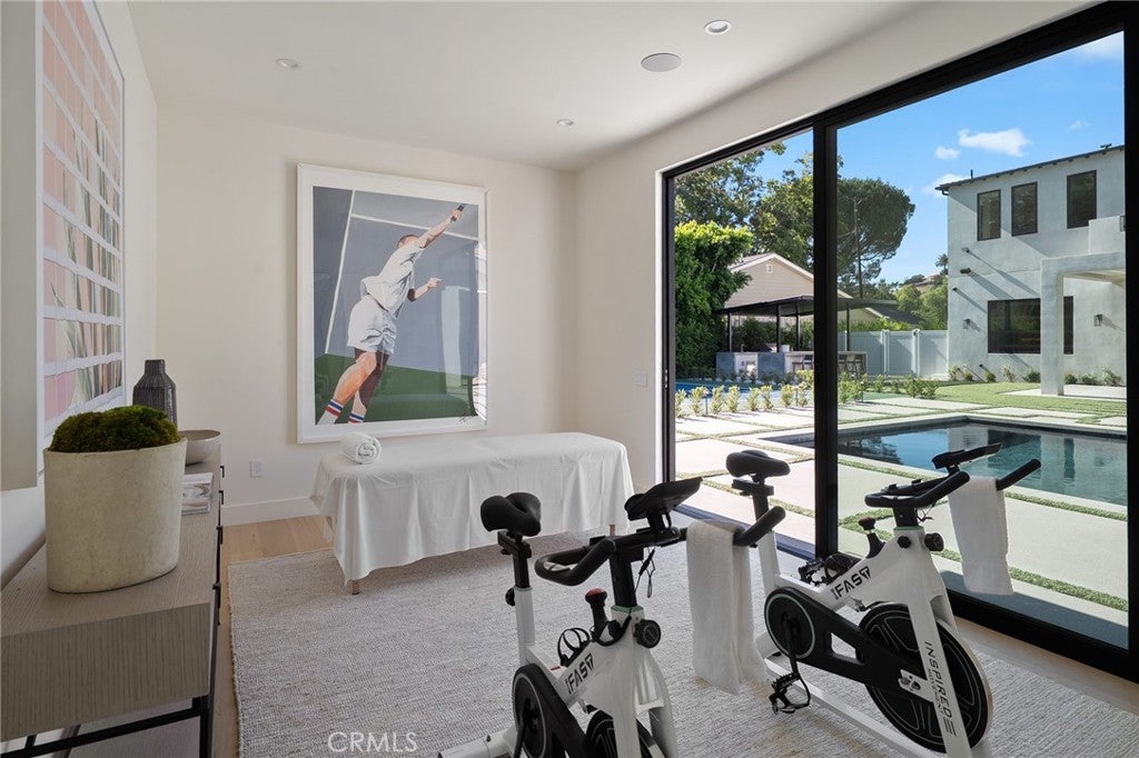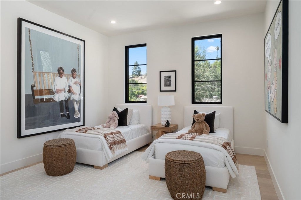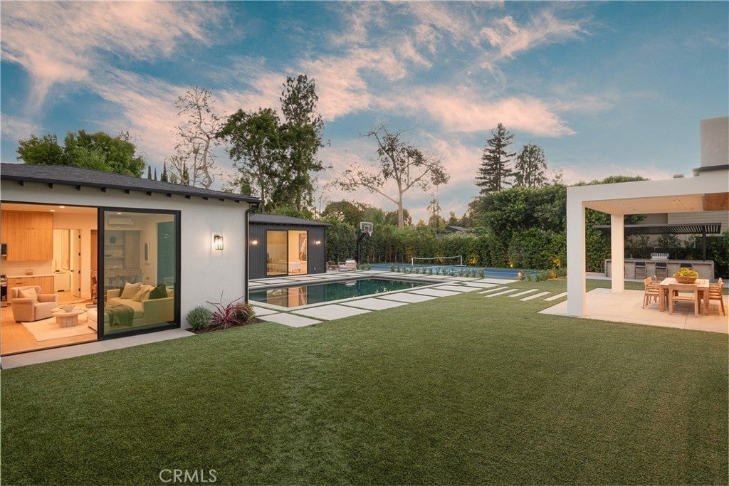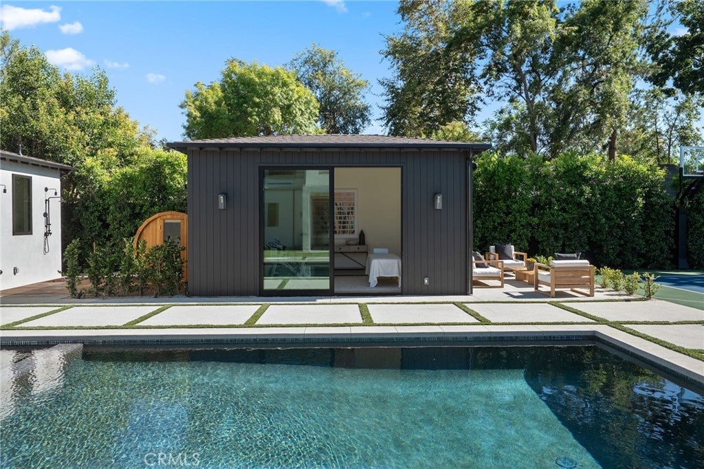 This distinguished gated estate is situated in Woodland Hills, Walnut Acres, on a tranquil street. The recently constructed luxury property encompasses 6,418 square feet of living space on an 18,338-square-foot lot, ideal for entertaining. The main residence features 5,369 square feet, including five bedrooms with en-suite bathrooms, a guest bathroom, an office, a theater room, and laundry facilities on both levels. The property also offers stunning balcony views from the primary suite and family room. Additionally, it includes an 830-square-foot guest house with a spacious bedroom, en-suite bathroom, full kitchen, and laundry facilities. The expansive backyard is designed for gatherings and features a 219-square-foot detached gym, sauna, sports court, pickleball court, and a covered outdoor barbecue area, perfect for hosting events.