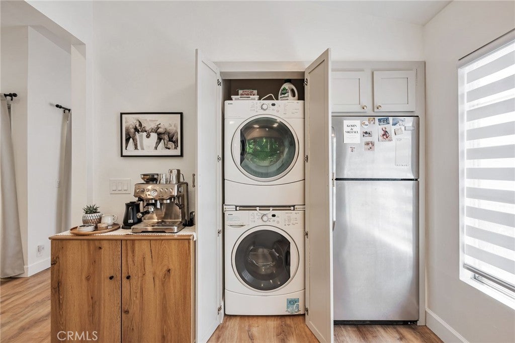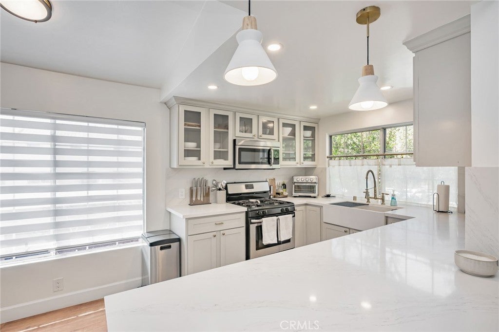 Las Virgenes school district location! Beautifully remodeled single-level condo featuring 1 bed + 1 bath and 977 sq. ft. of stylish living space. The open floor plan offers a bright living room with a stone fireplace, custom blinds, and luxury vinyl flooring. The modern kitchen includes quartz countertops, stainless-steel appliances, and an in-unit washer & dryer. Enjoy a private balcony, spacious bedroom with walk-in closet, and a spa-inspired bath with dual-sink quartz vanity and frameless glass shower. Additional features include a private 1-car garage, assigned parking, and access to two pools, spas, saunas, clubhouses, and walking paths. Water is included in the monthly HOA. Conveniently located near hiking trails, shopping, dining, Malibu Canyon, award-winning schools, Pepperdine University, and Malibu beaches. Experience Calabasas living at its finest!
