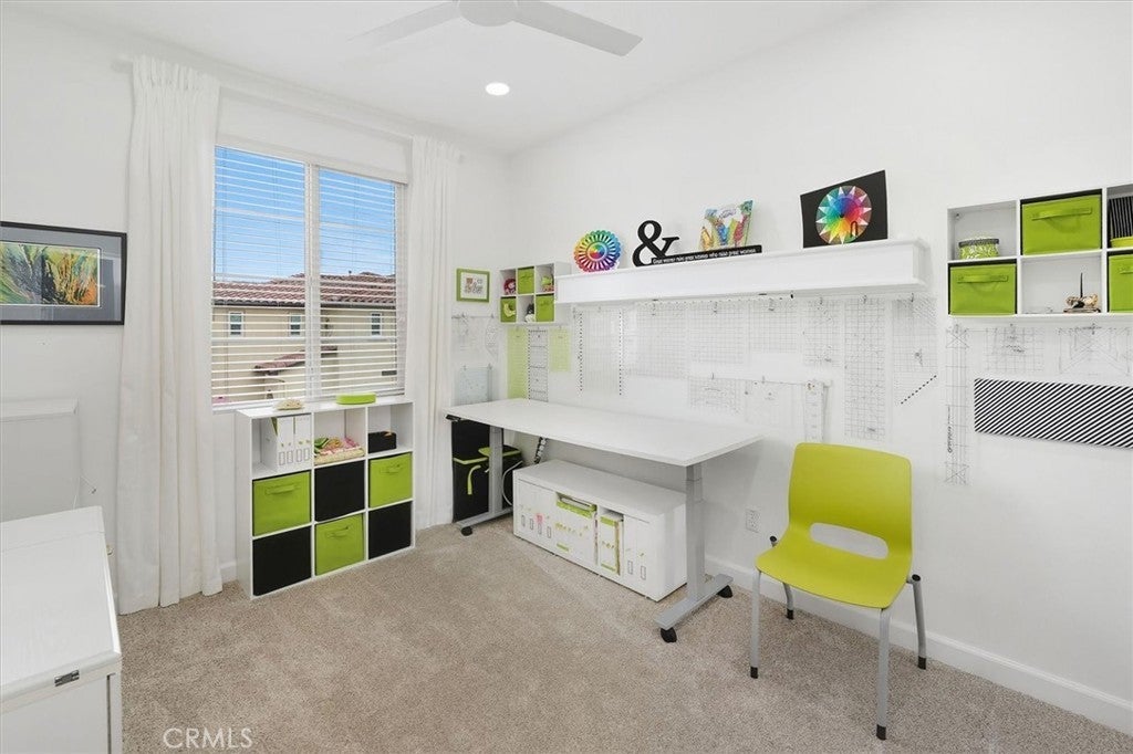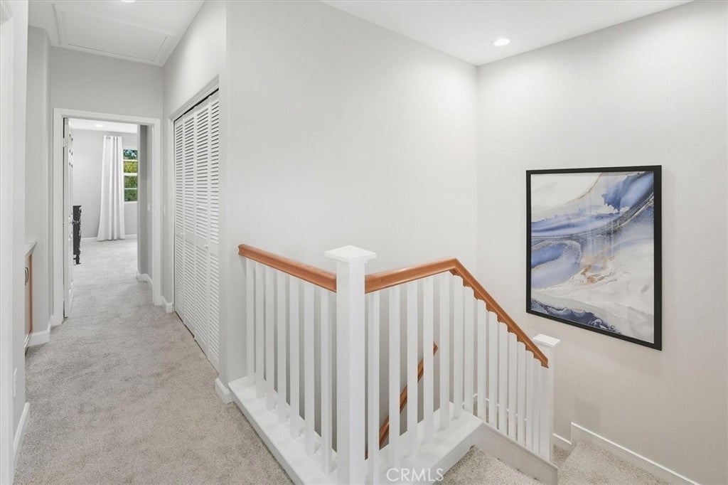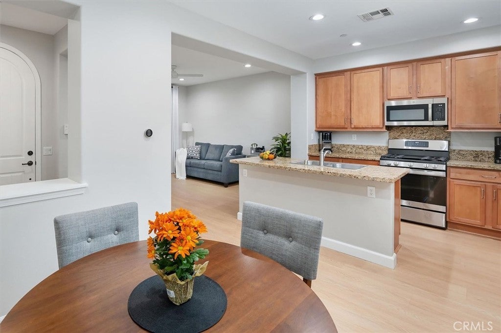 Welcome home to this stunning and HIGHLY UPGRADED 3-bedroom, 2.5-bath turnkey townhome in the sought-after West Creek community of Valencia. Flooded with natural light, this beautifully updated home showcases new SPC waterproof insulated flooring with new baseboards, LED recessed lighting with dimmers, fresh paint, and Hunter Douglas bottom-up/top-down window shades. The open-concept kitchen is a chef’s dream, featuring recently upgraded appliances—including a range with air-frying, griddle features, and convection oven—along with a newer garbage disposal, ample cabinetry, and generous counter space. A stylish powder room with quartz countertop, new Moen Voss Fixtures & lighting, Kohler under mount sink and a custom-painted vanity with new hardware completes the main level. Upstairs, you’ll find recently installed fresh carpet throughout. The spacious primary suite offers amazing views of the hills and trees and boasts a stunning board-and-batten accent wall, ceiling fan with light and remote with an en-suite bath featuring quartz countertop, new Kohler under-mount sinks, Moen Voss faucets & light fixtures, updated accessories, and a Kohler bidet toilet seat. Two additional bedrooms include ceiling fans and mirrored closet doors, with a full bathroom nearby offering its own custom-painted vanity with LED lighting, upgraded hardware, Kohler under mount sinks, and quartz countertop. The convenient upstairs laundry area includes added cabinetry for extra storage, and the hallway cabinets feature upgraded quartz countertop. The attached two-car garage has been finished with epoxy flooring, custom cabinets, drywall, and overhead lighting. An alarm system in place as well as a ring doorbell offers peace of mind. Outside, enjoy relaxing on your inviting front porch with upgraded LED lighting and an outdoor outlet, overlooking a spacious grassy quad—perfect for kids or evening strolls. Residents of West Creek enjoy resort-style amenities, 3 pool sites with spa and a clubhouse, beautiful greenbelts, parks, paseos, and organized family activities like movie nights and glow dance parties, all within close proximity to top-rated schools, shopping, and dining. Don’t miss this rare opportunity to own a move-in-ready home in one of Valencia’s most desirable communities!