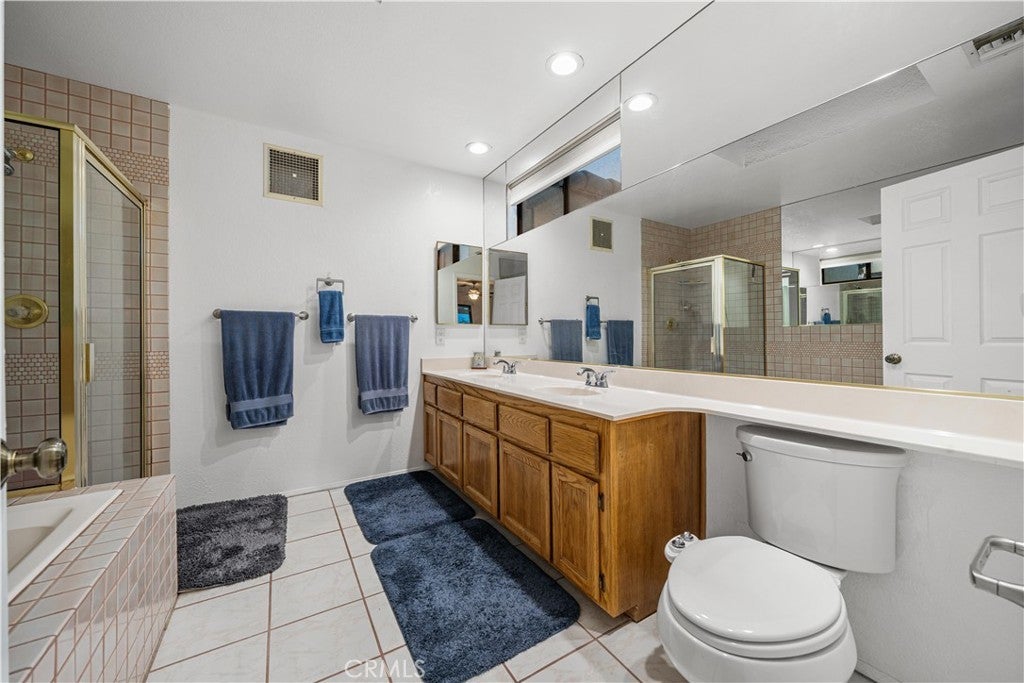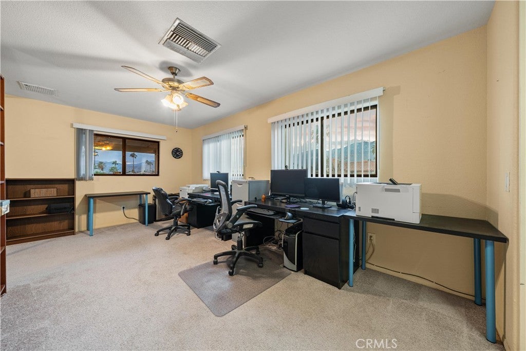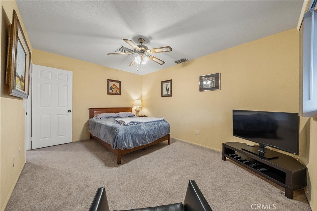 Welcome to this spacious two-story home offering approximately 2,641 square feet of comfortable living space, complete with a three-car garage and RV parking with dedicated power and concrete pad. This three-bedroom, two and one-half bath residence also includes a versatile bonus hobby room or office, ideal for work or creative projects. The open layout features a living room with cathedral ceilings, fireplace, along with a separate family room with fireplace and patio access. The kitchen includes solid hardwood cabinetry with pull-outs and reverse osmosis drinking water. The primary suite offers a walk-in closet, ceiling fan, dual sinks, soaking tub, separate shower, and private balcony showcasing beautiful mountain views. Additional comforts include ceiling fans in all bedrooms, ample storage throughout, and a well-appointed laundry room with utility sink and pet door. The backyard is an entertainer's dream with heated pool and spa, Alumawood patio covers on both levels, Kool Deck surfacing, gas BBQ hookup, privacy hedges, lawn, rose garden, and a large storage shed. Energy efficiency shines with 6 KW owned solar panels, evaporative coolers on both levels and recent upgrades including newer HVAC systems, tile roof underlayment, pool pebble-tec finish, updated pool equipment, water heater, and refurbished evaporative coolers. A prime opportunity to enjoy comfort, space, and outdoor living in a well-maintained home.
