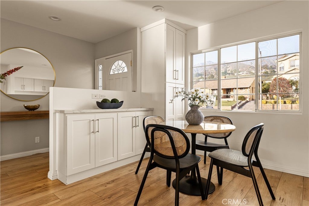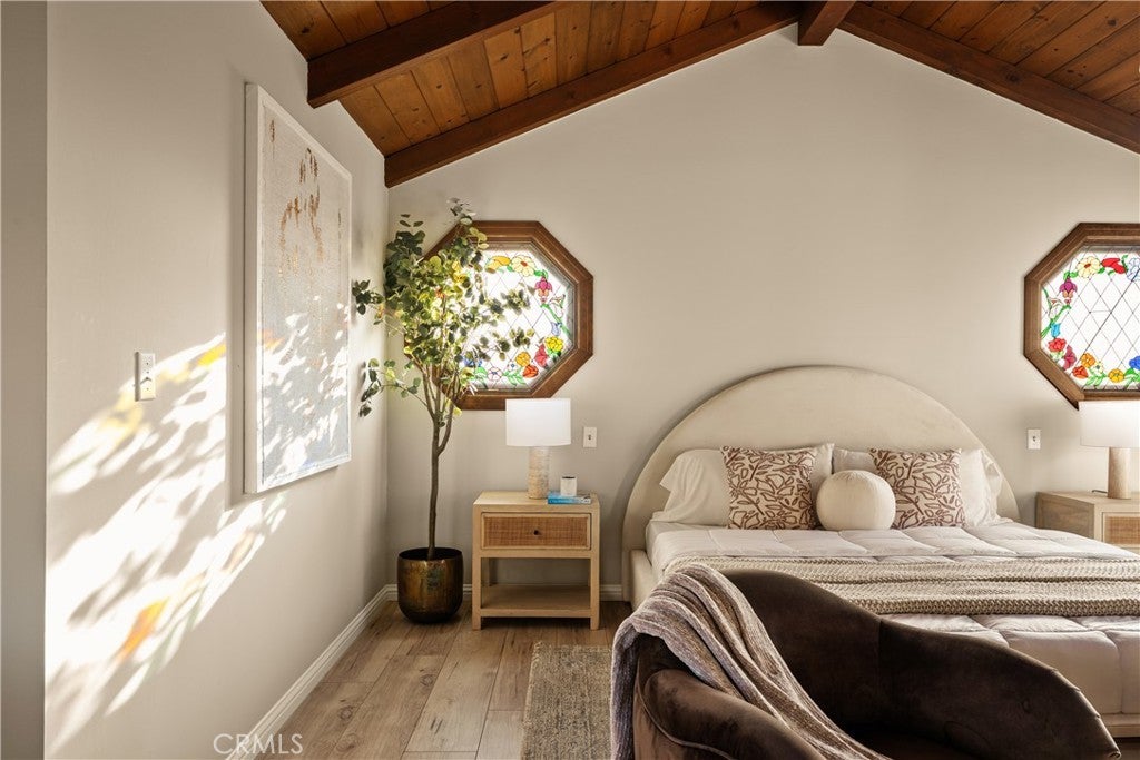 Nestled on a peaceful, tree-lined street in the coveted Burbank foothills, this timeless Ben Mar residence blends classic California charm with thoughtful modern updates. Lovingly maintained and upgraded over five decades, this four-bedroom, two-bath home radiates warmth and comfort from the moment you arrive. Inside, natural light pours across wide-plank wood floors, guiding you through the connected living and dining room—each designed for effortless flow and everyday gathering. A stately fireplace anchors the living space, complemented by curated modern finishes and serene mountain views through expansive windows. The reimagined kitchen is a showpiece of functionality and design, featuring shaker cabinetry, quartz counters, brass hardware, and stainless steel appliances. A cozy breakfast nook captures morning sunlight and frames picturesque foothill views. Upstairs, the primary suite feels like a private retreat beneath soaring wood-beam ceilings. Unique stained-glass windows add character, while the updated ensuite bath dazzles with marble-style tile, a walk-in rain shower, and elegant brass accents. Step out to your private balcony and enjoy sweeping sunset views over the valley. The backyard is perfect for entertaining, complete with a spacious covered patio, built-in BBQ kitchen, and lush surroundings ideal for alfresco dining. Recent upgrades include a new roof, copper plumbing, vinyl and aluminum windows, and central air and heat for year-round comfort. Located moments from hiking trails, top-rated schools, and the heart of Burbank’s dining and entertainment scene, 1819 Richard Street offers the best of foothill living—classic, comfortable, and beautifully renewed.