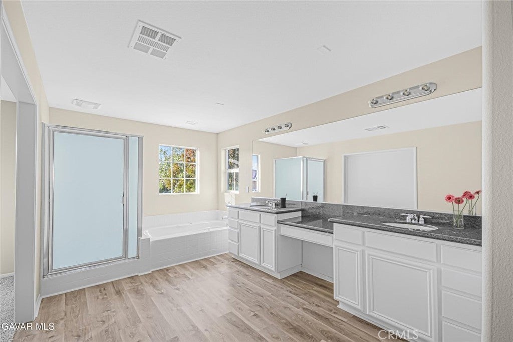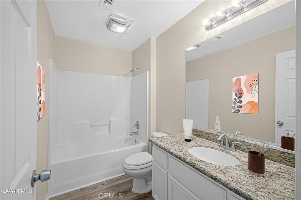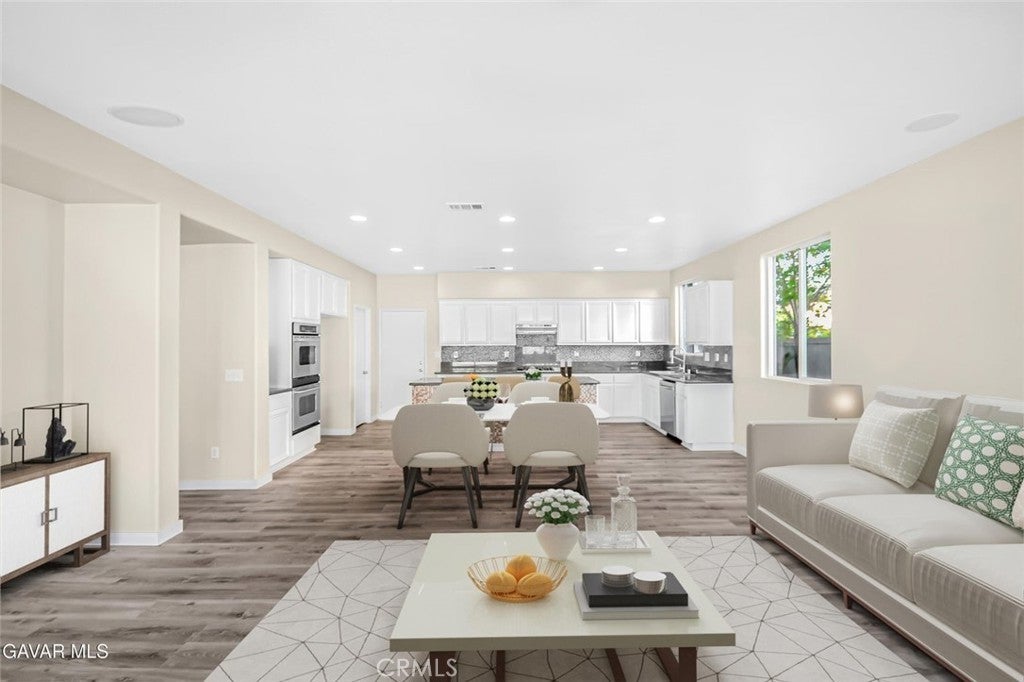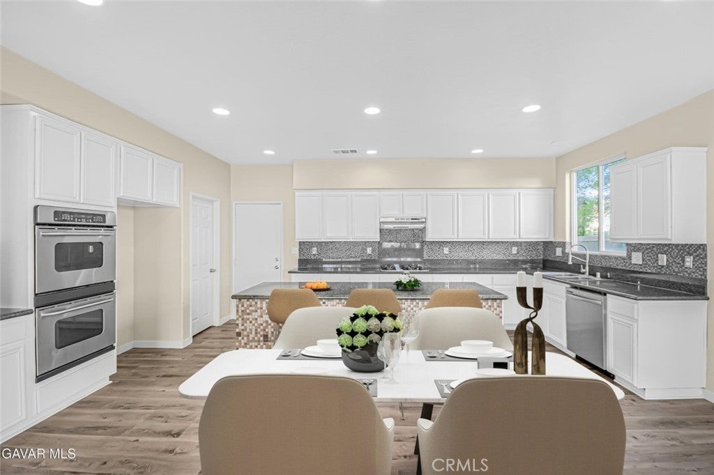 This stunning West Palmdale home offers over 4,000 square feet of beautifully renovated living space, showcasing full new interior and exterior paint that gives it a fresh and modern feel. Step inside to find new vinyl flooring throughout the entire downstairs and brand new carpet in all bedrooms, paired with updated light fixtures and new plumbing fixtures that add comfort and style. The kitchen is truly impressive with granite countertops, a custom tile backsplash, new stainless steel dishwasher and hood, built-in cooktop and oven, a stainless steel sink, and a large walk-in pantry—perfect for any home chef. The home features two spacious living areas, a formal dining room, and a loft pre-wired for surround sound, ideal for entertaining or relaxing. One bedroom and full bathroom are conveniently located downstairs, while an upstairs secondary bedroom offers its own ensuite bath. The primary suite is expansive with dual closets, a dual-sink vanity, separate shower and tub, a bonus room that can serve as a nursery, gym, or office, plus a cozy fireplace and direct access to the laundry room. The property also features central heat and air with dual zones, a three-car garage, and custom front and back landscaping. The easy-care backyard includes plenty of concrete and custom design work, perfect for gatherings or low-maintenance outdoor living. Located in a prime West Palmdale neighborhood, this home is within walking distance to Highland High School and near parks, shopping, restaurants, the Antelope Valley Mall, and freeway access. Come see this rare offering today—move-in ready and waiting for you to call it home.