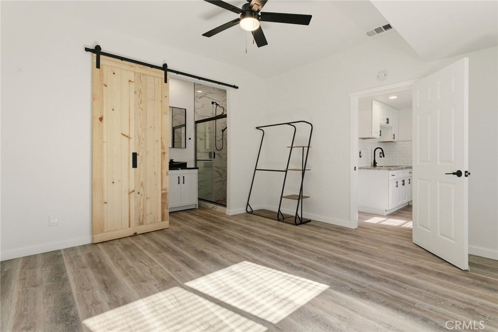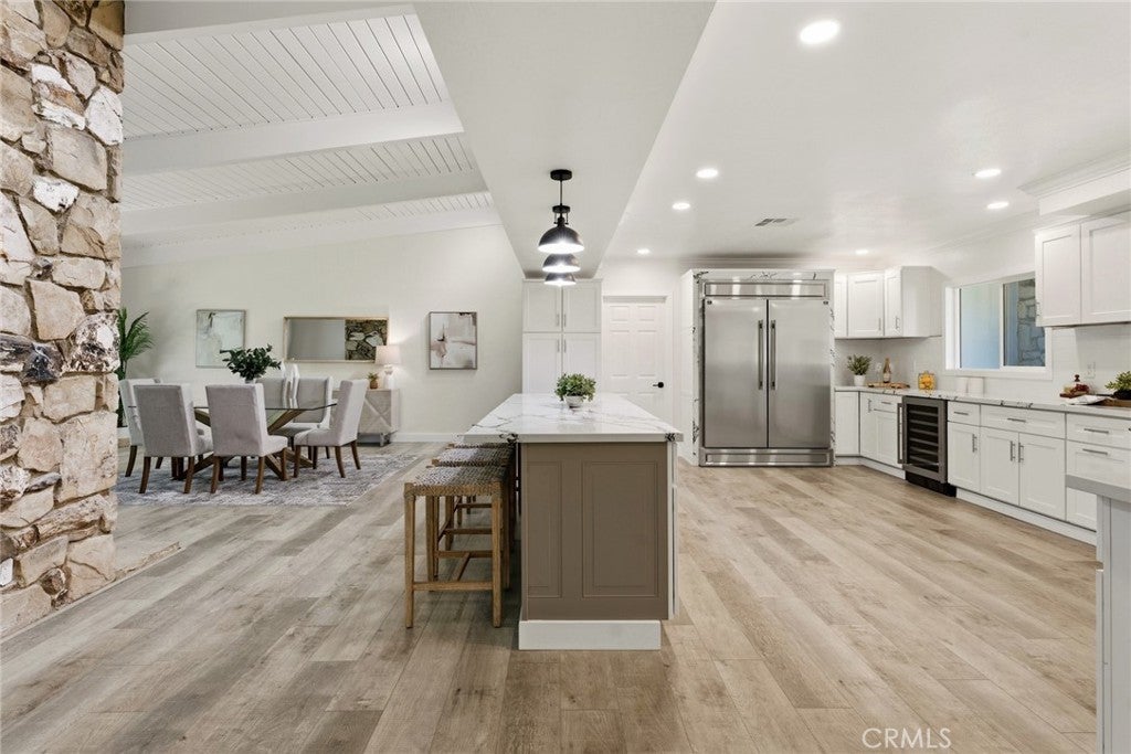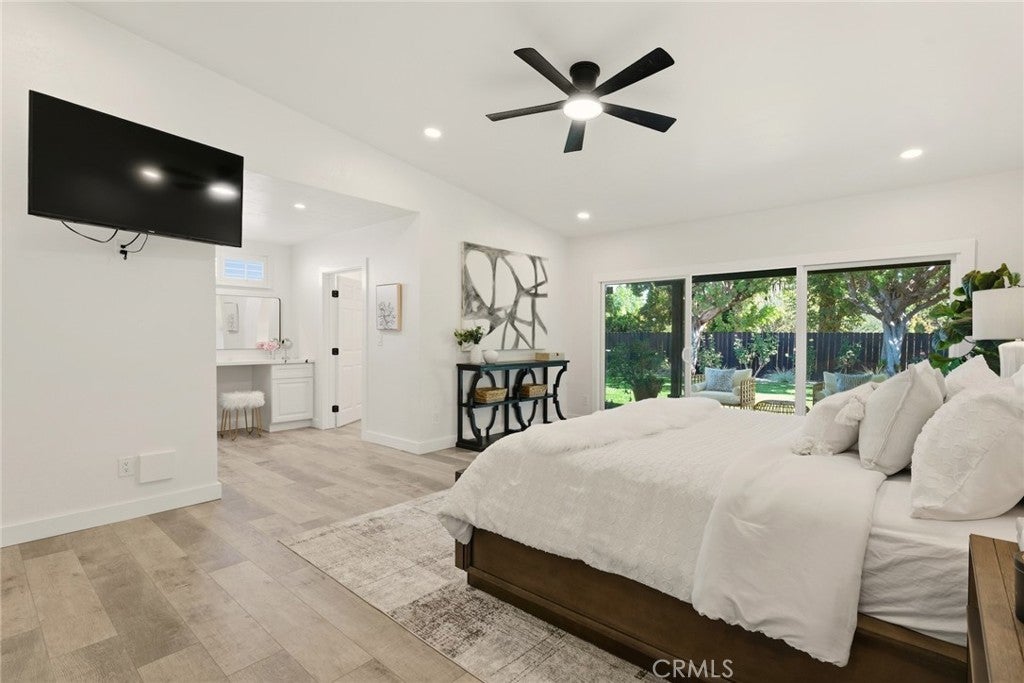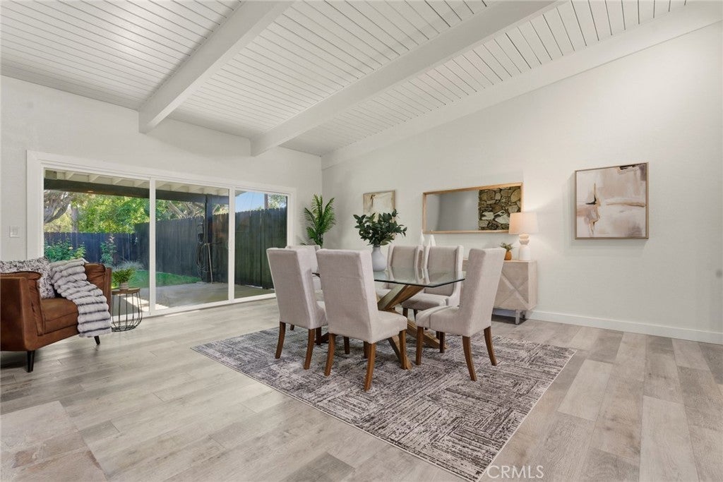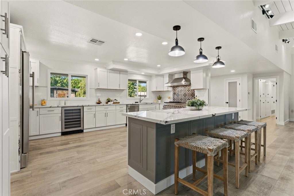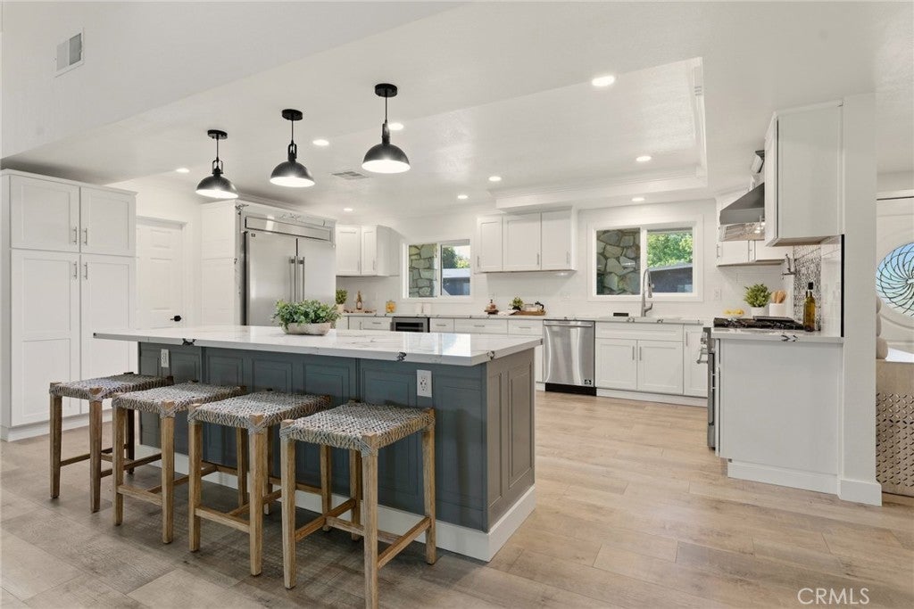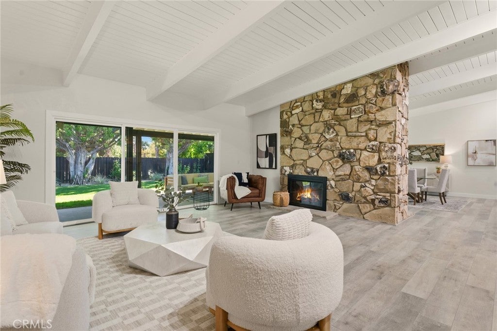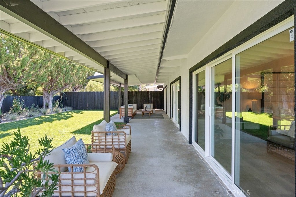 Meticulous and highly upgraded mid-century modern Charles Du Bois single level home! The property sits elevated above the street on a sprawling 11k lot boasting almost 100 feet of frontage adorned with manicured front lawns and lush landscaping. An ascending stone pathway leads to the covered front porch cladded with original stone exterior. Step through double doors into the entry foyer that opens to expansive living & dining rooms each with tongue & groove wood beamed vaulted ceilings, original stone fireplaces, and two sets of glass sliders that open to the backyard for the perfect indoor/outdoor flow. The oversized remodeled kitchen boasts large island with breakfast bar seating, quartz counters with soft close cabinetry, wine fridge, and a suite of Forno stainless appliances including a 60” fridge/freezer and range with double ovens and 8-burner stove with pot filler. The spacious primary suite features high vaulted ceiling, glass slider that opens to the yard, large walk-in closet, separate makeup vanity, and en-suite upgraded bathroom with dual sinks, spa tub, and separate walk-in shower. Two of the secondary bedrooms have high vaulted ceilings and share a spacious remodeled bathroom with new vanity with stone counter, dual sinks, and walk-in shower. There is a separate wing of the home which has both interior and exterior access making it the ideal flex space for extended family, home office/studio space, or great rental income featuring two additional bedrooms, a bathroom with dual sinks and walk-in shower, a separate full kitchen with stainless appliances, and its own private fenced-in yard separated from the main yard with patio, grass lawn, and storage shed. The home also has a spacious laundry room with built-in storage. The entertainer’s backyard has a sweeping covered patio perfect for outdoor dining and lounging, lush grass lawn with mature trees, and large side yard with additional storage shed. Adjacent to dining/shopping at the Westfield Mall/Village, Calabasas Commons, local parks/hiking, & zoned for award-winning El Camino & Hale charter schools.