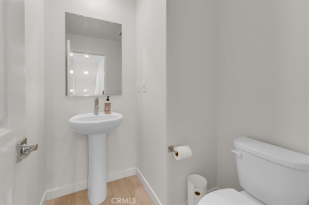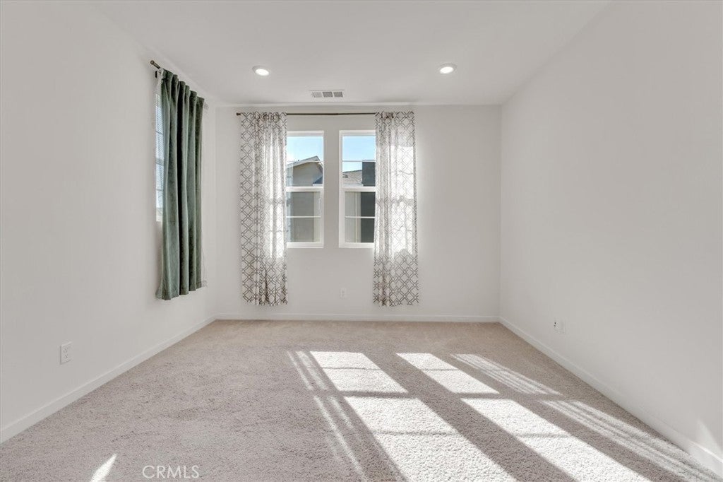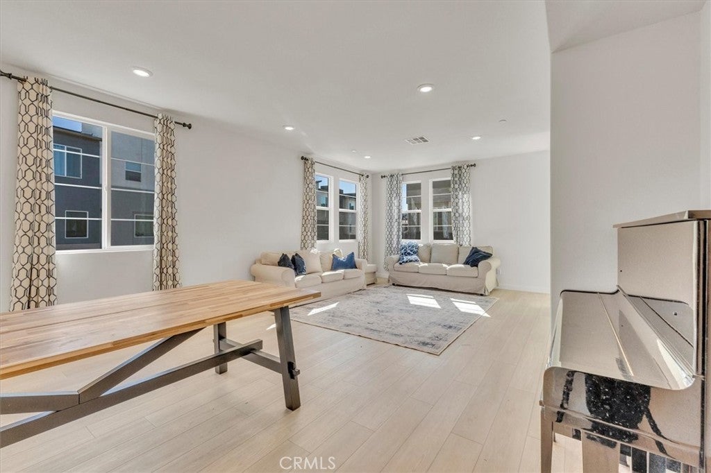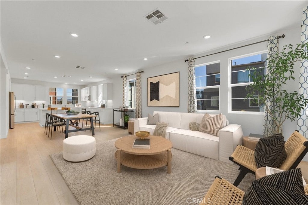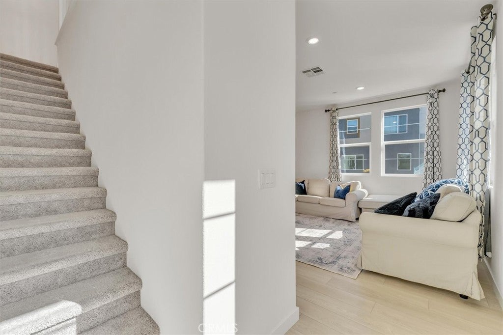 Discover an exceptional living opportunity within the highly sought-after FivePoint community in Valencia. Built in 2022, this tri-level elevation home epitomizes all the luxuries and sophistication of everyday living. A desirable corner unit with only one shared wall and inviting courtyard entry opens to this light and bright 3-bedroom, 4-bathroom townhome with approximately 2,054 square feet of living space. Main level features an open floor plan great room with living room, dining area, kitchen and powder room. Sun-filled kitchen with views abound is equipped with a large center island, stainless steel appliances, walk-in pantry, Quartz countertops, and white cabinets. Center island overlooks spacious living room area with wider planked wood-like floors plus tons of natural light, providing a tranquil and peaceful living space. The upper level hosts your primary suite plus two bedrooms and a dedicated laundry closet with a side-by-side washer and dryer. Elegant primary suite with plush carpeting, spacious walk-in closet, and primary bathroom with dual vanity sink and oversized walk-in custom tiled shower. Upper third level also features two generously proportioned Jack & Jill bedrooms with an adjoining bathroom. Lower-level features quaint entry with an open concept den, that could be used as a family room, office, gym or guest area, with sliding glass door overlooking the front courtyard. Lower level also features a powder room and is attached to 2-car garage with convenient direct access. Ideal for modern living with eco-friendly amenities like solar panels to help significantly reduce electric bills, Ecobee thermostat, EV charger, water filtration system and tankless water heater, allow for convenience and sustainability. Situated in a prime location, just a few minutes to Confluence Park, residents of FivePoint enjoy access to several resort-style amenities, including multiple pools and spas, a clubhouse, parks, sport courts, hiking/biking trails, community greenhouse, and the Community Center. Brilliantly located near major roads, easy access to freeways, amusement parks (Magic Mountain is just minutes away!), shops, restaurants, award winning schools and more.