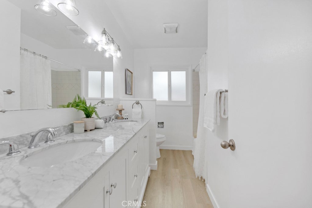 Located South of the Blvd on a tree-lined Woodland Hills street, this single-story 3 bed, 2 bath home offers 1,320 sq ft of bright, easy living on a 6,252 sq ft lot. An open living/dining area showcases hardwood floors, recessed lighting and a painted brick fireplace, with large sliders that extend the space to a covered back patio, ideal for outdoor dining and entertaining. The cheerful kitchen features white cabinetry, granite counters, a gas cooktop, double ovens, stainless refrigerator and a convenient pass-through to the dining area. The bedroom wing includes a serene primary plus two comfortable secondary bedrooms, served by two updated baths, one with a glass-enclosed shower and another with a dual-sink vanity and tub/shower combo. The backyard is lush and grassy with mature landscaping, offering plenty of room to play and relax. An attached two-car garage and wide driveway provide ample parking. Moments to Ventura Blvd restaurants, The Village and Westfield Topanga, with easy canyon/101 access.
