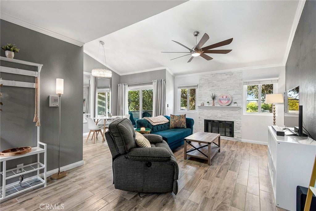 Holiday special!! Step into this beautifully maintained end unit, all on one level, in the highly sought-after Sandalwood Village community—where privacy, comfort, and resort-style living come together effortlessly. This turnkey home offers sleek ceramic tile flooring throughout, dual-pane windows for energy efficiency, and a bright, inviting layout that feels welcoming from the moment you arrive. The spacious living room features soaring vaulted ceilings and a striking white stone gas fireplace, creating an ideal focal point for cozy evenings or entertaining guests. Just off the living room, the dedicated dining area opens to a charming balcony with peaceful mountain views—perfect for morning coffee or casual outdoor dining. The kitchen is both stylish and functional, showcasing crisp white granite countertops, ample cabinetry, and convenient access to the home’s main living spaces. Down the hall are two well-sized bedrooms and two full bathrooms, providing comfort, privacy, and flexibility for a variety of lifestyles. Additional highlights include an in-unit laundry room, direct access to a private 2-car garage, and the perks of being an end unit—meaning only one shared wall and abundant natural light. A brand-new roof adds even more value and peace of mind. Sandalwood Village elevates everyday living with beautifully maintained grounds and desirable amenities, including two sparkling pools, a relaxing spa, a community tennis court, and pet-friendly policies that make it easy to enjoy life with your four-legged companions. The location is exceptional—close to Corriganville’s scenic hiking trails and cinematic history, with easy access to the 118 Freeway and ample guest parking. This is a fantastic opportunity to own a low-maintenance home in a prime community—perfect for first-time buyers, downsizers, or anyone seeking comfort and convenience in a beautiful, pet-friendly setting.