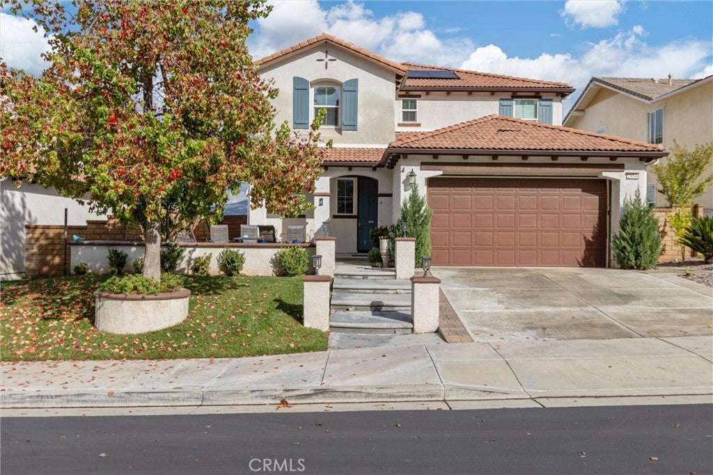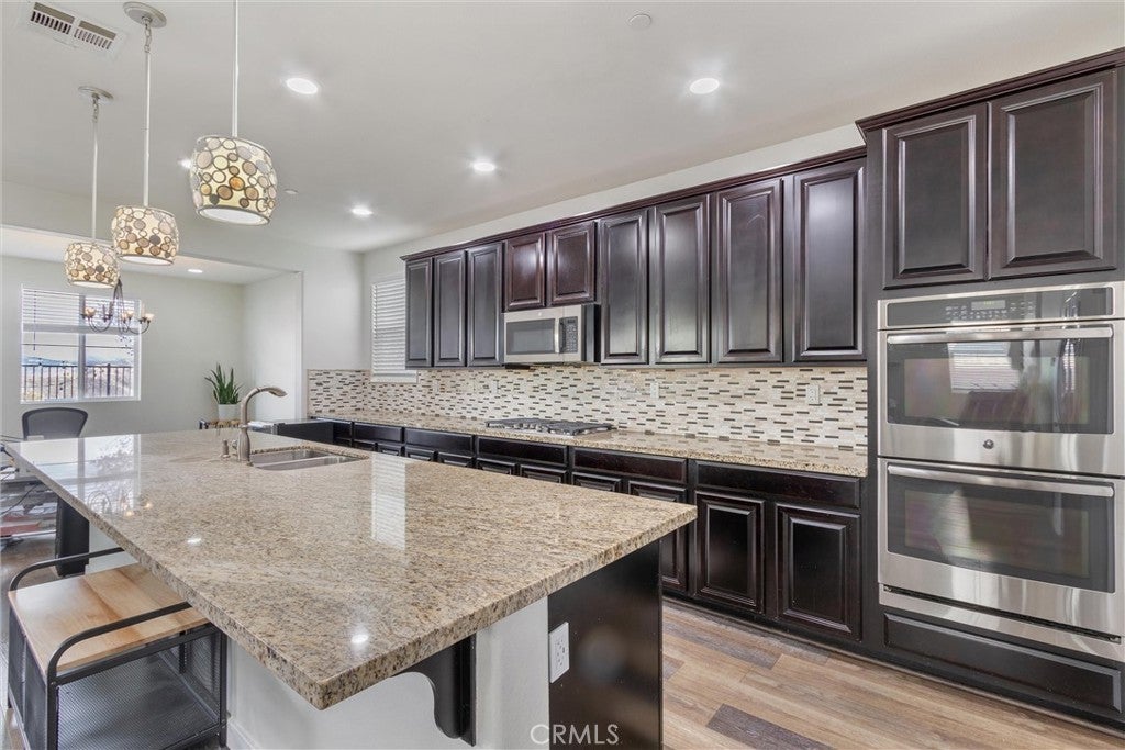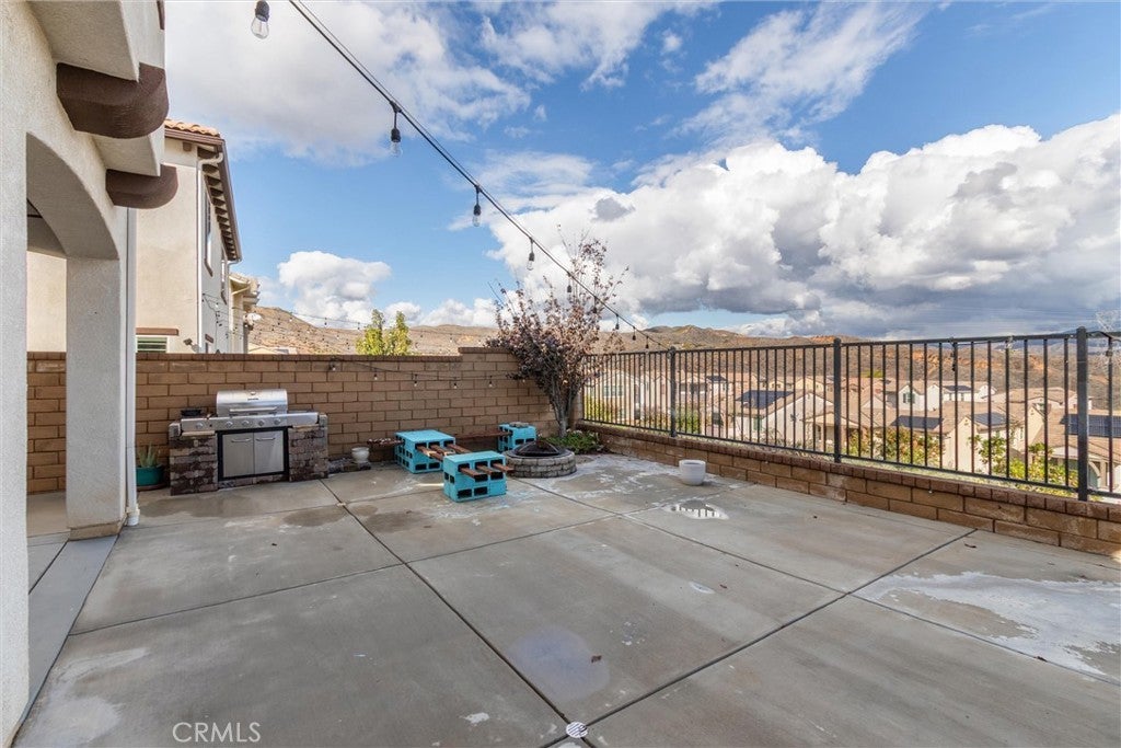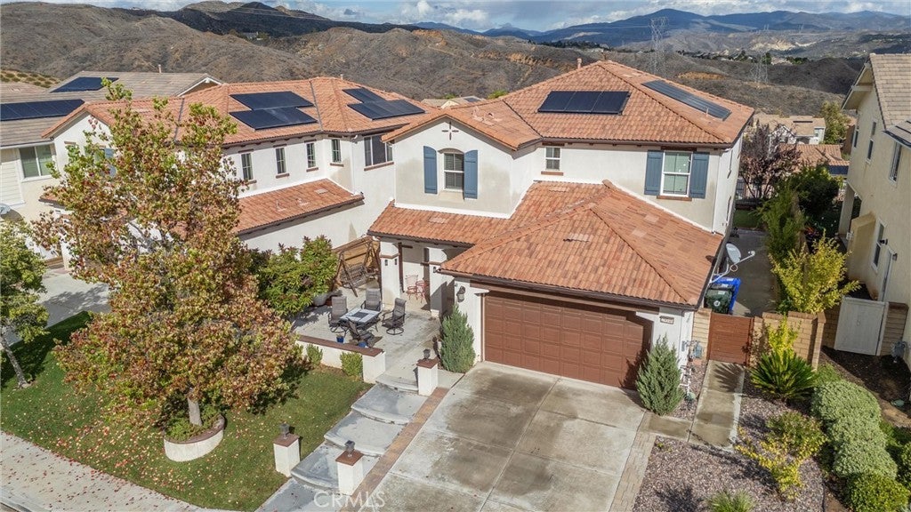 VIEWS! Welcome to this beautifully updated 4-bedroom, 2.5-bath home offering over 2,600 sq. ft. of comfortable, contemporary living in one of Valencia’s premier gated communities. Positioned to capture beautiful hillside and neighborhood views, this home blends space, style, and functionality. Inside, you’re welcomed by soaring ceilings, recessed lighting, and bright, open living areas that set the tone for both relaxation and entertaining. The main level features a seamless flow from the family room to the kitchen, creating an inviting central gathering space. Durable laminate flooring adds a clean, modern feel throughout the home. The open kitchen is a standout, featuring a large center island, granite-style counters, stainless steel appliances, and generous cabinetry. Its open layout makes everyday cooking and hosting effortless. All four bedrooms are located upstairs, offering a quiet and private retreat. The primary suite includes a walk-in closet along with an ensuite bath featuring a soaking tub, separate walk-in shower, and dual vanities. Additional bedrooms are well-sized with easy access to upgraded bathrooms. Step outside to a welcoming backyard space with a covered patio, perfect for outdoor dining or relaxing while taking in the views. The home also includes solar, helping keep monthly electricity costs low. Living in West Hills means access to exceptional community amenities including pools, a spa, clubhouse, parks, and scenic walking paths—ideal for enjoying the outdoors just steps from home.