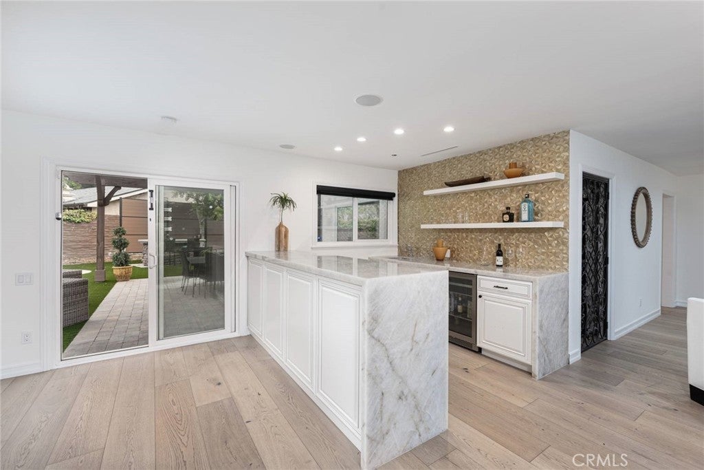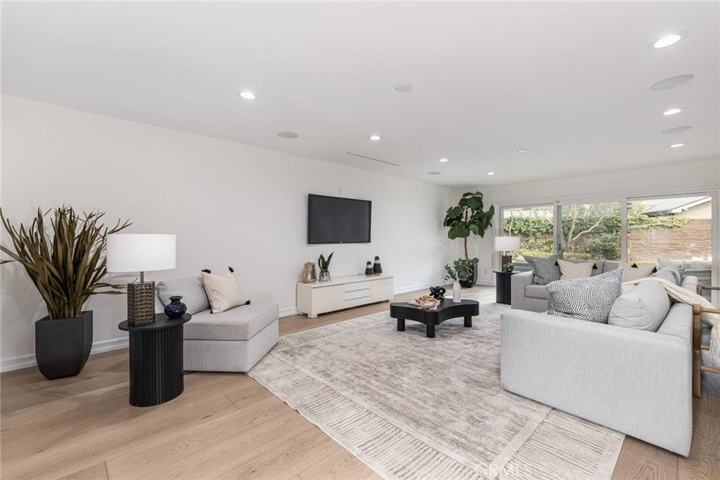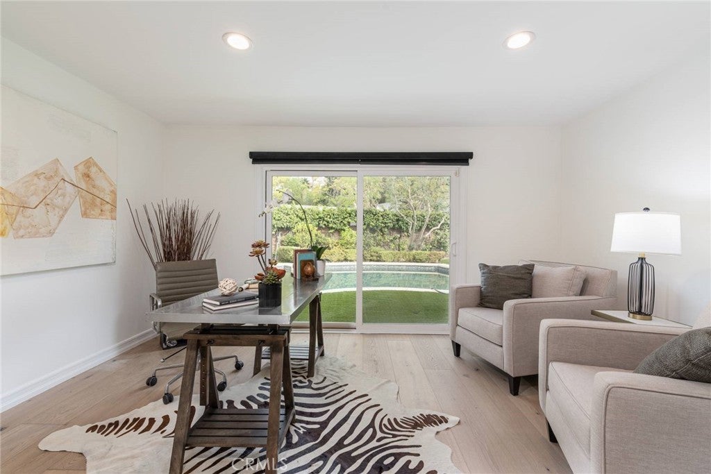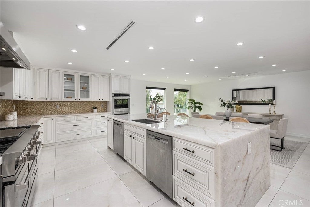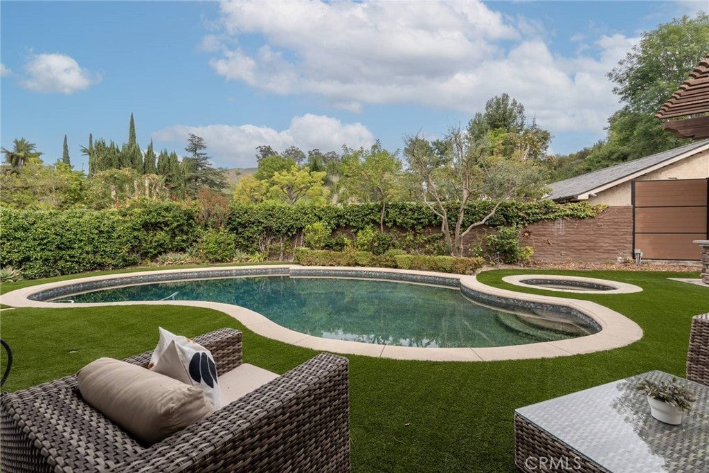 Experience the ultimate in exceptional values at this brilliantly reimagined single-level estate in Encino Hills’ exclusive Lake Encino enclave. Secluded on an expansive corner parcel spanning over one-third acre, this architectural gem seamlessly blends timeless sophistication with contemporary luxury, offering discerning buyers an extraordinary turnkey lifestyle. Originally crafted in 1964 and completely transformed with no detail overlooked, this 5-bedroom, 4.5-bath residence spans 4,338 square feet of thoughtfully curated living space. Wide-plank hardwood floors, expansive walls of glass, and an adaptable open floor plan bathe the interiors in natural light and invite effortless indoor-outdoor living…perfectly attuned to modern demands for versatility and privacy. Culinary enthusiasts will revel in the state-of-the-art gourmet kitchen, appointed with a dramatic quartzite waterfall island, Blue Star professional range, dual KitchenAid ovens, double Bosch dishwashers, a True Refrigerator with wine storage, integrated wine fridge, artisan tile work, and stunning marble flooring. The elegant atmosphere flows through the open-concept living and dining areas, highlighted by a sophisticated wet bar mirroring the kitchen’s bespoke finishes…an entertainer’s dream. Retreat to the sumptuous primary suite, where dual walk-in closets, a flexible bonus room (ideal for nursery, gym, or home office), and a spa-caliber bath with high-design fixtures, custom cabinetry, and indulgent soaking tub create a private sanctuary. Four spacious secondary bedrooms, a custom laundry center, butler’s pantry, and a meticulously finished garage further elevate the home’s everyday comfort and convenience. Resort-style oasis…a free-form heated Pebble Tech pool with separate spa, professional-grade BBQ, refrigerator, pergola covered patio, and meticulously landscaped, low-maintenance grounds set the stage for elegant alfresco dining and year-round relaxation, all in seclusion bestowed by mature landscaping and the property’s privileged placement. Leading-edge home systems…fully owned solar energy (including solar pool heating), dual Navien tankless water heaters, 200-amp electrical service, built-in speakers, and a comprehensive alarm system ensures security, efficiency, and sustainability. Situated on one of Lake Encino’s most coveted streets, this rare offering effortlessly blends energy independence, magazine-worthy entertaining spaces, and the ultimate in privacy.