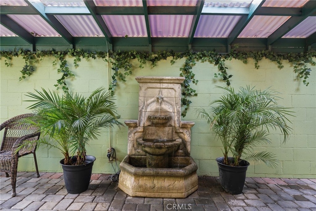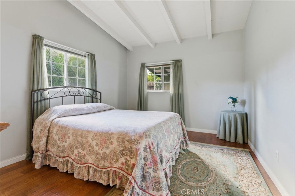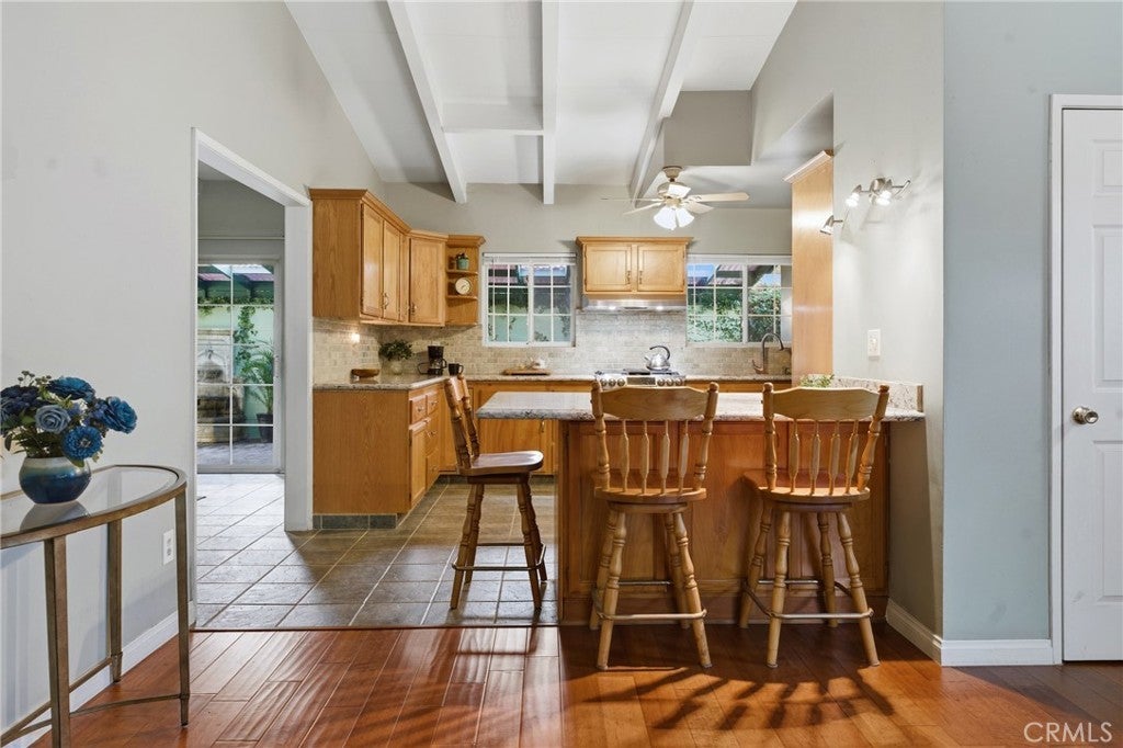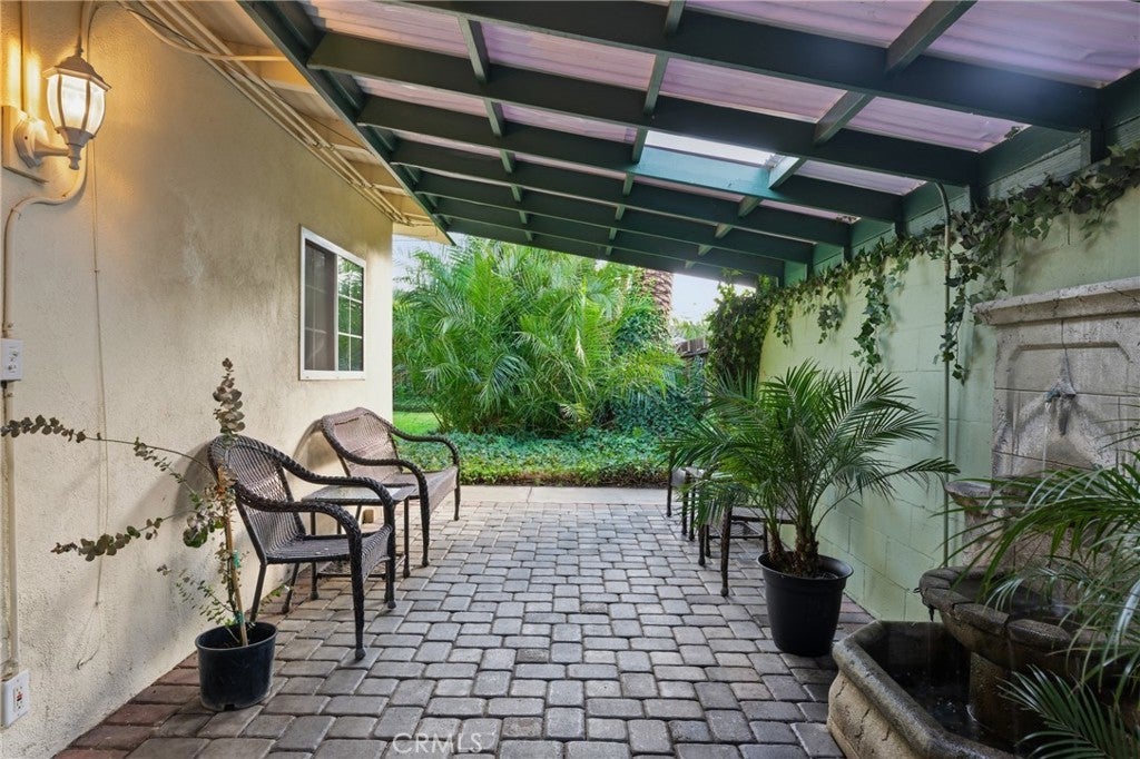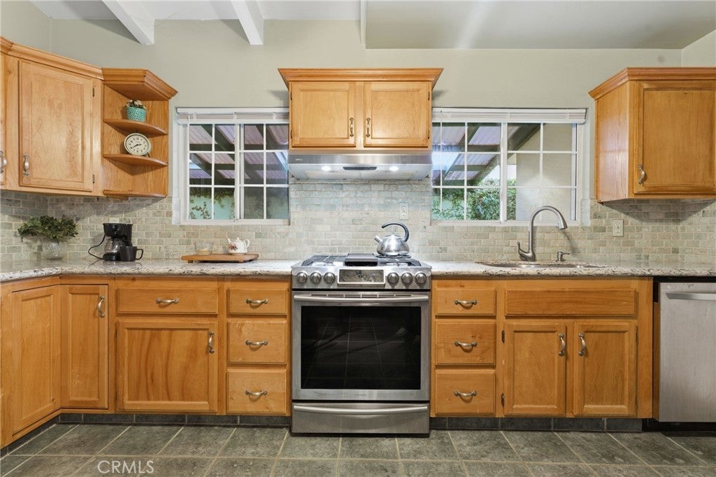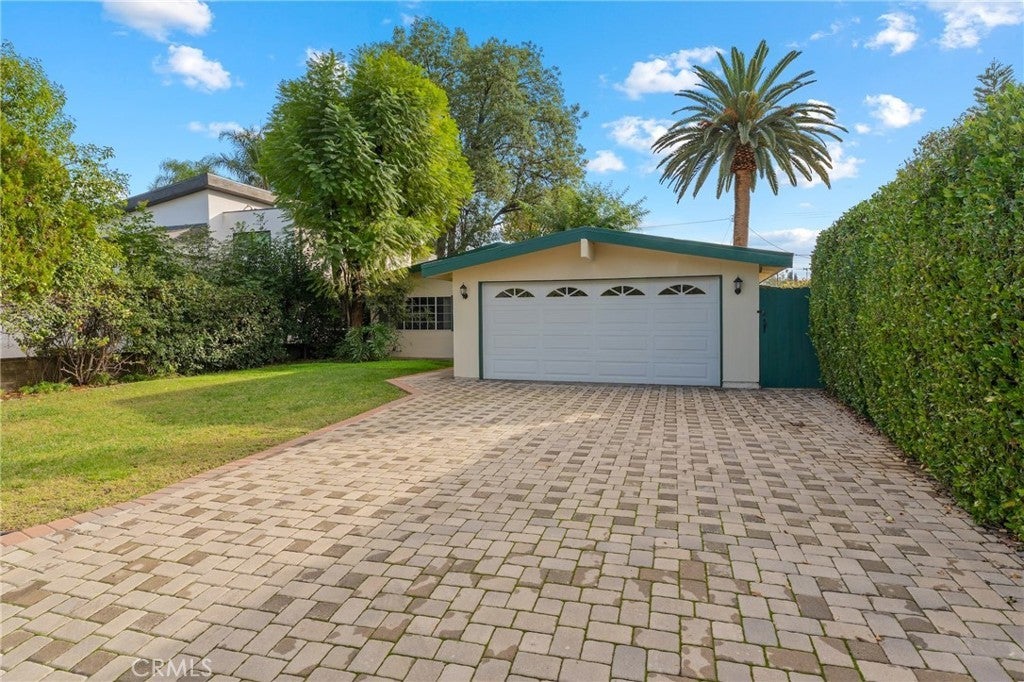 Immaculate single story mid-century ranch home with large backyard situated in a great Woodland Hills neighborhood zoned for highly acclaimed Hale and El Camino charter schools! The property sits back from the street with lush front lawn, mature trees, and paver stone driveway that leads to the attached 2-car garage with direct access. Step inside to find a large living room with high vaulted wood beamed ceiling, remodeled stone fireplace, large picture windows, and wood flooring found throughout. The updated oversized kitchen opens to the living room and boasts high vaulted ceiling, quartz counters with stone backsplash, large peninsula with breakfast bar seating, wood cabinetry, pantry space, and stainless appliances. There is a separate spacious formal dining room off the kitchen which could also serve as a den or office featuring high vaulted wood beamed ceiling, glass slider that opens to the yard, and walk-in storage closet. The three bedrooms are well appointed, each with high vaulted wood beamed ceilings and good sized closets. There are two hall bathrooms, one with bathtub and shower and the other with walk-in shower. The 2-car garage houses the laundry and has built-in storage and can also be used as great bonus space as it has been finished with tiled flooring and has high pitched ceilings. The extremely private and tranquil backyard features a sprawling grass lawn for play and entertaining, an expansive covered patio with skylights, serene water fountain, and paver stones ideal for outdoor dining and gathering; gorgeous mature palm tree, and perfectly manicured bamboo privacy hedging. There is ample space to build a pool, outdoor kitchen, etc. Adjacent to dining/shopping at the Westfield Mall & Village, Calabasas Commons, Warner Center, & close to great local parks and hiking trails with easy freeway access.