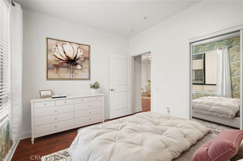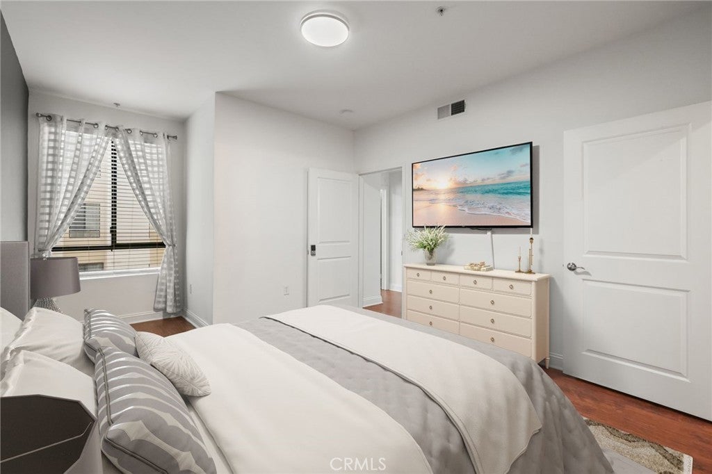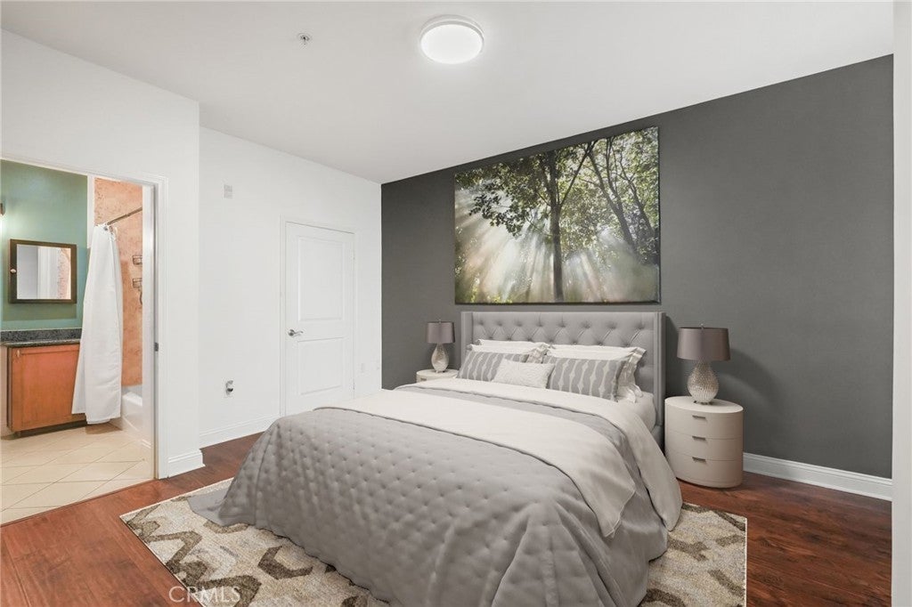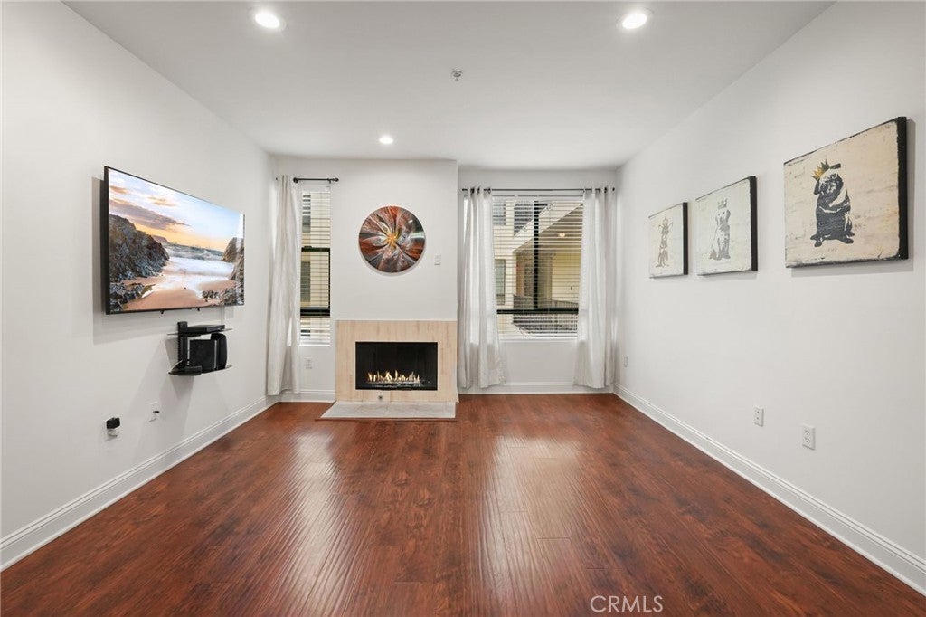 Welcome to this bright and spacious 2-bedroom, 2-bathroom condo located in a secure, Mediterranean-style building in the heart of North Hollywood. This beautifully maintained unit offers an open-concept layout with engineered hardwood flooring and high ceilings. The living room features large windows that fill the space with natural light, along with a sleek gas fireplace that adds warmth and modern appeal. The kitchen is equipped with granite countertops, stainless steel appliances, and ample cabinetry, creating a seamless flow between the dining and living areas. For added convenience, the home includes an in-unit stacked washer and dryer. Both bedrooms are generously sized, and the primary suite features a walk-in closet and an en-suite bathroom with dual vanities, granite counters, and a soaking tub/shower combination. The second bedroom is spacious and conveniently located near the full guest bathroom. The community offers secure controlled access, gated underground parking, a fitness center, and a beautifully tiled central courtyard with seating areas and decorative details. Residents also enjoy access to a rooftop deck with sweeping views of the San Fernando Valley. The HOA includes water, trash, elevator maintenance, and coverage for all building-related issues, leaving the owner responsible only for their electric and gas bills. Located just minutes from the NoHo Arts District, major studios, restaurants, shopping, and freeway access, this move-in-ready home offers comfort, convenience, and modern living in one of LA’s most desirable neighborhoods.