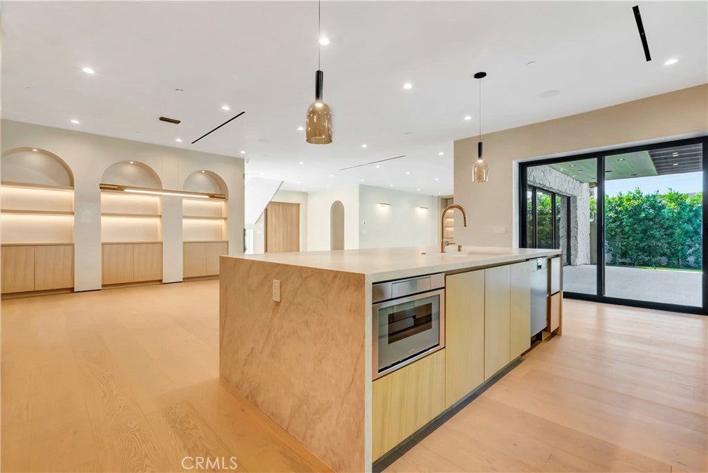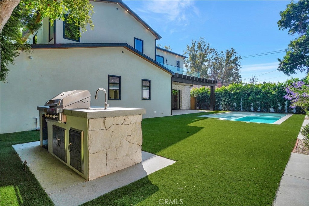 Welcome to this warm and sophisticated residence, masterfully designed with elegant finishes, abundant natural light, and timeless style. Step inside a bright open-concept floor plan, highlighted by expansive living and dining areas, chic wide-plank flooring, and a designer powder room with a statement vanity. The gourmet chef’s kitchen boasts custom wood cabinetry, a grand center island, premium countertops, and top-of-the-line finishes — perfect for everyday living and effortless entertaining. The first floor also features a spacious guest suite complete with a walk-in closet and a private ensuite bath. Upstairs, discover three luxurious bedroom suites, each with a walk-in closet and private bathroom. The primary retreat impresses with a custom grand walk-in closet, a spa-inspired bathroom with soaking tub and oversized walk-in shower, plus a private balcony overlooking the backyard oasis. The resort-style backyard is designed for both relaxation and entertainment, featuring a large patio, built-in BBQ, and a sparkling heated pool with spa and Baja shelf. Adding incredible versatility, a detached 2-bedroom, 1-bath ADU with its own living room and kitchenette provides the perfect option for guests, extended family, or rental income. Nestled on a tranquil tree-lined street, this property offers the best of both worlds — peace and privacy, yet only minutes from premier shopping, dining, and easy access to the 101 Freeway.