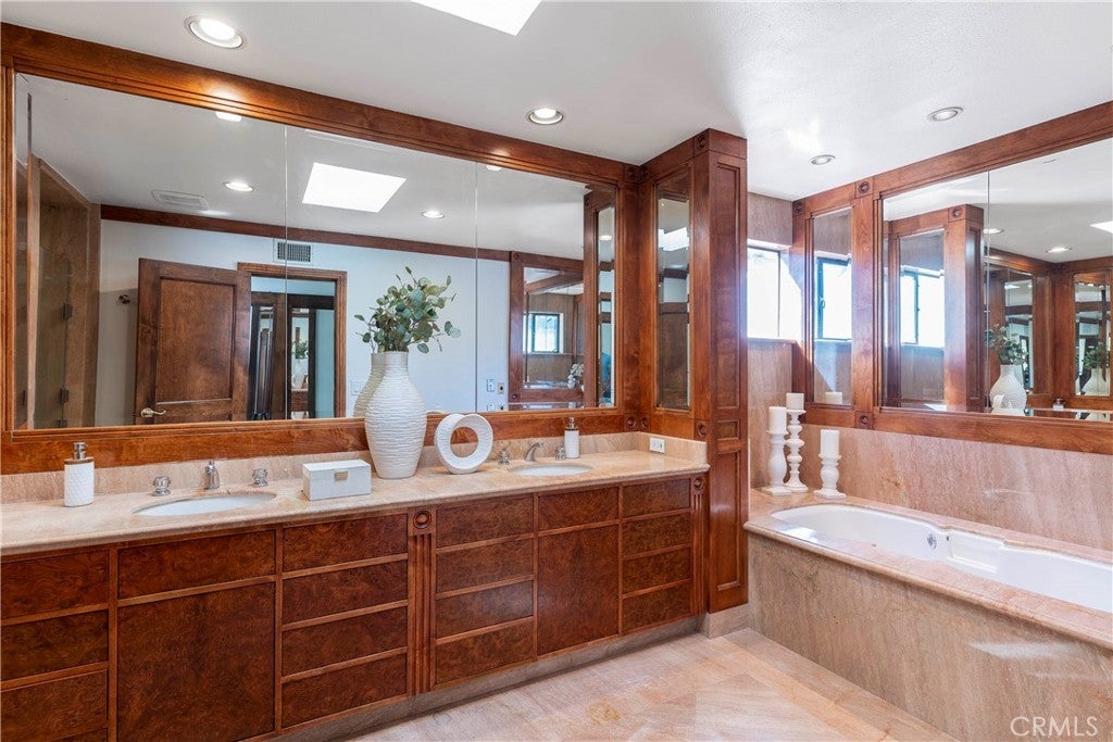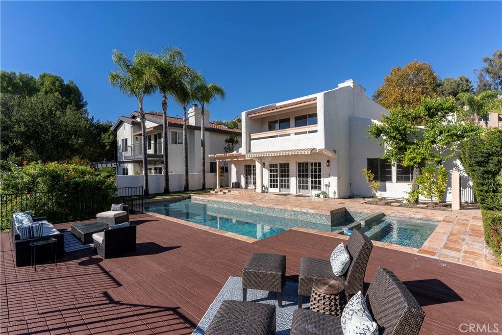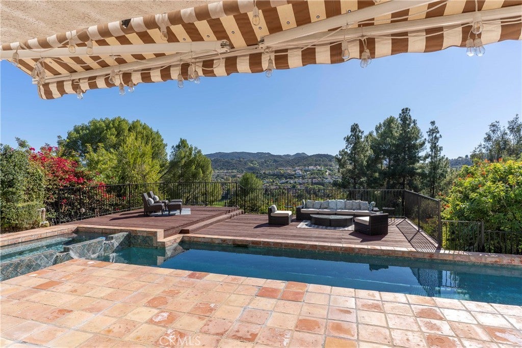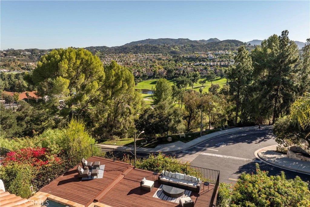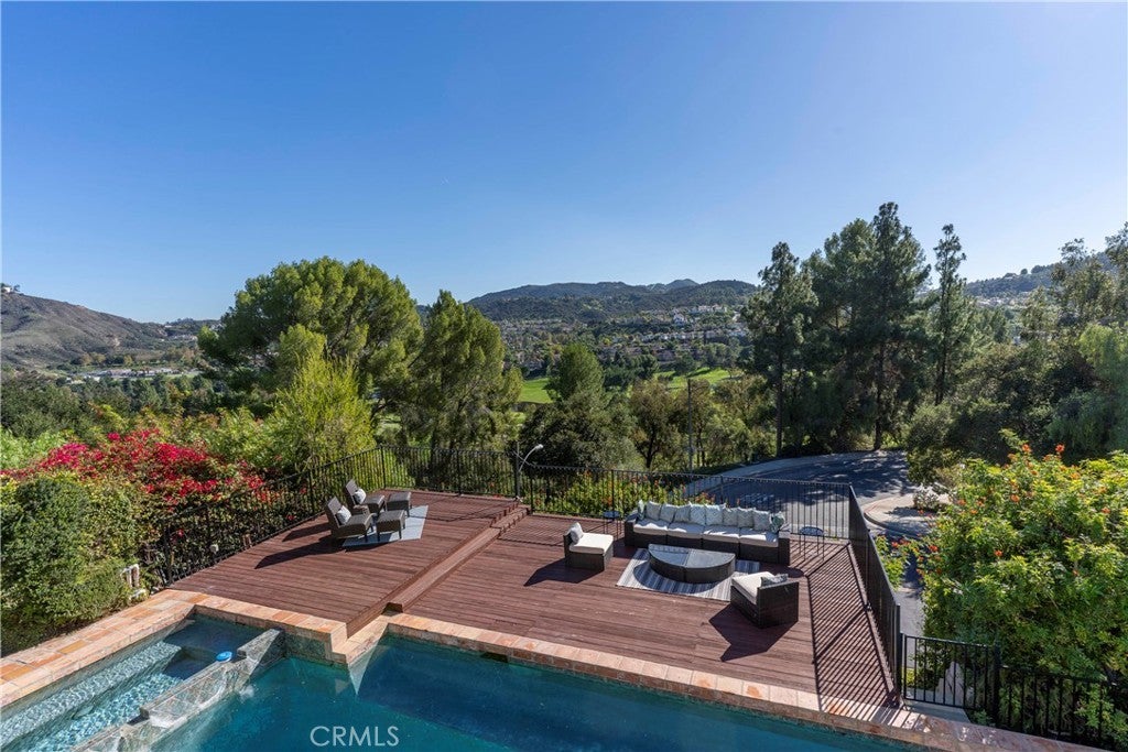 Welcome to this stunning view home in the prestigious guard gated community of Vista Point in Calabasas. Nestled on a sprawling lot at the end of a cul de sac with only seven residences, this remodeled 4 bedroom, 3.5 bathroom home offers 3,288 square feet of luxury living space. The entire upstairs is a luxurious private primary suite with a fireplace and golf course views from the balcony. The spa like bathroom features marble counters and flooring, a bidet, whirlpool bathtub, and a glass door shower. There are two large walk in closets with three way dressing mirror doors, and the suite enjoys complete privacy. Downstairs are three large bedrooms with high ceilings, including two that share a Jack and Jill bathroom. The chef’s kitchen features new stainless steel appliances, double oven, 5 burner gas cooktop, trash compactor, butcher block island, and abundant cabinetry. A huge living and family room offers a fireplace and sliding doors that open to the beautiful backyard with deck, pool, spa, golf course views, and endless entertainment potential. Additional features include a dual zone HVAC system, large deck for entertaining, new interior paint, new flooring, a three car garage with direct access, a loft for extra storage, and a dedicated laundry room. The Vista Point community offers two tennis courts and 24 hour security.