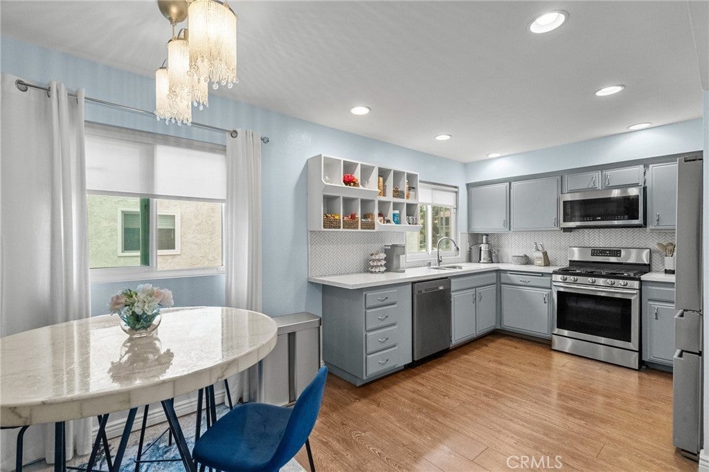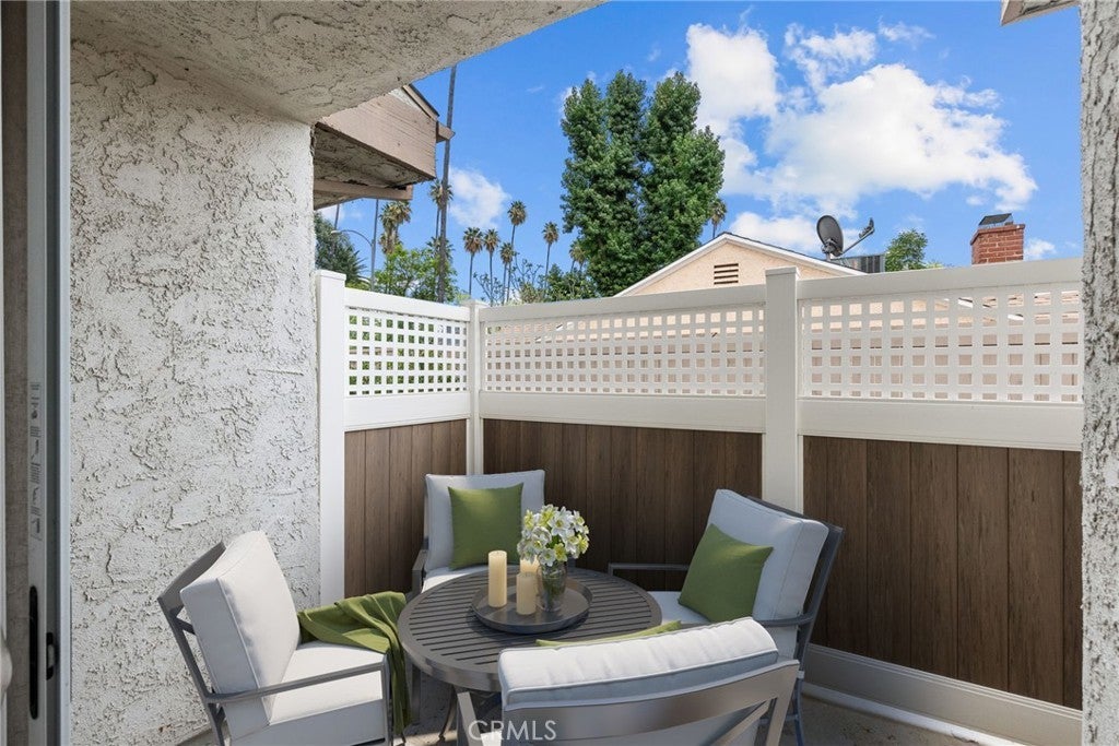 Beautifully Remodeled 3-bedroom + Bonus Room/Office offers the perfect blend of comfort and style. Step inside to a spacious living room featuring a cozy gas fireplace, 6 recessed LED smart lights that change colors, modern flooring, and abundant natural light from a sliding glass door leading to a private patio. The patio, ideal for outdoor enjoyment, boasts new fencing and is perfect for enjoying the California sunshine. The kitchen is a chef's dream with sleek quartz countertops with stylish herringbone tile backsplash accented with high end and matching Samsung stainless steel appliances. Open to the dining area, this space is perfect for hosting friends and family. A convenient indoor laundry area is also located on this level. You'll feel the true modernization with all new 5 panel Frosted Glass Bianco Noble Finished doors throughout the home. Upstairs, you'll find all three generously sized bedrooms, each with ceiling fans for added comfort. Primary bedroom with city views and en suite bathroom. Updated tiling in the shower and new vanity with led lighted mirror that defrosts. Guest bathroom features a barn door, LED mirror that defrosts and tiled shower with new vanity and faucet. Plus, enjoy the bonus room which is ideal for a home office or gym, equipped with its own AC unit for added convenience. Seller purchased and will provide a matching barn door for the primary bathroom but hasn't installed it. Enjoy the peace of mind that comes with living in a gated community with a private pool, while also being close to shopping, restaurants, Pierce College, the 101 Freeway, Kaiser, Westfield Mall, and parks. Be home for the holidays!