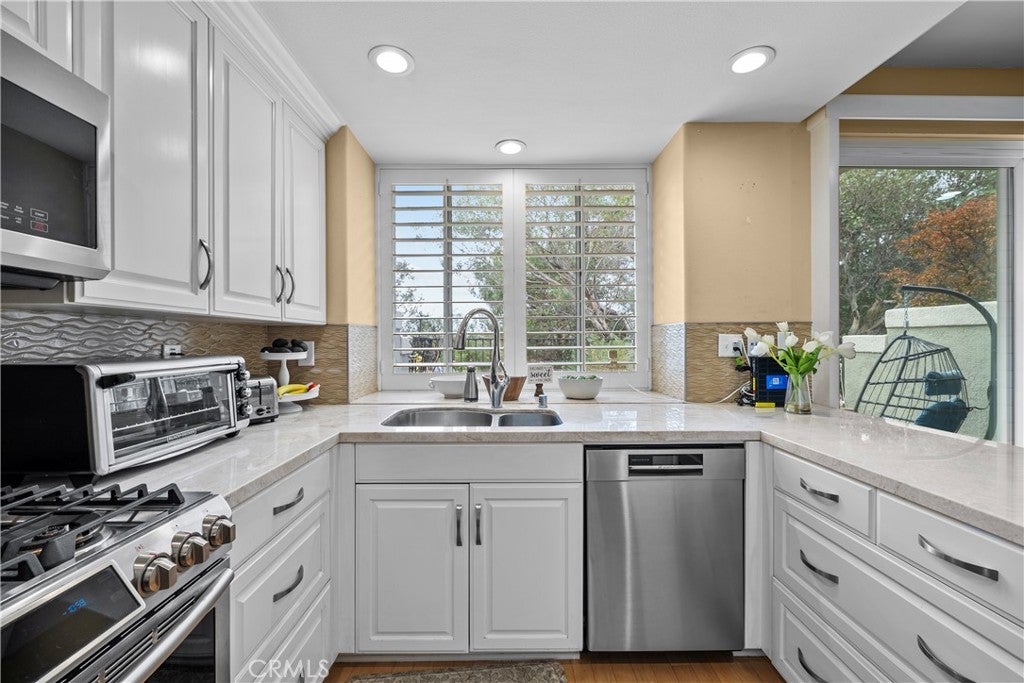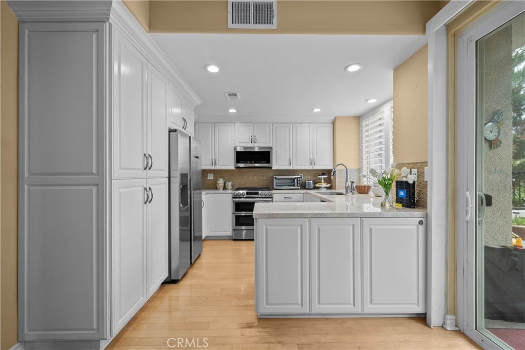 Welcome to this WARRANTABLE fantastic 3-bedroom, 2.5-bath END-UNIT townhome in the desirable California West community of Chatsworth, surrounded by breathtaking views of the Santa Susana Mountains. As you step inside you are welcomed to natural light filling the spacious living room, featuring high ceilings, arched windows w/plantation shutters, and beautiful stone fireplace - which flows into the dining room - perfect for entertaining in both spaces. At the heart of the home is the beautifully appointed kitchen w/custom cabinetry, elegant countertops, glass backsplash, stainless-steel appliances, INCLUDING Refrigerator, a gas range, dishwasher and deep sink. The kitchen is complemented by a large garden window overlooking the private patio. Within this space is a versatile den/family room w/recessed lighting and custom floor-to-ceiling bookcases that provides the ideal space for displaying décor, books, or creating a home office. Sliding glass doors lead to your private patio, surrounded by lush greenery. The main floor includes a convenient powder room, as well. And under the stairs is a "Harry Potter" closet ideal for extra storage or for your own creative use. Upstairs, discover a spacious primary suite w/its own fireplace, recessed lighting, ceiling fan, and Valley views, a walk-in closet w/built-in shelving, and an en-suite bathroom w/dual sinks and a shower/tub combo. Two additional bedrooms - one with a walk-in closet - both with newer ceiling fans, offers ample space for family or guests. The upstairs hallway features a full bathroom w/a walk-in shower, a laundry room w/INCLUDED WASHER/DRYER, and a hallway utility closet. The direct-access 2-car garage includes built-in storage cabinets. Nearby the townhome is plenty of guest parking and easy access to one of the 2 resort-like pools, spas, a BBQ area, inviting lounge spaces, and trails leading to the scenic 23-acre Garden of the Gods Park. Recent updates include: recessed lighting, newer ceiling fans, and newer furnace (2022). The HOA covers 100% FIRE INSURANCE + exterior common area maintenance, water, and earthquake insurance. Conveniently located off the 118 freeway at Topanga Canyon, the Cal West Community offers easy access to the Vineyards shopping plaza, Boeckmann Park, shopping, dining, and other conveniences, blending comfort and accessibility and a wonderful place to call home!