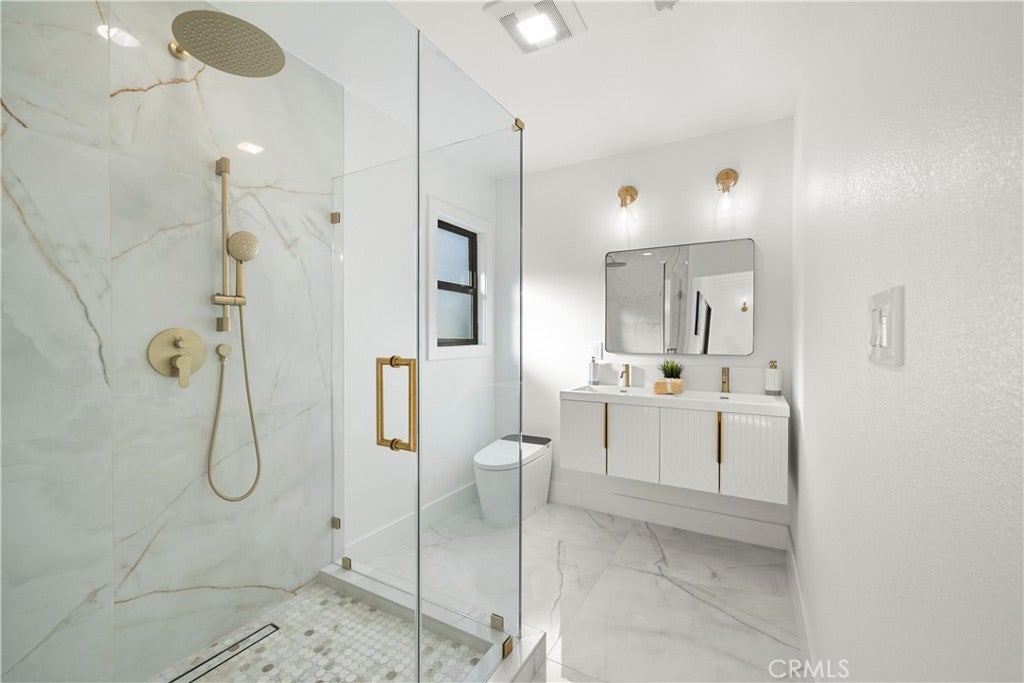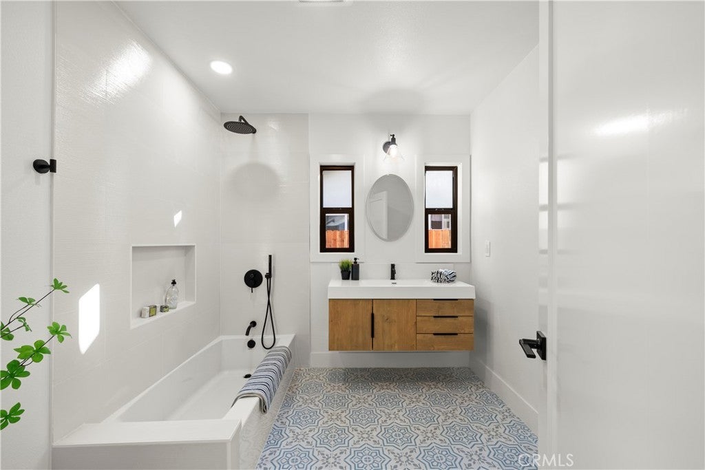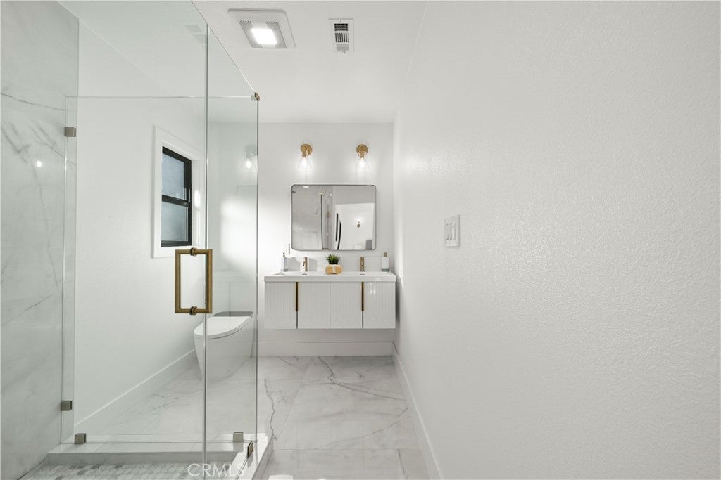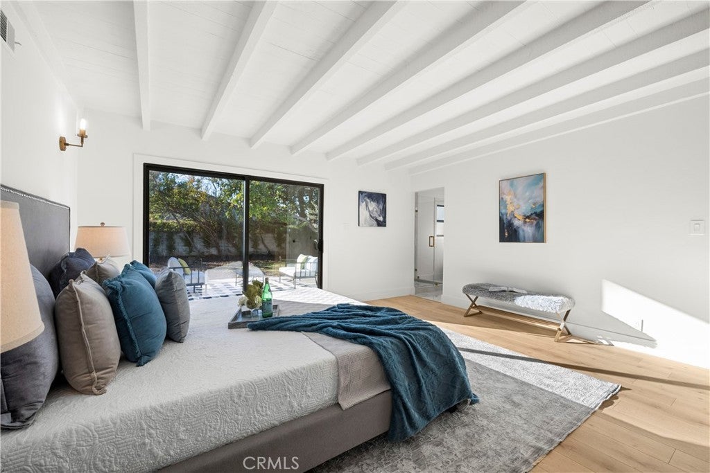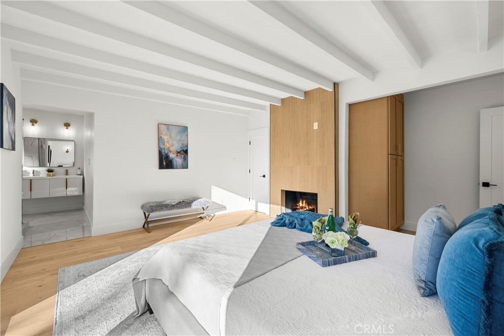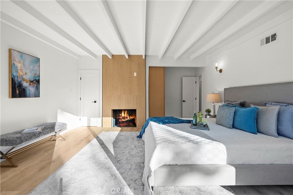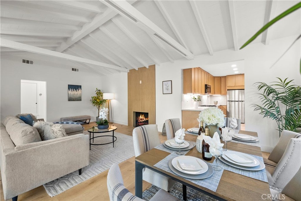 Welcome to this meticulously reimagined Mellenthin home, privately set on a quiet street and thoughtfully redesigned to blend clean modern finishes with a warm, inviting feel, creating an elevated living experience in one of the area’s most coveted pockets. Inside, vaulted ceilings and abundant natural light amplify the openness of the space, while expansive windows frame the living area and give the home a bright, airy presence. The open layout connects the chef’s kitchen with the living and dining areas, creating a seamless setting ideal for gatherings or quiet evenings at home. The spacious primary suite serves as a true retreat, featuring a spa-inspired bathroom with dual vanities, a luxurious walk-in shower, and generous closet space, while a cozy fireplace, wood-beamed ceilings, and calming backyard views through large slider doors enhance the room’s warm, indoor–outdoor feel. Two additional large bedrooms offer flexibility for guests, family, or a home office. The expansive backyard is a private escape, offering a large stretch of lawn and a serene seating area framed by a mix of fruit, olive, and palm trees that create a lush, private backdrop, seamlessly continuing to the manicured front yard where curated landscaping and an extended driveway elevate the home’s curb appeal. Set in one of Valley Glen’s most desirable neighborhoods, this home delivers a refined blend of comfort, style, and modern living.