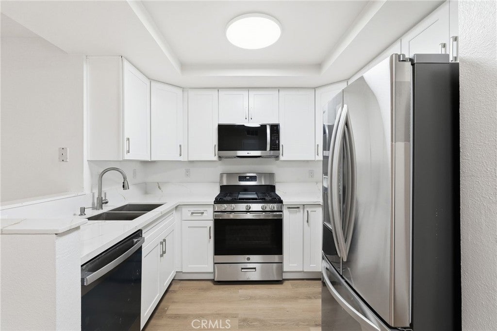 Beautifully Remodeled 1 Bed, 1 Bath Condo with Private Patio & Two Side-by-Side Parking Spaces. Step into a fully upgraded unit featuring fresh paint, new flooring, and a beautifully redesigned kitchen complete with quartz countertops and brand-new stainless-steel appliances — including refrigerator, stove, microwave, and dishwasher. Enjoy the comfort of central AC/heat, recessed lighting throughout, and updated safety features such as smoke and carbon monoxide detectors. Located in a secure gated community offering resort-style amenities including a swimming pool, jacuzzi, and well maintained grounds.