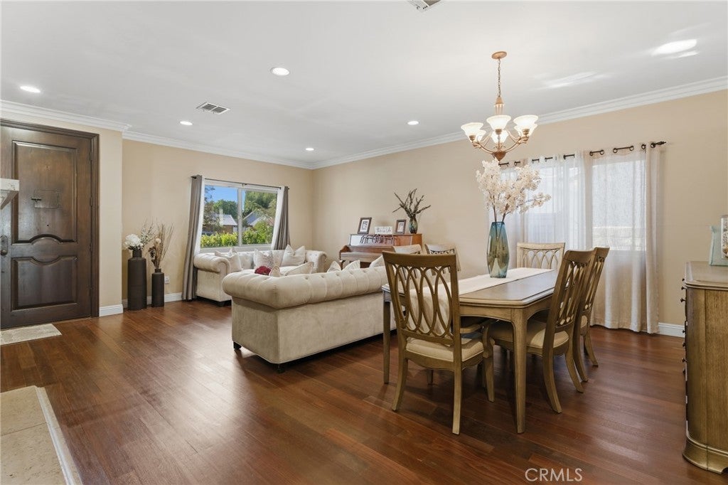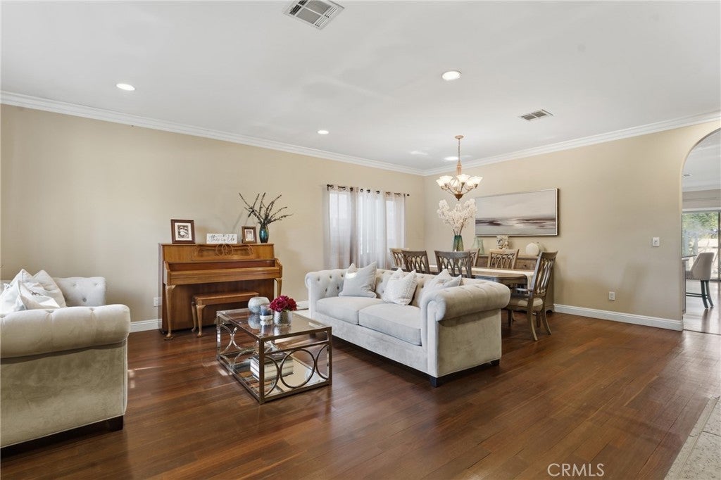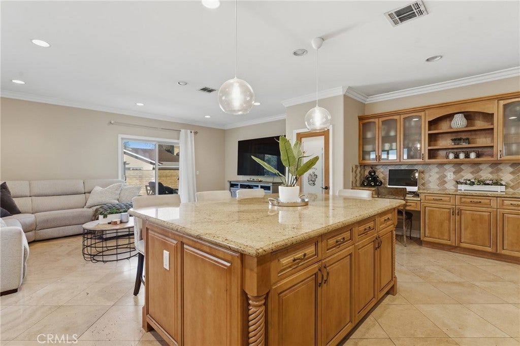 Newer 2005 custom built single story Mediterranean home! The property features a lushly landscaped front yard with two towering Palm trees and wide driveway that leads to the finished 2-car garage with direct access. The interior offers a great open layout with high ceilings, arched entryways, and custom detailing throughout. A double door entry opens to the oversized formal living and dining rooms with mantled fireplace, large picture windows, and real hardwood flooring. The chef’s kitchen boasts expansive island with breakfast bar seating, stainless appliances including Frigidaire range with 5-burner stove, separate large buffet counter with built-ins, and separate walk-in pantry. The kitchen opens directly to the separate family room which has a sliding glass door that opens to the backyard. There is a convenient powder bathroom for guests adjacent to the living spaces. A long private hallway leads to the four bedrooms including the spacious primary suite featuring sliding glass door that opens to the yard, large walk-in closet with custom built-ins, and private en-suite bathroom with dual sinks, stone counters & backsplash, spa tub, and separate walk-in shower. The three secondary bedrooms are well appointed with custom closets and each has direct access to a bathroom. One bedroom has an en-suite bathroom with tub and shower while the other two bedrooms share another bathroom with tub and shower. There is also a separate laundry room with sink and built-in storage cabinetry. The sprawling backyard offers ample room for entertaining including a large raised patio for outdoor dining, full growth fruit tree, and plenty of space to build a pool. Adjacent to Westfield Mall/Village, Calabasas Commons, Warner Center with the new Rams Village in development, & zoned for award-winning El Camino & Hale charter schools.