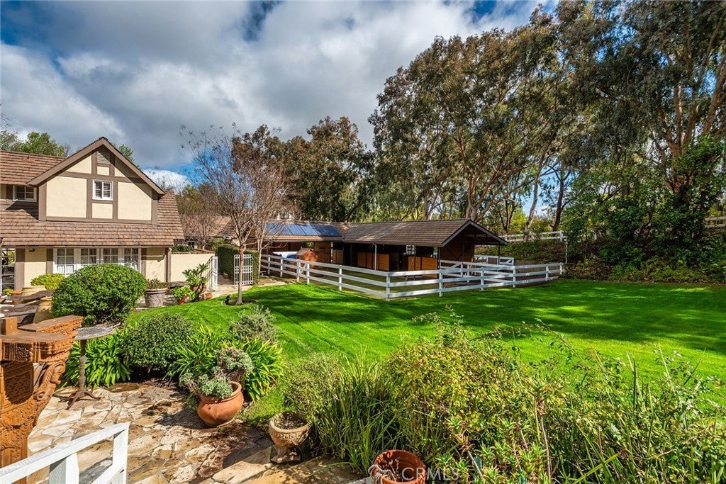 Nestled on a quiet cul-de-sac in the guard gated community of Hidden Hills, this charming, fully furnished, approximate 6,500 square-foot estate sits on a very private and lushly landscaped 1.48-acre lot. Nicely upgraded throughout, this mostly one story home features a main house and a guest house with a total of 7 bedrooms and 7 baths. The elegant primary suite encompasses the upstairs, offering wonderful privacy, a light-filled bathroom with glass encased steam shower, soaking tub, and a generous walk-in closet with center island. On the main level you'll find the beautiful, center island kitchen with Viking appliances, an adjoining breakfast room, both flowing into the spacious family room with fireplace & wet bar, plus a sunny formal dining room, a 248 bottle wine cellar, cozy home theater, and your own gym! The guest house includes a kitchen, family area, large game room with pool table, and 2 bedrooms. The very private grounds feature a sparkling, solar heated pool & spa with waterfalls, a covered patio complete with barbecue center, a Koi pond, a large grass lawn surrounded by mature trees, an equestrian barn with a turnout area, a chicken coop with happy residents, and a circular driveway, bordered by a rose garden. You can also enjoy the community amenities such as direct access to 25 miles of scenic equestrian & pedestrian trails, a private community park, tennis, pickleball, and sports courts, barbecue area, and more. Offering a blend of traditional charm and modern amenities, this charming home is available for occupancy as of January 17th.