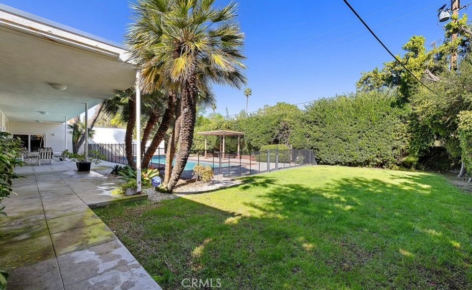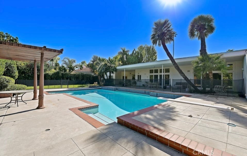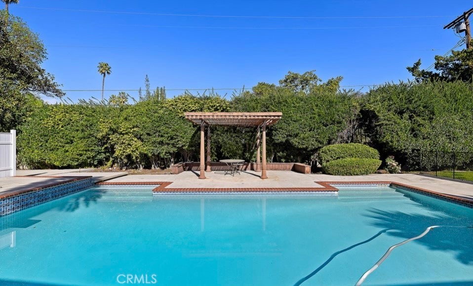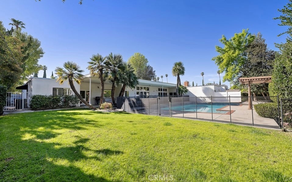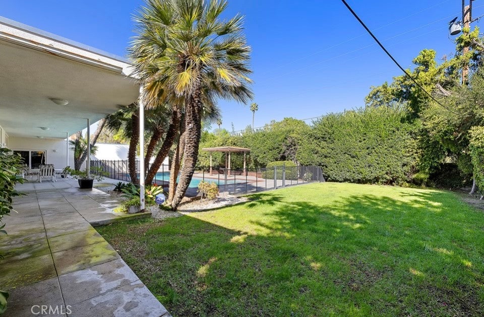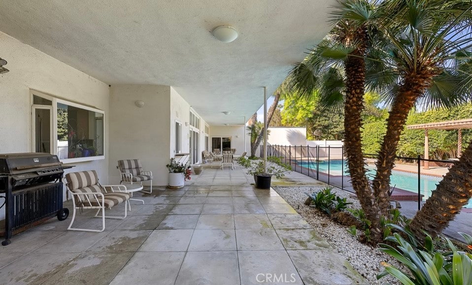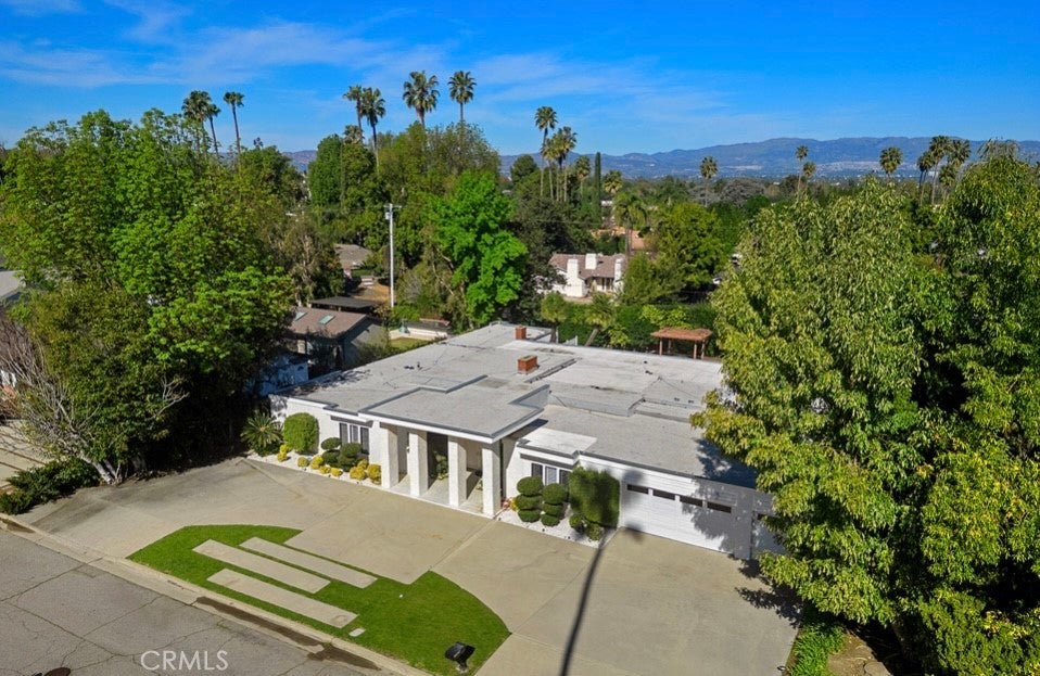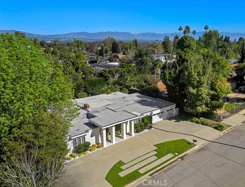 This single-story midcentury modern residence offers approximately 4,400 square feet of living space on an expansive .38-acre cul-de-sac lot, ideally located south of Ventura Boulevard in Woodland Hills. The functional floor plan includes five bedrooms and five bathrooms, spacious living and family rooms with fireplaces, and a formal dining room suitable for entertaining. The kitchen features custom cabinetry, built in refrigerator, a walk-in pantry, tile flooring, and a breakfast area with direct access to the family room. The backyard offers a pool, grassy area, basketball half court, and a large, covered patio, providing multiple options for outdoor use. Additional features include a primary suite with fireplace, sitting area, and dual walk-in closets, a laundry room with sink and cabinetry, recessed lighting, copper plumbing, and a three-car attached garage. Conveniently located near shopping, dining, and local amenities, this property provides the benefit of single-level living on a generous lot.