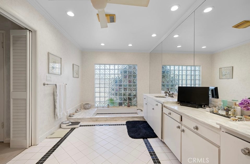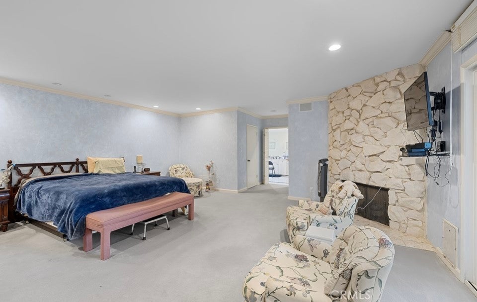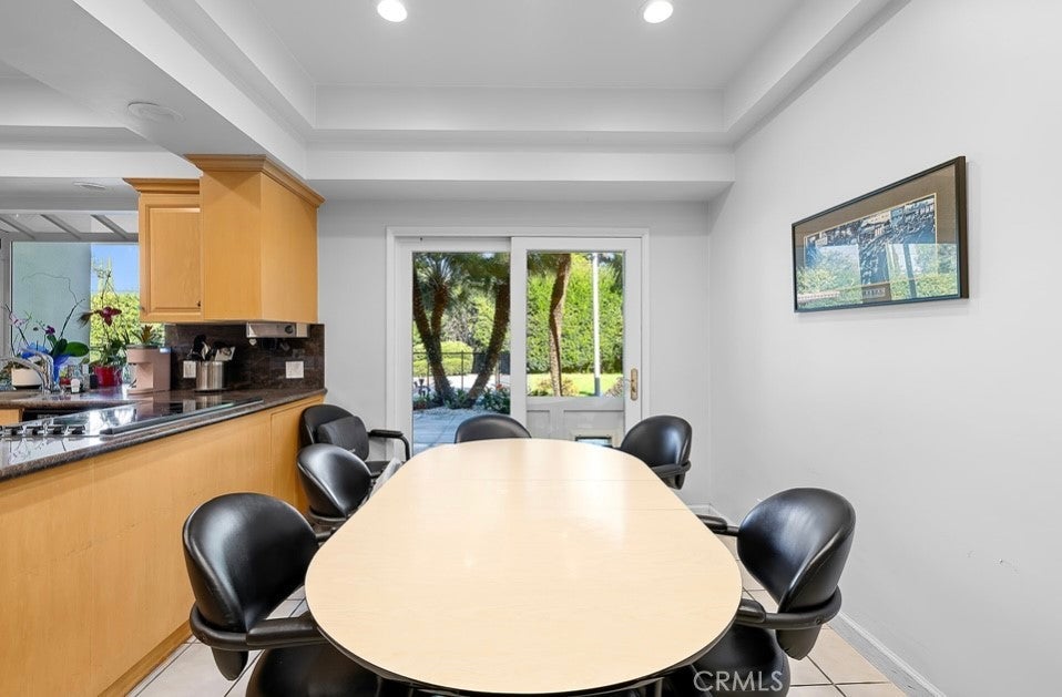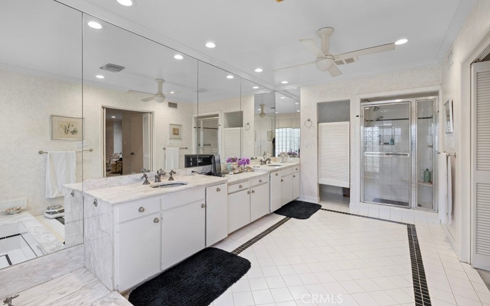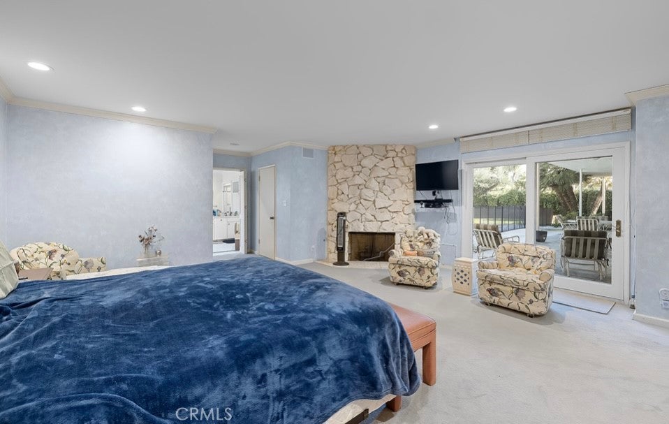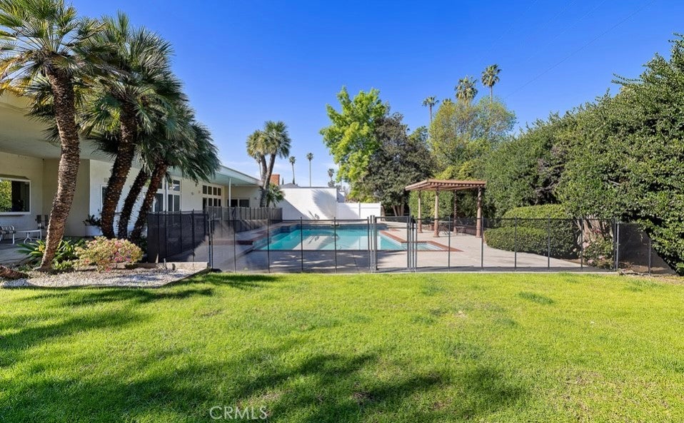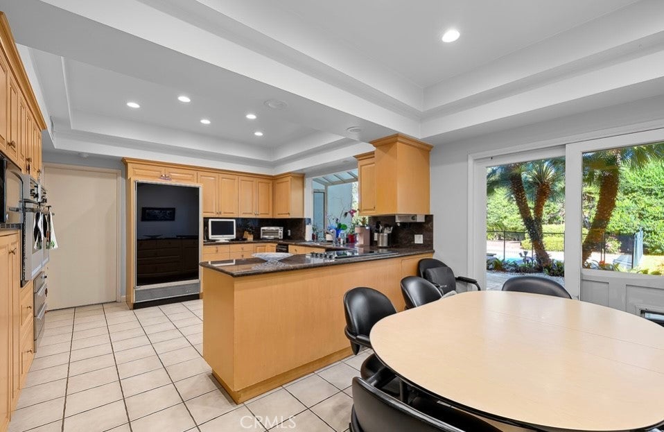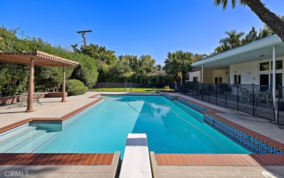 This single-story midcentury modern residence offers approximately 4,400 square feet of living space on an expansive .38-acre cul-de-sac lot, ideally located south of Ventura Boulevard in Woodland Hills. The functional floor plan includes five bedrooms and five bathrooms, spacious living and family rooms with fireplaces, and a formal dining room suitable for entertaining. The kitchen features custom cabinetry, built in refrigerator, a walk-in pantry, tile flooring, and a breakfast area with direct access to the family room. The backyard offers a pool, grassy area, basketball half court, and a large, covered patio, providing multiple options for outdoor use. Additional features include a primary suite with fireplace, sitting area, and dual walk-in closets, a laundry room with sink and cabinetry, recessed lighting, copper plumbing, and a three-car attached garage. Conveniently located near shopping, dining, and local amenities, this property provides the benefit of single-level living on a generous lot.