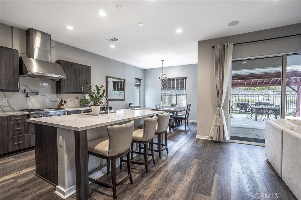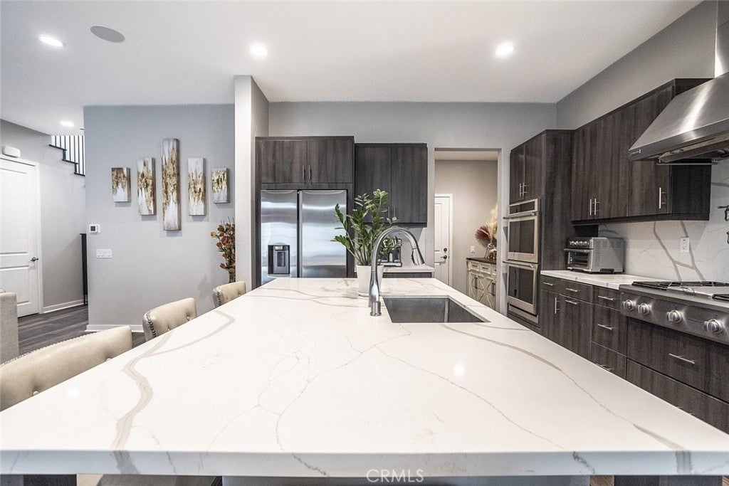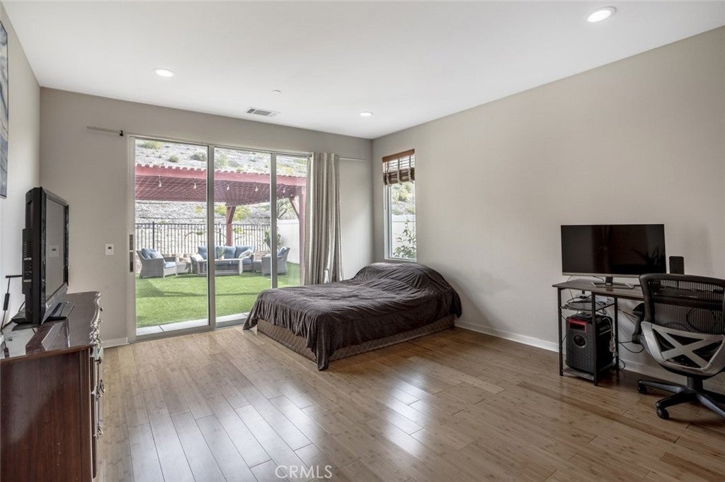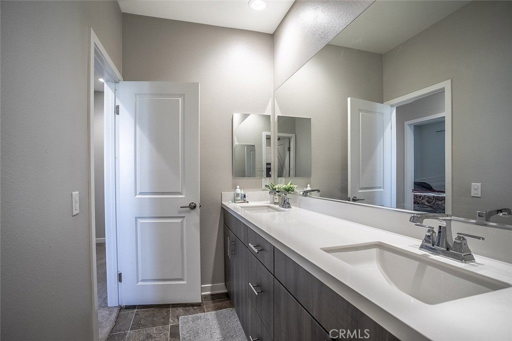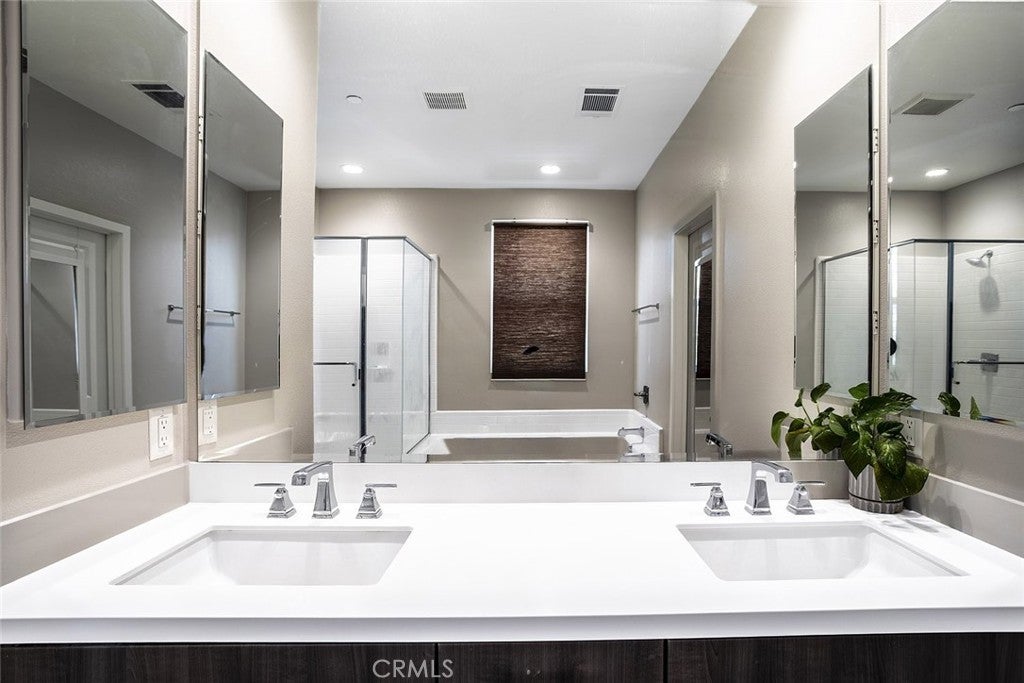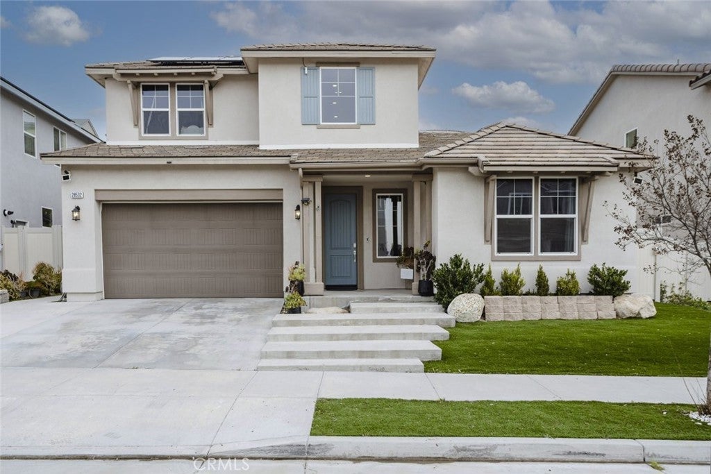 Beautifully maintained two story home located in a desirable Santa Clarita neighborhood, offering approximately 2,932 square feet of well designed living space on a 6,223 square foot lot. This spacious residence features 4 bedrooms and 3 bathrooms, including two primary bedrooms, providing flexibility for multigenerational living, guests, or extended household needs. The interior showcases an open and inviting floor plan filled with natural light, wide plank flooring, and a seamless flow between the living, dining, and kitchen areas. The kitchen features modern cabinetry, generous counter space, a large center island with seating, and stainless steel appliances, making it ideal for everyday living and entertaining. Dining and living areas open toward the backyard, creating a comfortable indoor outdoor connection. Both primary bedrooms are generously sized and include private en suite bathrooms with dual vanities and walk in shower enclosures. Secondary bedrooms offer versatile use for guest rooms, home office, or additional living needs. Bathrooms throughout the home reflect contemporary finishes and a clean, modern aesthetic. The backyard provides a private outdoor setting with a covered patio, landscaped lawn, and space for outdoor dining or relaxation. A two car attached garage offers convenient parking and additional storage. Residents enjoy access to all Skyline community amenities, including a guest house, pool house, resort style pool, clubhouse, tennis court, and scenic hiking trails. Conveniently located near parks, schools, shopping, dining, and major access routes, this home offers a balance of comfort, functionality, and community lifestyle.