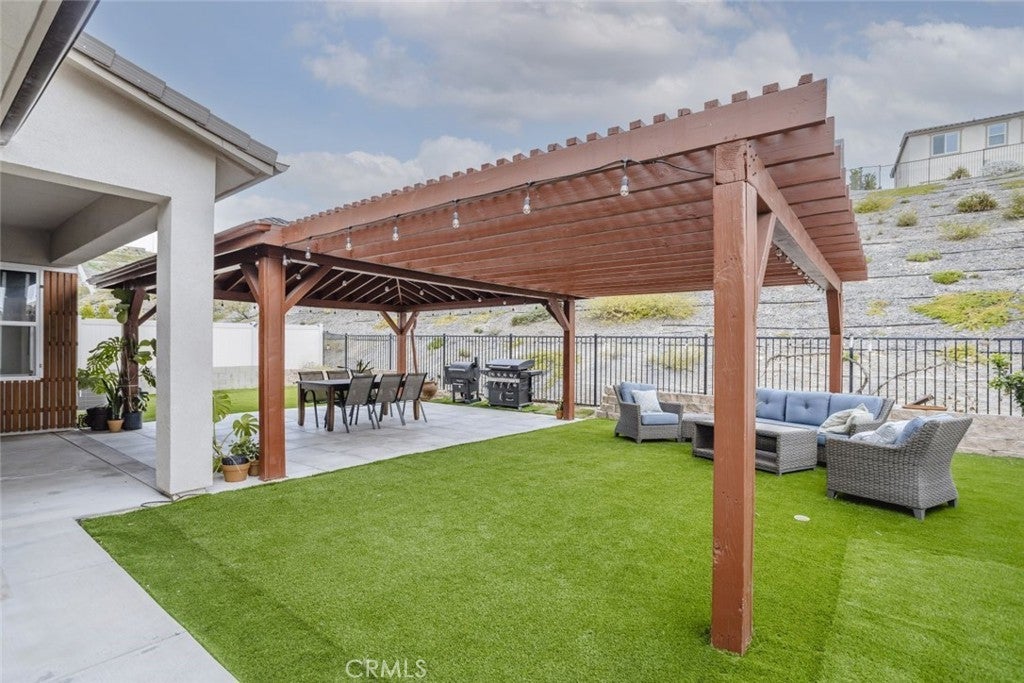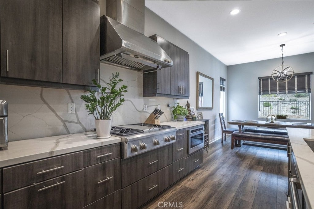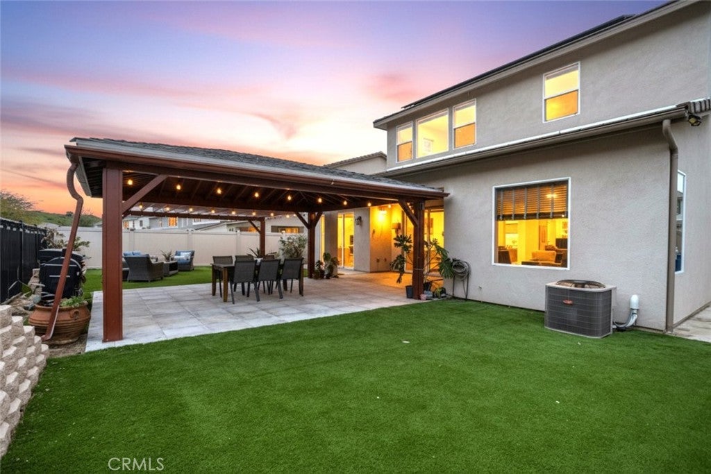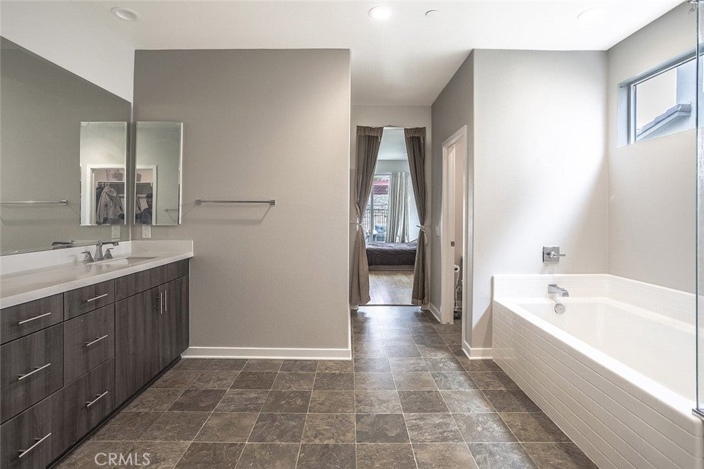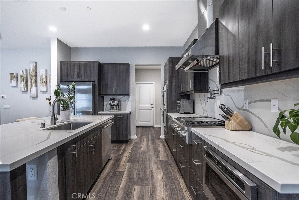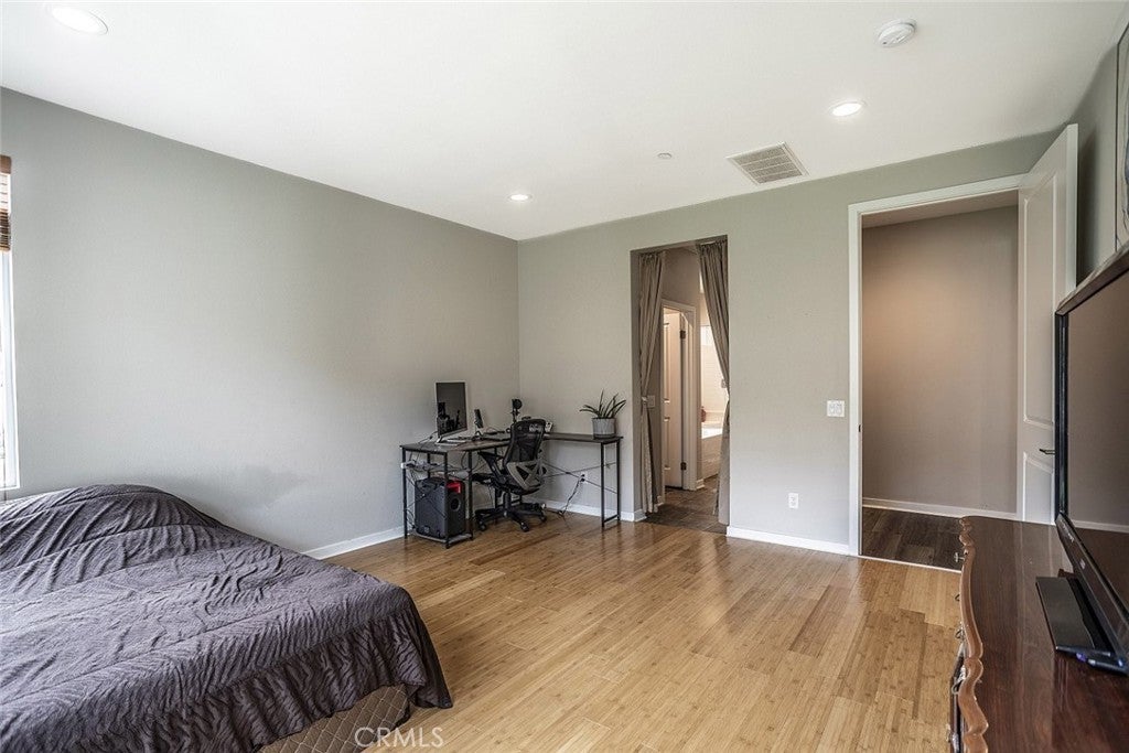 Beautifully maintained two story home located in a desirable Santa Clarita neighborhood, offering approximately 2,932 square feet of well designed living space on a 6,223 square foot lot. This spacious residence features 4 bedrooms and 3 bathrooms, including two primary bedrooms, providing flexibility for multigenerational living, guests, or extended household needs. The interior showcases an open and inviting floor plan filled with natural light, wide plank flooring, and a seamless flow between the living, dining, and kitchen areas. The kitchen features modern cabinetry, generous counter space, a large center island with seating, and stainless steel appliances, making it ideal for everyday living and entertaining. Dining and living areas open toward the backyard, creating a comfortable indoor outdoor connection. Both primary bedrooms are generously sized and include private en suite bathrooms with dual vanities and walk in shower enclosures. Secondary bedrooms offer versatile use for guest rooms, home office, or additional living needs. Bathrooms throughout the home reflect contemporary finishes and a clean, modern aesthetic. The backyard provides a private outdoor setting with a covered patio, landscaped lawn, and space for outdoor dining or relaxation. A two car attached garage offers convenient parking and additional storage. Residents enjoy access to all Skyline community amenities, including a guest house, pool house, resort style pool, clubhouse, tennis court, and scenic hiking trails. Conveniently located near parks, schools, shopping, dining, and major access routes, this home offers a balance of comfort, functionality, and community lifestyle.