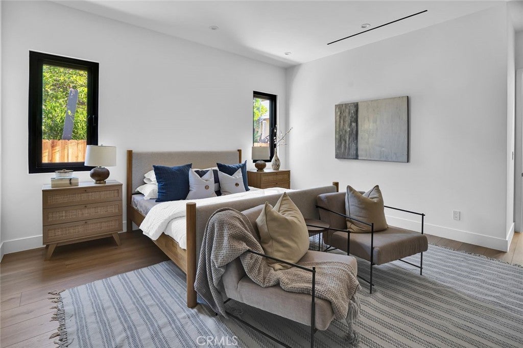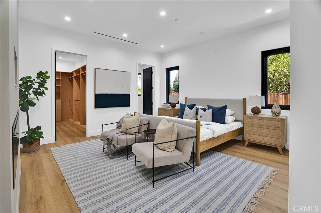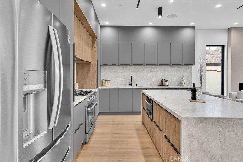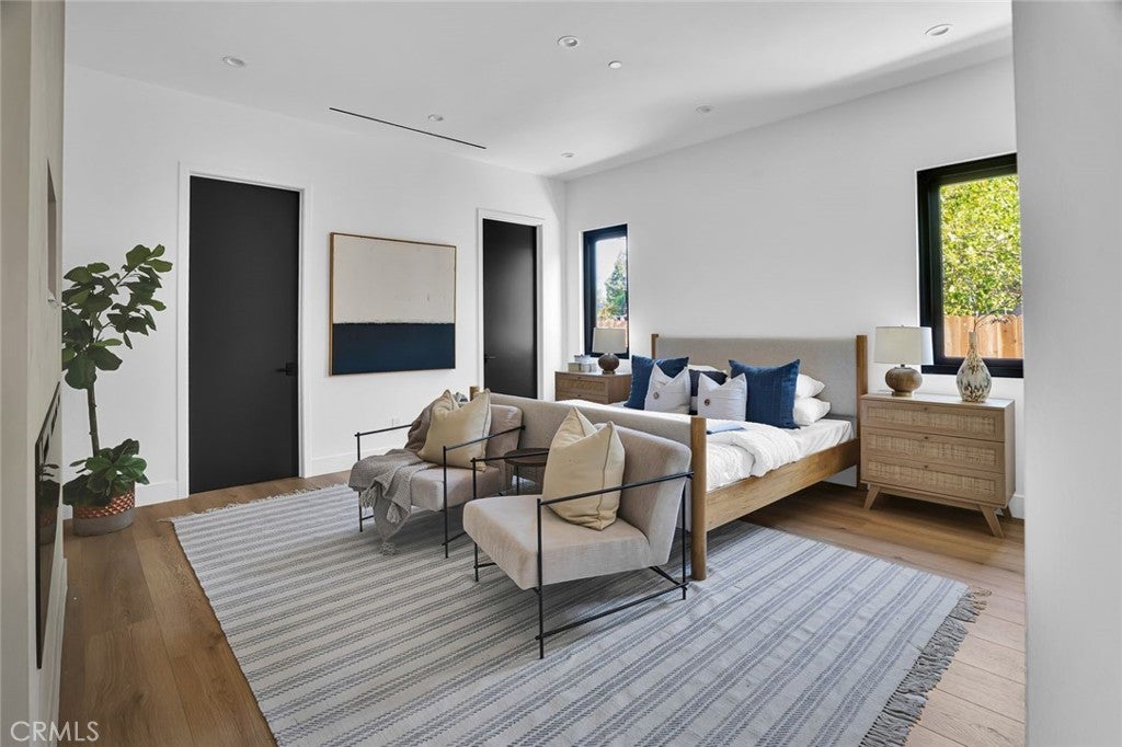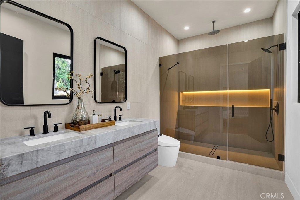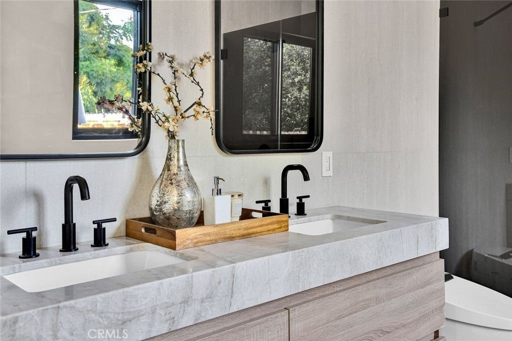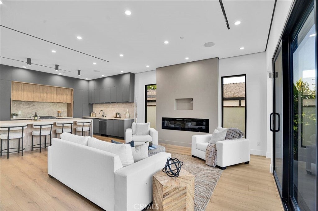 Come see this beautifully almost brand new- 3-bedroom, 3.5-bathroom pool home in Encino, offering 2,107 sq. ft. of stylish living space. The impressive 12-foot-high entry ceiling and pivot front door create a grand first impression, while high ceilings of 10 feet, throughout the house, make the home feel open and spacious. The layout includes a generous junior suite and a large primary master bedroom with a stunning walk-in closet and fireplace. The brand-new chef’s kitchen has plenty of cabinets, brand new appliances and features Taj Mahal natural stone countertops and backsplash, opening to the dining and family room for effortless entertaining. Recessed lighting throughout the house, family room has a modern fireplace. Large sliding doors flood the space with natural light and connect you to the backyard retreat. Outside, enjoy the sparkling Baja-style pool with mini pebble plaster finish, surrounded by drought-resistant landscaping and synthetic grass for year-round beauty and low maintenance. This modern home has been thoughtfully upgraded with new heating and air conditioning, updated electrical and plumbing, and built-in sound speakers in the living area. This beautiful home has a laundry room with ample cabinets. There is a solar panel system. Located close to shops, parks, and quick access to the 101 Freeway, this home blends convenience with luxurious California living.