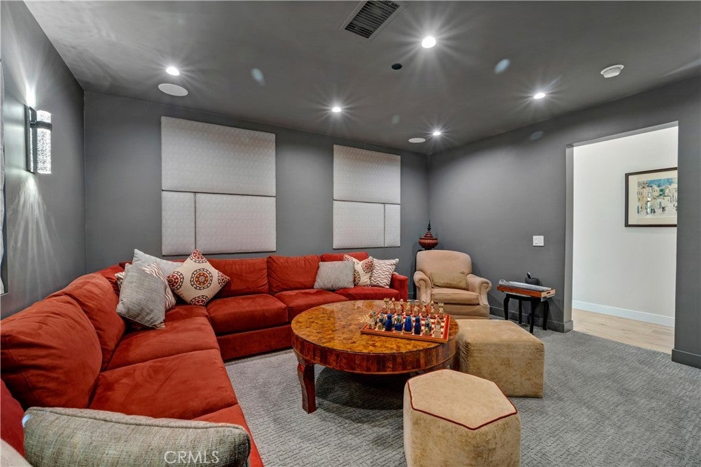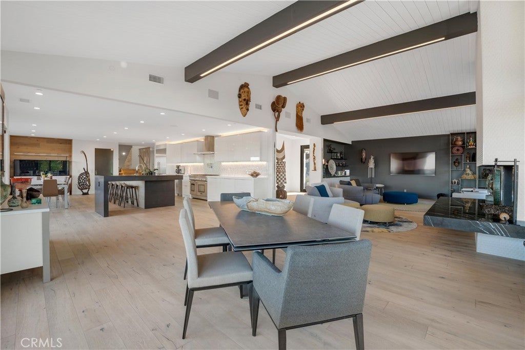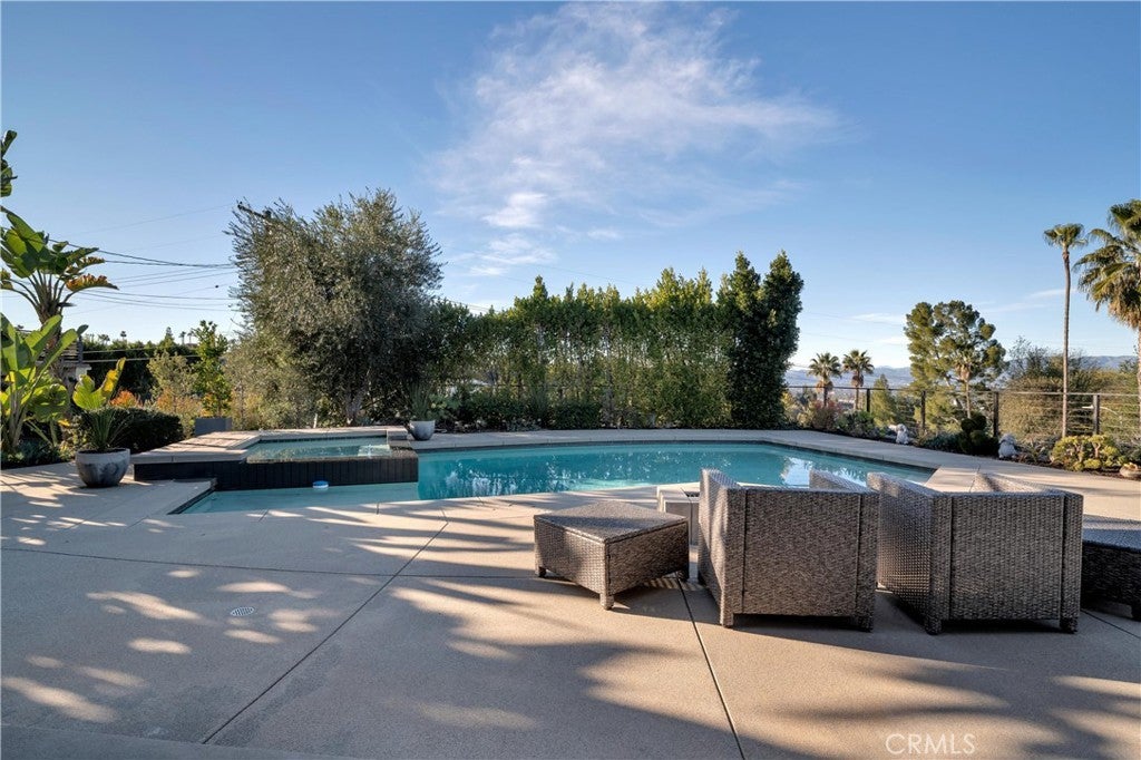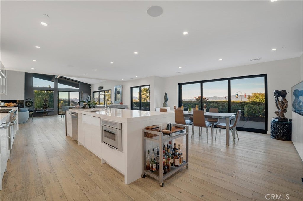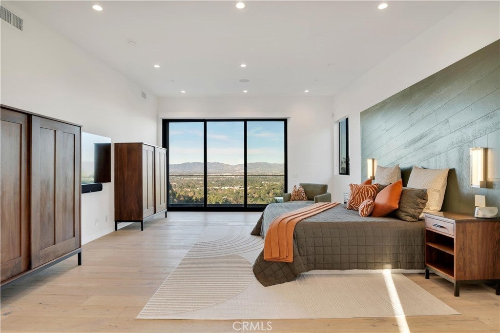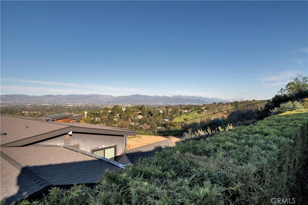 Set high above the city in the Encino Hills—where sky, light, and landscape converge—this privately gated residence offers a rare sense of seclusion paired with commanding, cinematic views. Adjacent to the Encino Reservoir and perched to capture sweeping 180-degree panoramas across the San Fernando Valley, the home feels suspended above it all: quiet, luminous, and profoundly private. Spanning approximately 4,755 square feet, this 5-bedroom, 5.5-bath home is a refined contemporary reimagining of its mid-century origins, fully rebuilt in 2019 with exceptional taste and architectural restraint. Walls of glass dissolve the boundary between indoors and out, framing the ever-changing valley below and bathing the interiors in natural light from dawn through dusk. A long, gated approach heightens the sense of arrival. Inside, a dramatic great room unfolds with soaring vaulted, beam-accented ceilings, an oversized statement fireplace, and a built-in bar—an expansive yet intimate space designed for both quiet evenings and large-scale entertaining. The home flows effortlessly to outdoor terraces, where the view remains the constant focal point. The open kitchen is sleek and purposeful, anchored by a generous central island, custom cabinetry, and high-end appliances, with a sunlit breakfast area positioned to take full advantage of the vistas. Multiple ensuite bedrooms provide flexibility for guests, office, gym, or media use, including a sound-insulated den or theater. Upstairs, the primary suite is a true sanctuary, featuring dual walk-in closets, a spa-caliber bath, and a private glass-railed balcony floating above the valley. Outdoors, the property becomes a private hillside resort: wraparound patios, pool with Baja shelf and spa, firepit, outdoor kitchen, lush landscaping, mature fruit trees, and abundant rose gardens. Thoughtfully rebuilt with luxury finishes, fire sprinklers, tankless water heaters, and an attached two-car garage, this is a home where design, engineering, and setting align—minutes from Ventura Boulevard, Mulholland, and the Sepulveda Pass. This is not simply a house with a view, but a rare vantage point above the city.