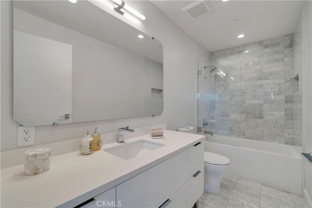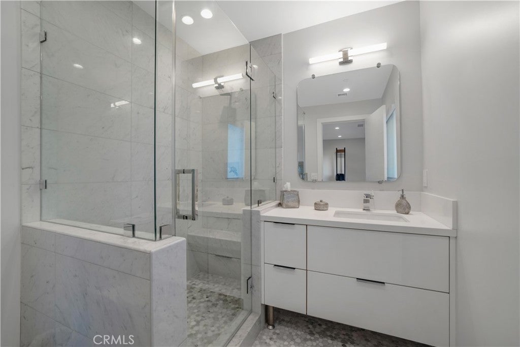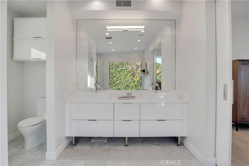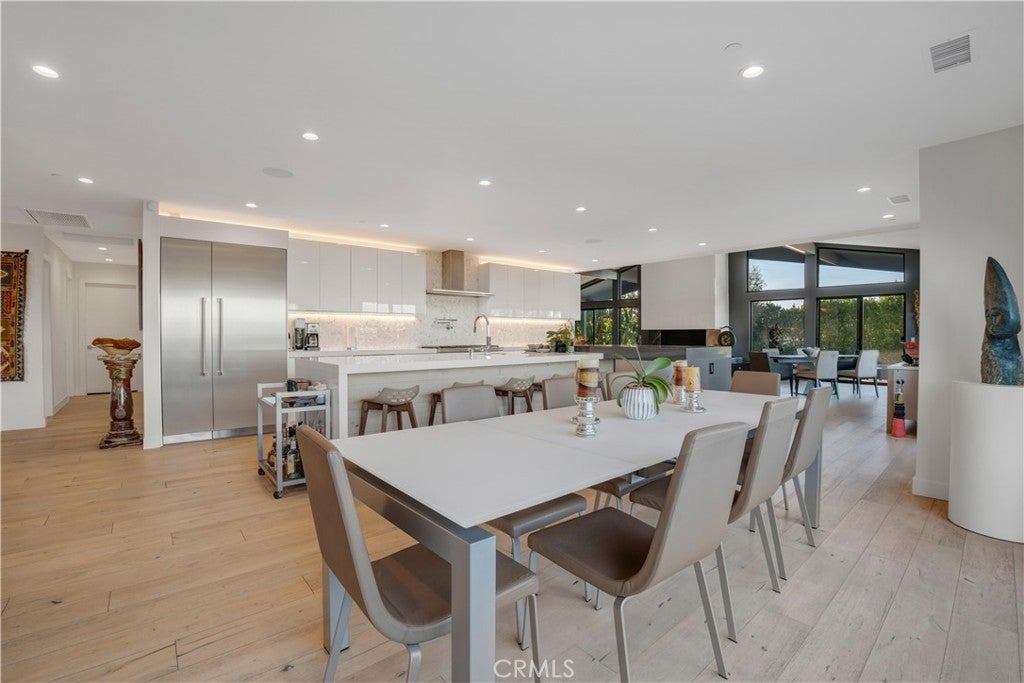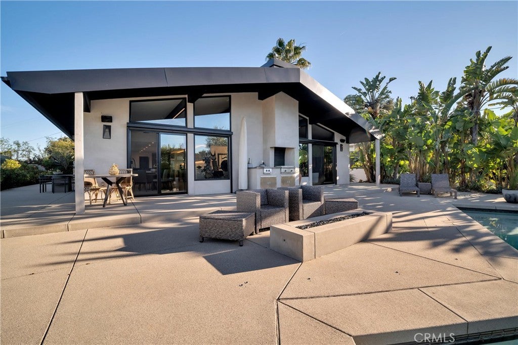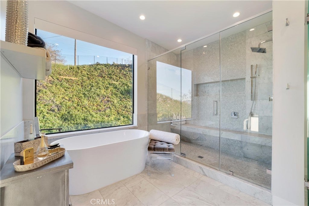 Set high above the city in the Encino Hills—where sky, light, and landscape converge—this privately gated residence offers a rare sense of seclusion paired with commanding, cinematic views. Adjacent to the Encino Reservoir and perched to capture sweeping 180-degree panoramas across the San Fernando Valley, the home feels suspended above it all: quiet, luminous, and profoundly private. Spanning approximately 4,755 square feet, this 5-bedroom, 5.5-bath home is a refined contemporary reimagining of its mid-century origins, fully rebuilt in 2019 with exceptional taste and architectural restraint. Walls of glass dissolve the boundary between indoors and out, framing the ever-changing valley below and bathing the interiors in natural light from dawn through dusk. A long, gated approach heightens the sense of arrival. Inside, a dramatic great room unfolds with soaring vaulted, beam-accented ceilings, an oversized statement fireplace, and a built-in bar—an expansive yet intimate space designed for both quiet evenings and large-scale entertaining. The home flows effortlessly to outdoor terraces, where the view remains the constant focal point. The open kitchen is sleek and purposeful, anchored by a generous central island, custom cabinetry, and high-end appliances, with a sunlit breakfast area positioned to take full advantage of the vistas. Multiple ensuite bedrooms provide flexibility for guests, office, gym, or media use, including a sound-insulated den or theater. Upstairs, the primary suite is a true sanctuary, featuring dual walk-in closets, a spa-caliber bath, and a private glass-railed balcony floating above the valley. Outdoors, the property becomes a private hillside resort: wraparound patios, pool with Baja shelf and spa, firepit, outdoor kitchen, lush landscaping, mature fruit trees, and abundant rose gardens. Thoughtfully rebuilt with luxury finishes, fire sprinklers, tankless water heaters, and an attached two-car garage, this is a home where design, engineering, and setting align—minutes from Ventura Boulevard, Mulholland, and the Sepulveda Pass. This is not simply a house with a view, but a rare vantage point above the city.