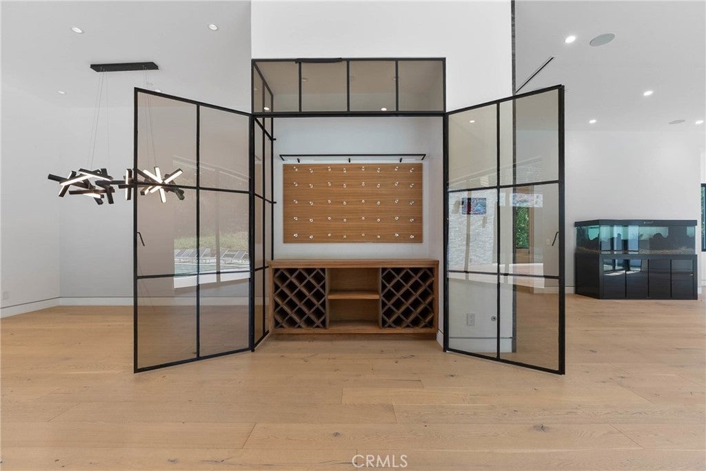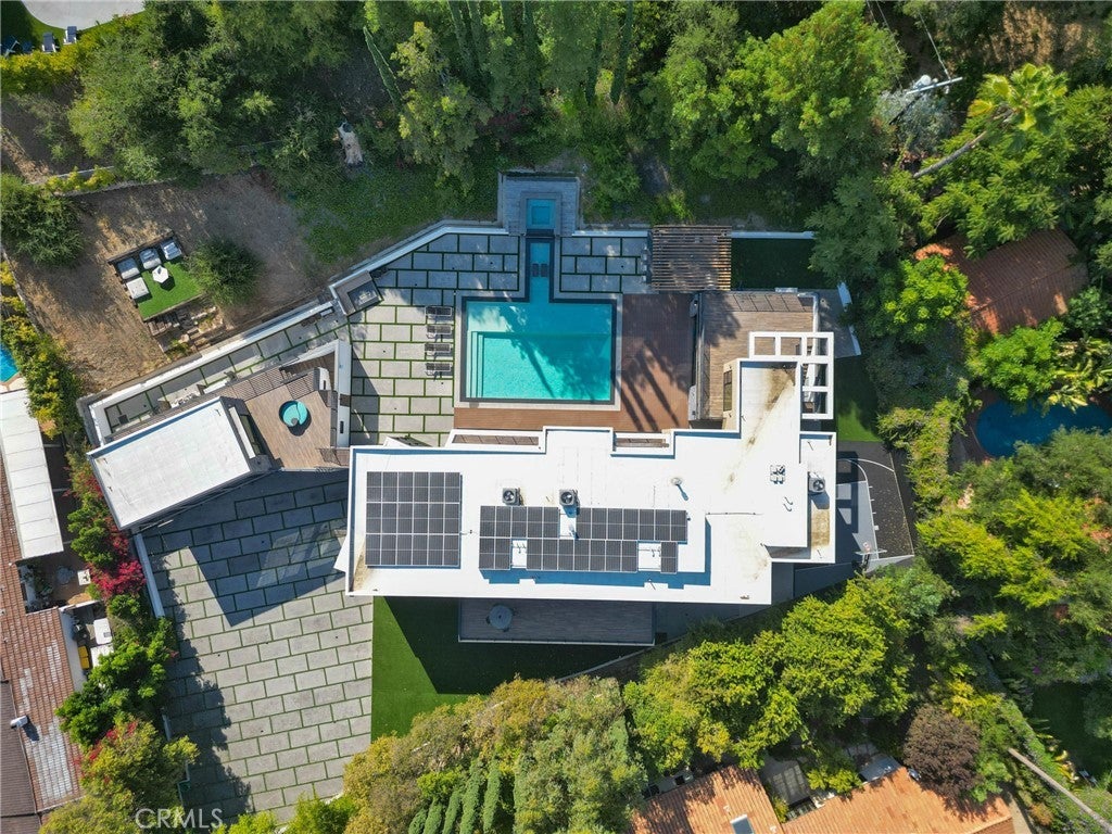 Welcome to your private sanctuary, nestled on a sprawling .68 acre wooded lot. Situated on a flag lot, this estate sits far from the street, ensuring unmatched privacy. A gated entrance and extended driveway lead to a spacious three car garage, with ample additional parking for guests. Step through the breathtaking glass entryway, where soaring 32-foot ceilings, a dramatic chandelier, and striking white oak floating stairs set the stage for this architectural masterpiece. Walls of glass and Fleetwood sliding doors seamlessly blend indoor and outdoor living, flooding the space with natural light and creating an entertainer’s dream. The open concept layout is anchored by stunning oak floors and a sophisticated Italian designed kitchen, featuring a hidden oversized pantry and a wine fridge, perfectly positioned beside an elegant formal dining area. The lower level boasts two ensuite bedrooms, a private office, and a state-of-the-art theater, ensuring ultimate comfort and convenience. Upstairs, the primary suite is a true retreat, complete with a cozy fireplace, a custom walk-in closet, and a spa inspired bath. A private sitting area and relaxation patio offer a peaceful escape. Above the garage, a versatile space awaits, ideal for a gym, studio, or guest quarters, opening onto a spacious outdoor terrace. Step outside into an entertainer’s paradise, featuring a zero edge saltwater pool and spa, a sleek cabana, a fully equipped pool house, and a basketball court. Multiple outdoor patios provide the perfect setting for dining and relaxation, while paid-for solar panels add a modern touch of efficiency. Experience the pinnacle of luxury living, where privacy, elegance, and resort style amenities come together in perfect harmony.