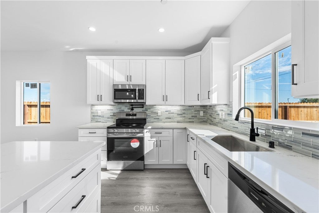 New to market and ready to impress! This stunning single-story home showcases exceptional craftsmanship with newly constructed beautiful finishes throughout. The thoughtful functional layout maximizes every square foot of the generous 1850 square feet of living space. Step into the heart of the home where the kitchen truly shines with granite countertops, a convenient island featuring a breakfast bar, and quality stainless steel appliances. The mosaic backsplash adds an elegant touch while the adjacent dining area creates perfect flow for entertaining. You'll love the laminate flooring that extends throughout the home, complemented by abundant natural light that creates a warm, welcoming atmosphere. The highly desirable open floor plan features a grand living space enhanced by modern recessed lighting, making it ideal for both relaxation and gatherings. The thoughtful design places the primary bedroom in a separate wing of the home, offering privacy and tranquility away from the main living areas. The two additional bedrooms are notably spacious, providing flexibility for family, guests, or home office needs. Two well-appointed bathrooms serve the home efficiently. As an added bonus that's hard to find, this property includes fully paid solar panels, delivering immediate savings on energy costs while supporting sustainable living. Located in California City with convenient access to local amenities, this home sits within reach of Balsitis Park for outdoor recreation opportunities. The combination of modern finishes, practical layout, and energy-efficient features creates an exceptional value in today's market. This property won't last long in this competitive environment.