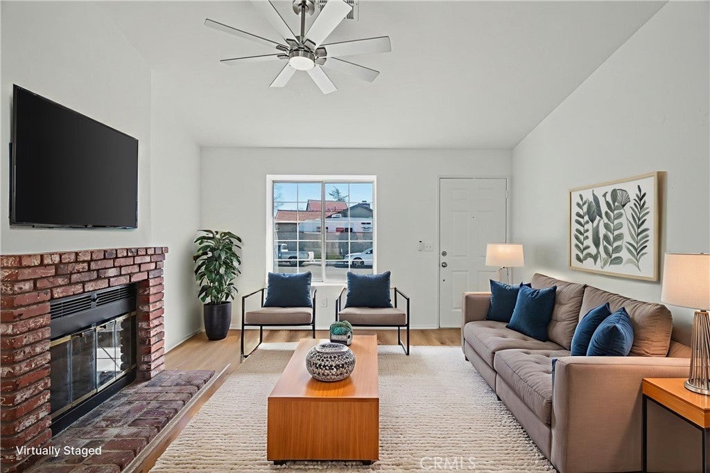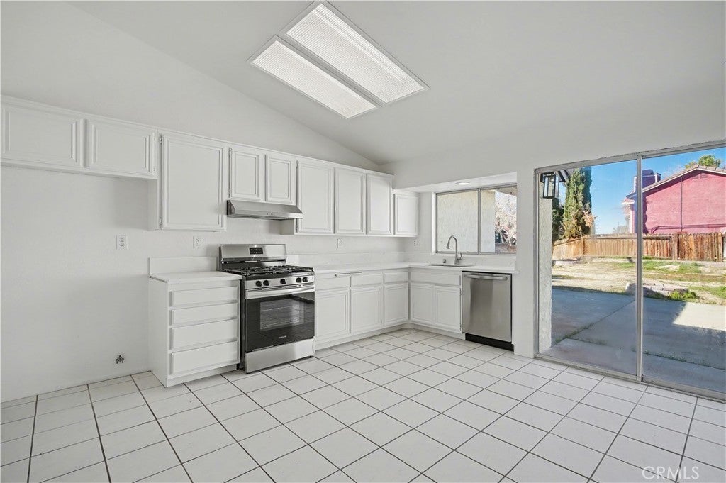 Beautifully updated 3 bed + 2 bath cul-de-sac home offering 1,206 sq. ft. of living space on a 8,339 sq. ft. lot. Newly landscaped front yard leads to the living room which features brand-new luxury vinyl plank flooring and a classic brick fireplace, creating a warm and inviting space. The refreshed kitchen includes brand-new stainless steel appliances and quartz countertops. Sliding patio doors that open directly to the backyard is ideal for indoor-outdoor entertaining. The primary bedroom features its own set of patio doors to the backyard along with an ensuite bathroom. The flat lot gives plenty of potential to personalize. Nearby attractions include the Palmdale Amphitheater, Marie Kerr Park, Antelope Valley Mall, DryTown Water Park plus the shops and dining options in Downtown Palmdale. Probate Sale. Court Confirmation NOT Required. Some photos have been virtually staged.
