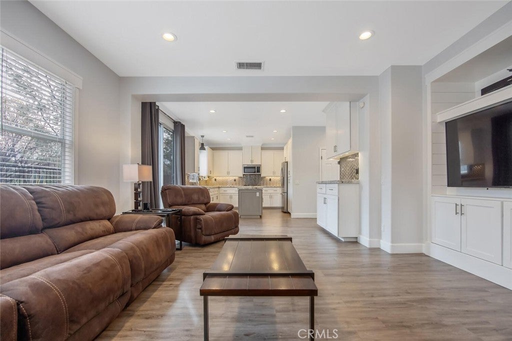 Beautifully upgraded home filled with natural light, featuring wood-style flooring and vaulted ceilings. The open-concept family room showcases a stacked-stone fireplace and flows into a modern kitchen with granite countertops, white cabinetry, stainless steel appliances, and a spacious center island. A versatile downstairs office or bedroom includes custom built-ins and is complemented by a full bath. The generously sized primary suite offers a walk-in closet and private bath. You will also find 3 additional bedrooms - one with custom closets and cabinetry. Enjoy a private backyard with no rear neighbors, along with added conveniences such as a garage workbench and security camera wiring. Conveniently located next to HOA parks and pools!