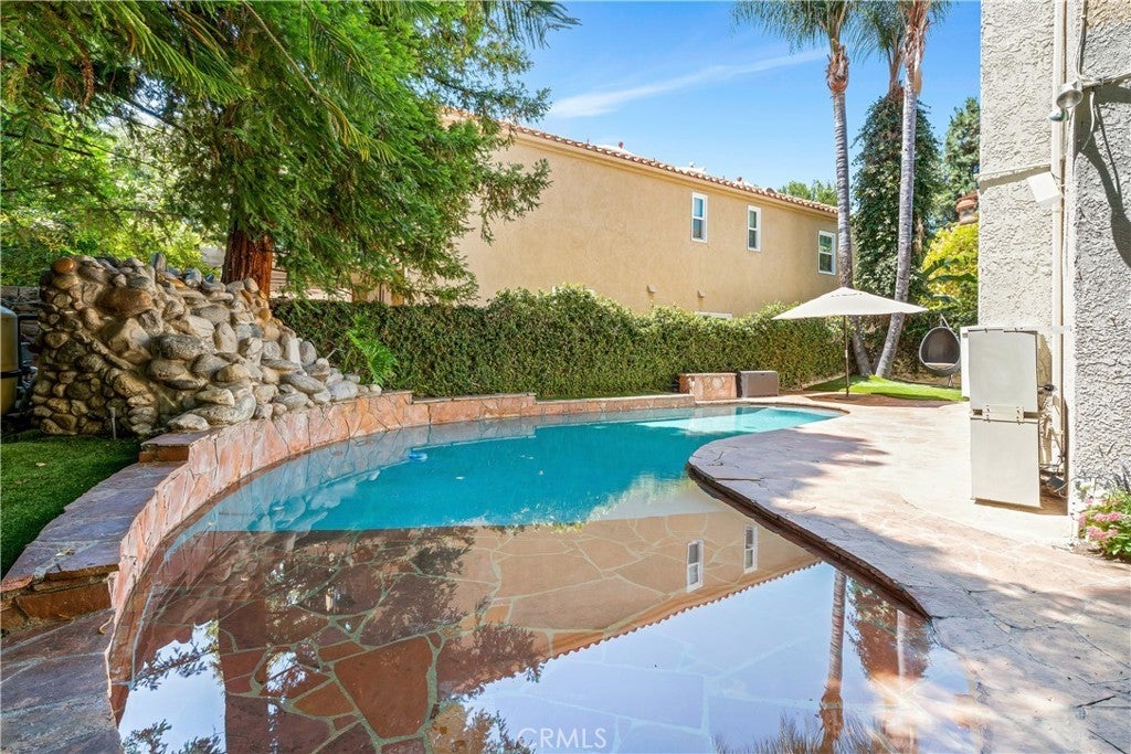 Stunning Calabasas Home with Private Pool on a Prime Cul-de-Sac Lot. Nestled on one of the most desirable streets in the exclusive gated community of Creekside, this beautifully updated home offers privacy, comfort, and luxury. Located on a quiet cul-de-sac, the property features its own resort-style beach entry pool and a serene backyard with a private patio—perfect for entertaining or relaxing. Step inside to discover a completely remodeled gourmet kitchen, completed within the past year, featuring premium finishes and modern appliances. The open-concept layout connects the kitchen seamlessly to both the family room and the dining area, creating a warm and inviting atmosphere for gatherings. The spacious living room is highlighted by soaring ceilings and a cozy fireplace, adding character and charm to the main living space. Upstairs, you'll find a luxurious primary suite with vaulted ceilings, a soaking tub, and a separate shower. Two additional generously sized bedrooms plus an office provide ample space for family or guests. This exceptional property combines the tranquility of cul-de-sac living with the benefits of a gated community and top-tier upgrades.. A must-see for anyone seeking an elegant and functional home in the heart of Calabasas. Located in the one of the best school districts, walking distance from the Commons and farmers market.