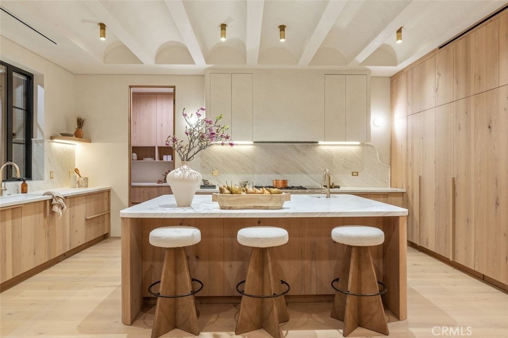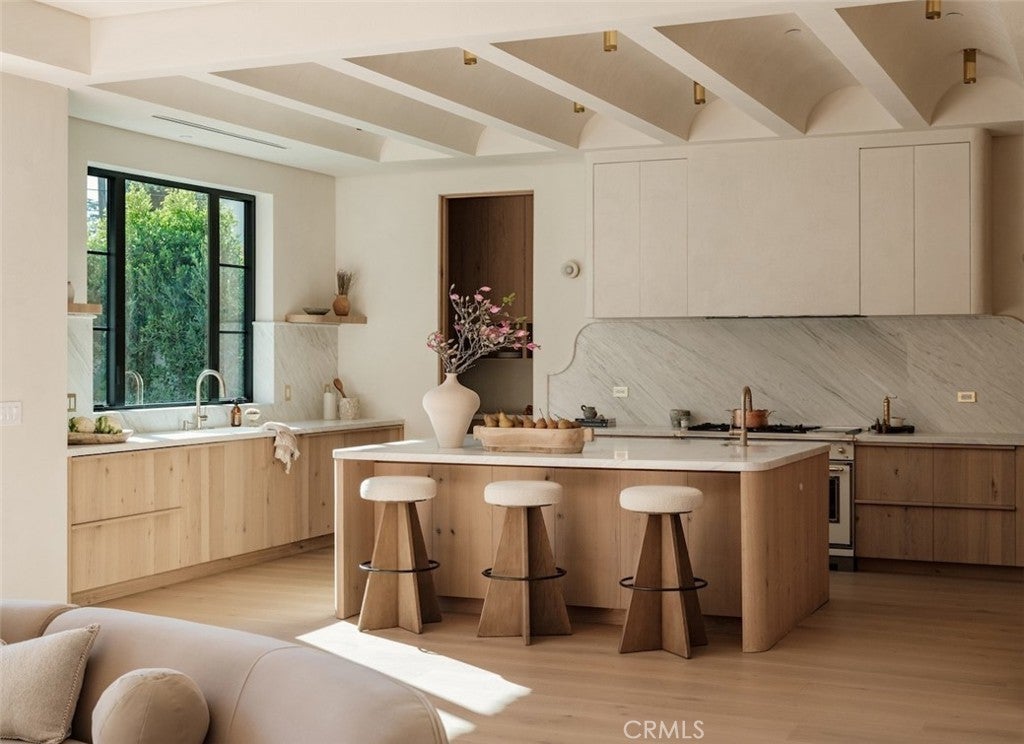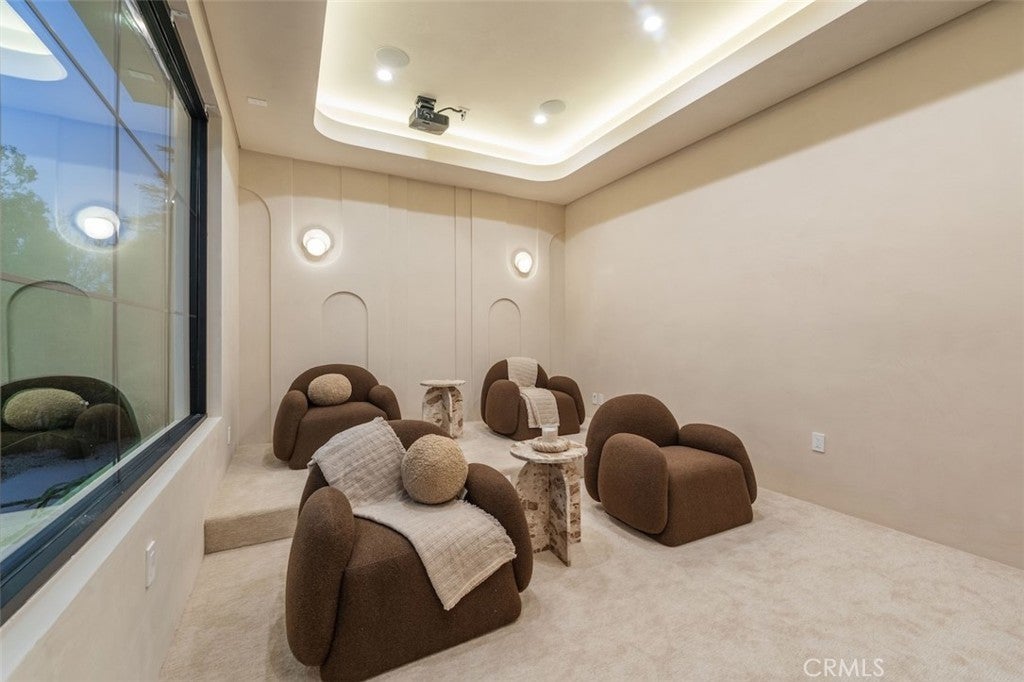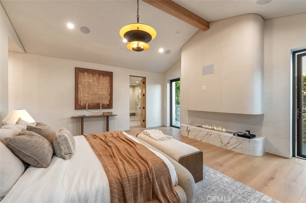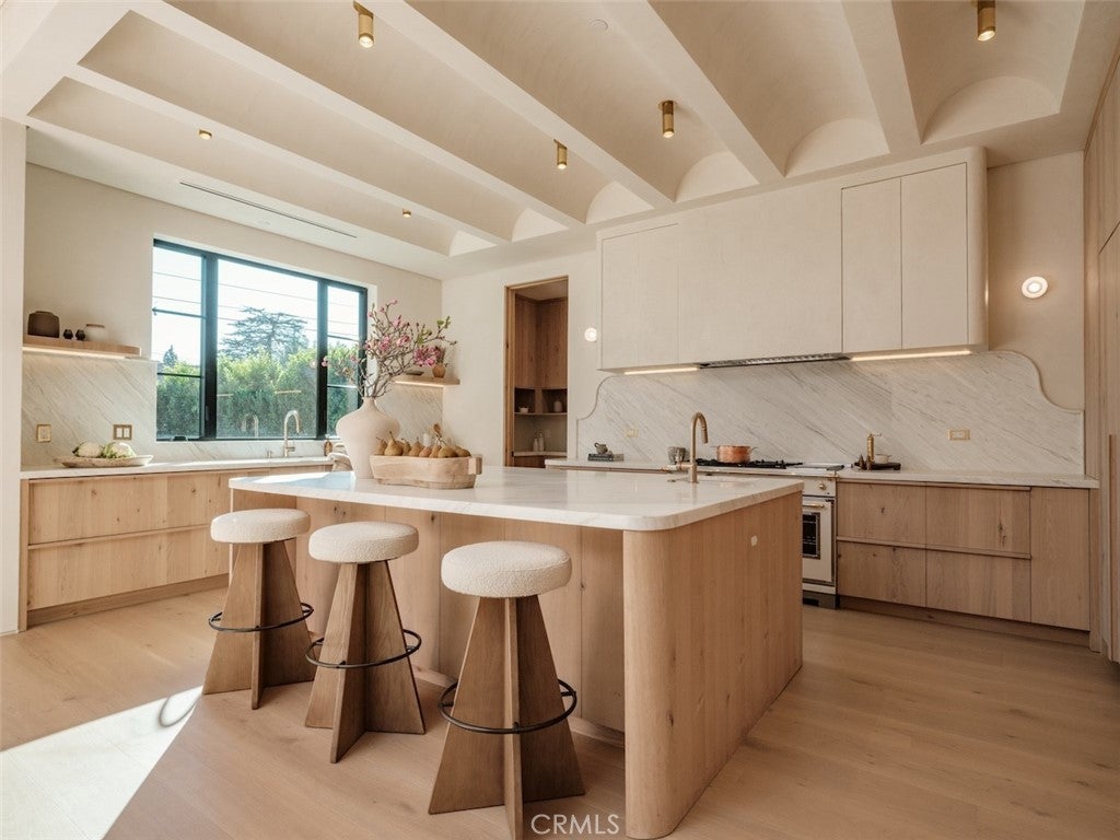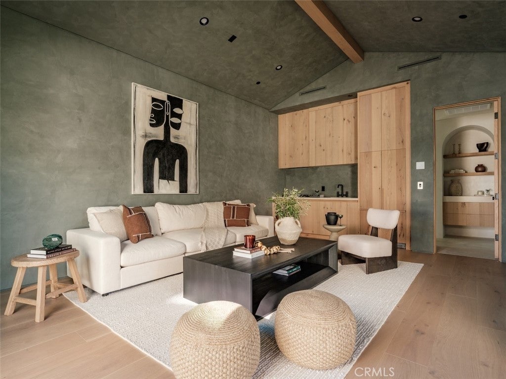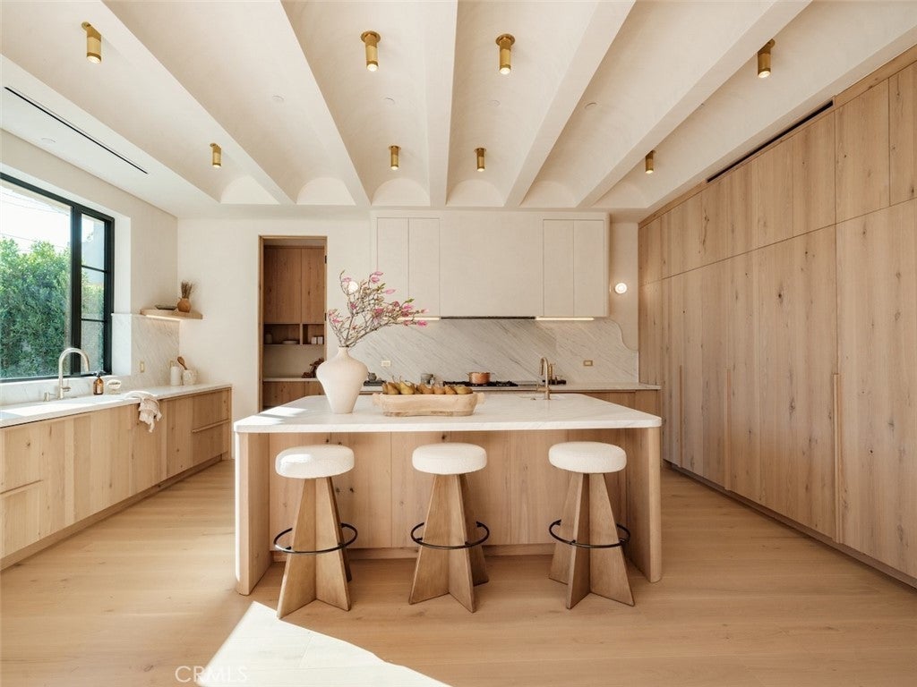 Introducing this breathtaking, one-of-a-kind home that blends sculptural architecture with warm organic materials for a serene, modern living experience. This custom-built home is situated within the highly esteemed Colfax Charter School District. Boasting 5BD/5.5BA, the property also includes a spacious casita offering open living space with an additional bedroom and bathroom. Upon entering the home, you’re welcomed by hand plastered walls, curved aesthetics, and continuous wide-plank oak flooring that guides you through sun-filled spaces. The chef’s kitchen is an organic showcase, centered around a gently rounded island, sculpted curved ceiling, rustic oak cabinetry, marble countertops, high-end appliances, and a walk-in pantry. The expansive family room features a sculpted fireplace wrapped in hand-finished brushed plaster and rustic curved shelving that enhances the warmth and texture of the space. Large sliding doors create a seamless transition between indoors and outdoors, revealing a resort-like sanctuary with a shimmering pool, spa, covered patio with a seating area and fireplace, and an outdoor cooking area, surrounded by lush greenery for ultimate privacy. The lower level features a cozy movie theater, an ensuite guest bedroom, and a powder room. Upstairs, the primary suite becomes a retreat of its own, boasting a softly rounded fireplace, a generous walk-in closet, and a large balcony with views of the tranquil, tropically landscaped yard. The spa-inspired primary bathroom offers a soaking tub, walk-in shower, and dual vanities finished in micro-cement and natural stone. Three additional ensuite bedrooms and a large laundry room complete the upper level. Enhanced with premium features including Control4 smart technology, whole-home surround sound, a security system with cameras, and energy-efficient solar panels, this home is both luxurious and thoughtfully connected. Located in the highly coveted community of Valley Village.