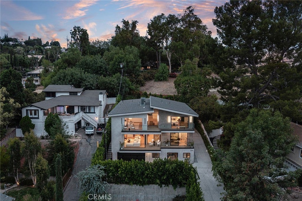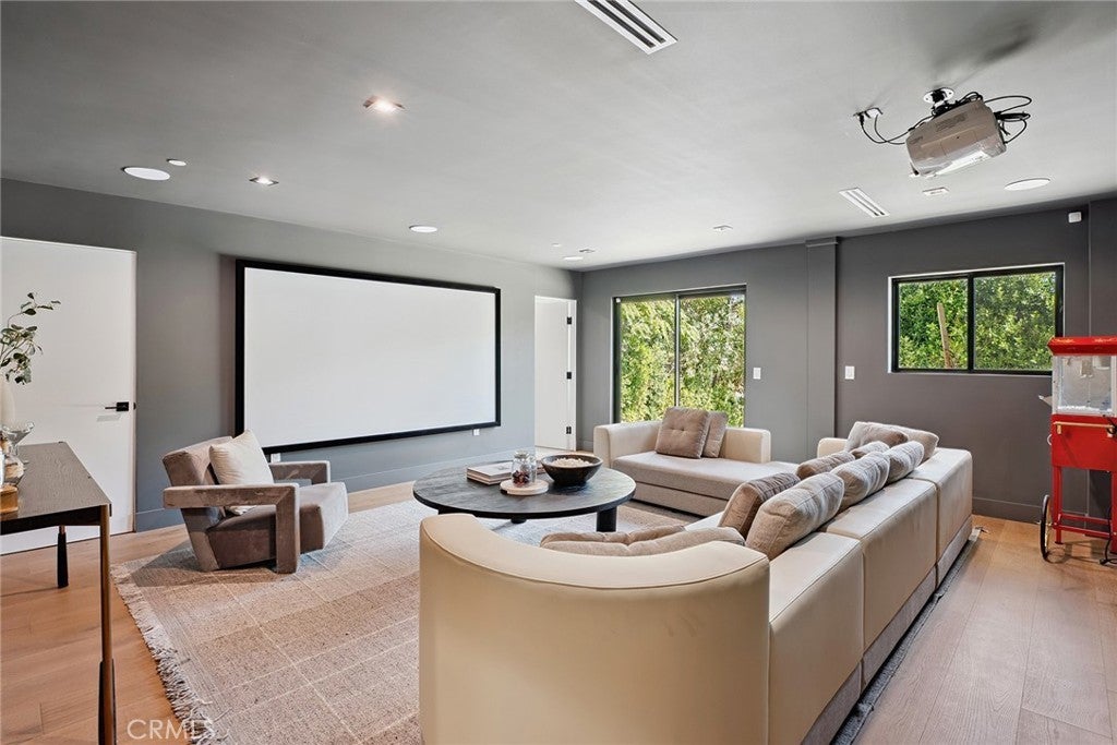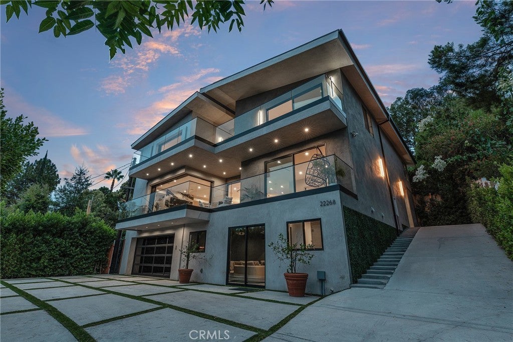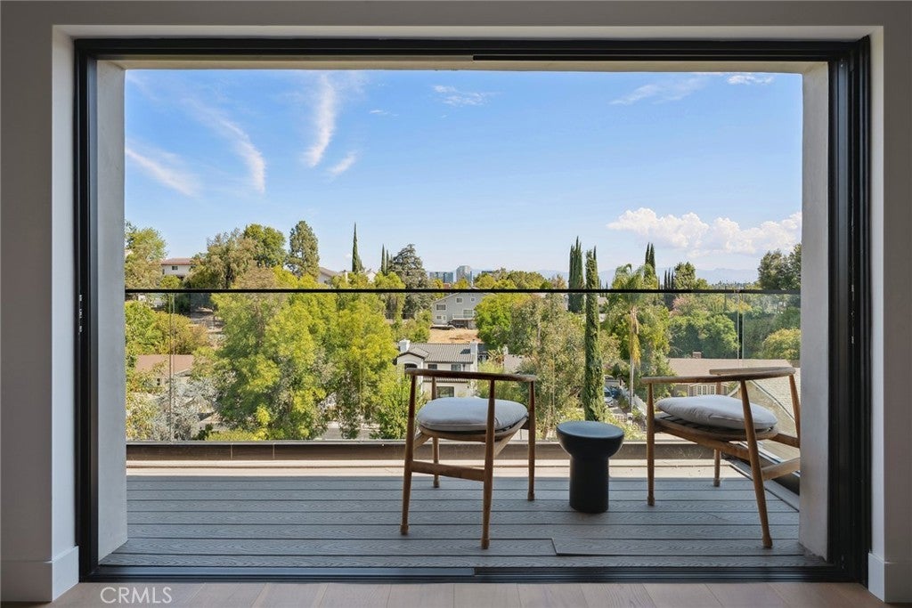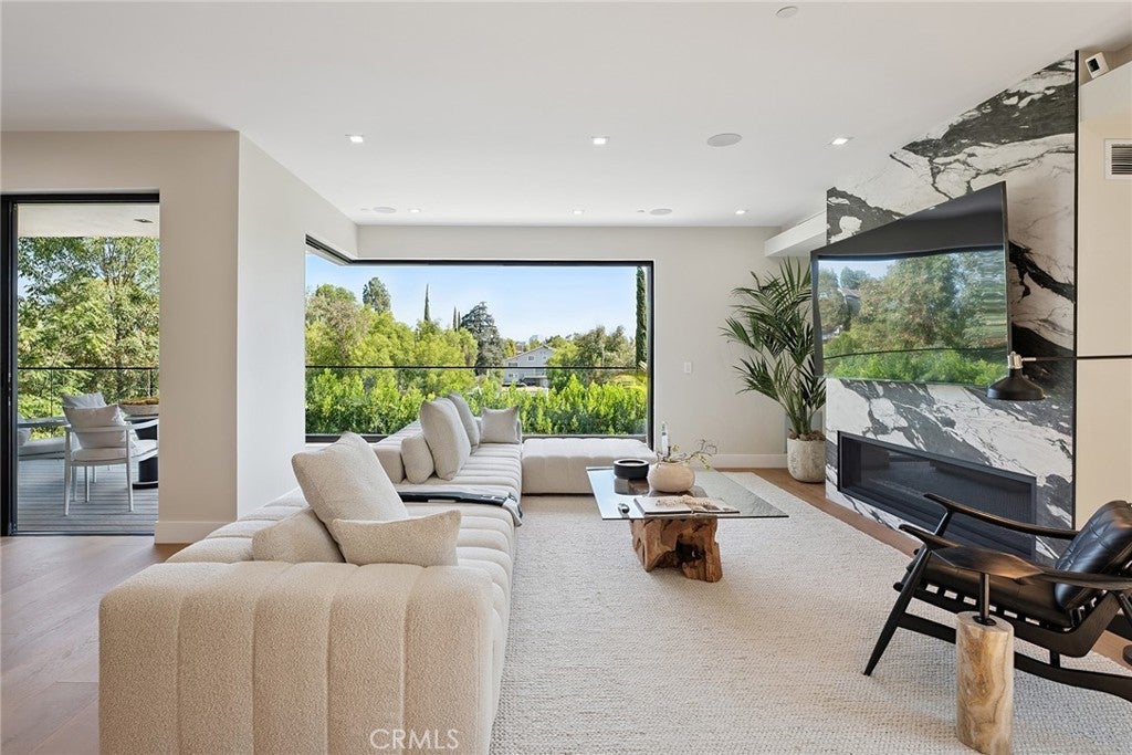 Gated modern estate newly constructed in 2024 with newly built pool & spa located South of the Boulevard with Valley, mountain, & city light views! Privately tucked away and hidden from the street, the property is situated down a long gated driveway with pedestrian access and flanked by tall growth hedging. Oversized parking can accommodate 10 cars plus there is direct access to an extra deep 540 SF 2-car garage. The interiors boast meticulous craftsmanship, designer finishes, and almost every room looks out to gorgeous views. A glass pivot entry door opens to a grand foyer where you’ll find a completely open floor plan filled with natural light from sweeping glass doors that open to the vistas beyond. The chef’s gourmet kitchen boasts massive center island with breakfast bar seating, stainless gourmet appliances, custom soft close cabinetry with quartz counters, separate wine fridge, and great pantry space. The kitchen opens directly to all living spaces including the formal dining room, the spacious family room with stone fireplace, and separate separate den - all rooms highlighted by glass pocket doors & sliders that open to a sprawling wraparound balcony deck with seating area that overlooks the amazing Valley & mountain views. A lower level movie theater has a full bathroom, access to the exterior, and can alternatively be used as a guest suite. Ascend a stunning floating glass and iron staircase to the upper level where you’ll find four well appointed bedrooms including the luxurious primary suite featuring stone fireplace, pocket doors that open to a balcony deck overlooking the gorgeous views, expansive walk-in closet, and sumptuous en-suite bathroom with custom floating vanity with dual sinks, designer tiling, walk-in steam shower with multiple shower heads, soaking tub, and separate toilet room. The three additional bedrooms have walk-in closets and access to their own bathrooms. Two of the rooms have large sliders that open to the backyard and the other opens to a large balcony deck overlooking the views. The resort styled backyard features brand new 2025 built pool and spa, large wraparound patio for lounging and outdoor dining, BBQ center, and grass lawns with lush landscaping. Desirably located adjacent to dining & shopping at the Calabasas Commons, Topanga Canyon shops/eateries, Westfield Topanga Mall/Village, Warner Center, hiking trails & minutes to Malibu.