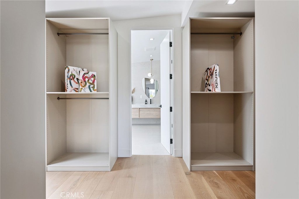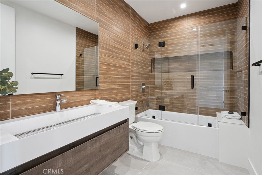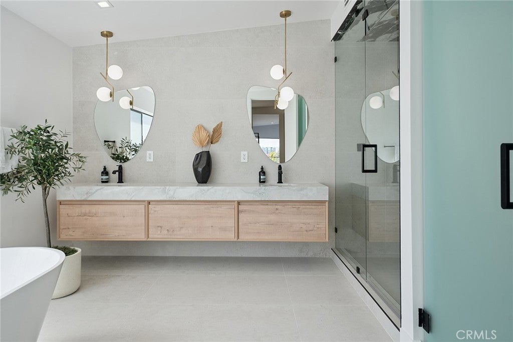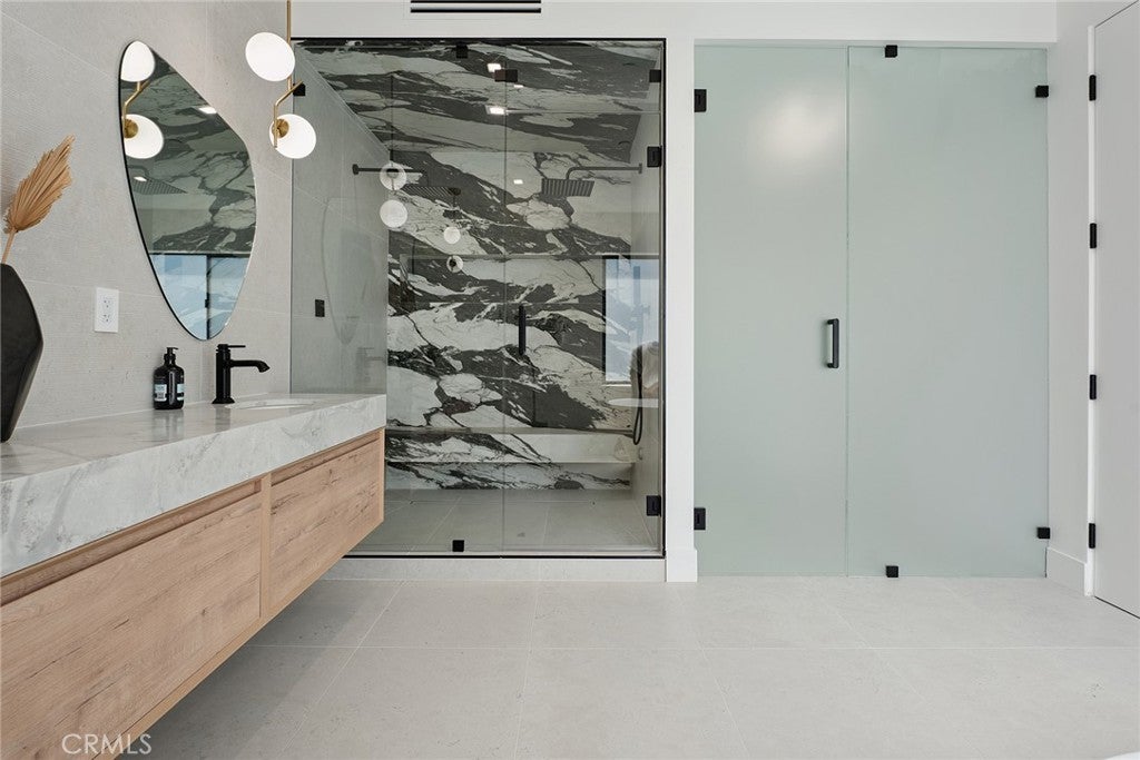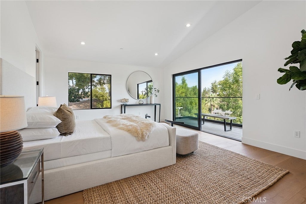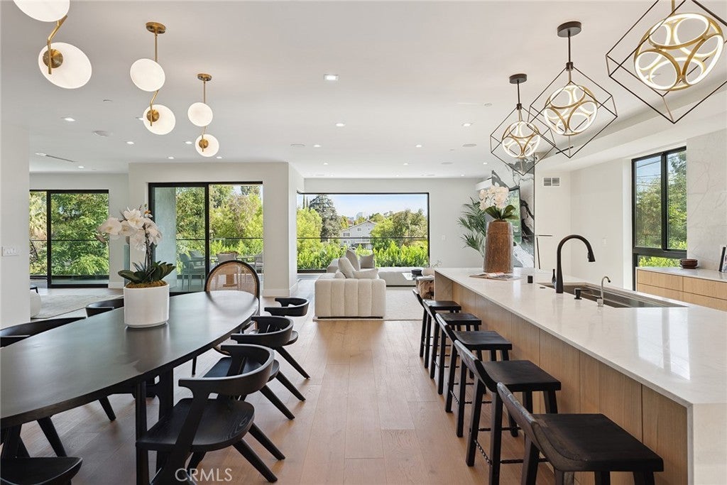 Gated modern estate newly constructed in 2024 with newly built pool & spa located South of the Boulevard with Valley, mountain, & city light views! Privately tucked away and hidden from the street, the property is situated down a long gated driveway with pedestrian access and flanked by tall growth hedging. Oversized parking can accommodate 10 cars plus there is direct access to an extra deep 540 SF 2-car garage. The interiors boast meticulous craftsmanship, designer finishes, and almost every room looks out to gorgeous views. A glass pivot entry door opens to a grand foyer where you’ll find a completely open floor plan filled with natural light from sweeping glass doors that open to the vistas beyond. The chef’s gourmet kitchen boasts massive center island with breakfast bar seating, stainless gourmet appliances, custom soft close cabinetry with quartz counters, separate wine fridge, and great pantry space. The kitchen opens directly to all living spaces including the formal dining room, the spacious family room with stone fireplace, and separate separate den - all rooms highlighted by glass pocket doors & sliders that open to a sprawling wraparound balcony deck with seating area that overlooks the amazing Valley & mountain views. A lower level movie theater has a full bathroom, access to the exterior, and can alternatively be used as a guest suite. Ascend a stunning floating glass and iron staircase to the upper level where you’ll find four well appointed bedrooms including the luxurious primary suite featuring stone fireplace, pocket doors that open to a balcony deck overlooking the gorgeous views, expansive walk-in closet, and sumptuous en-suite bathroom with custom floating vanity with dual sinks, designer tiling, walk-in steam shower with multiple shower heads, soaking tub, and separate toilet room. The three additional bedrooms have walk-in closets and access to their own bathrooms. Two of the rooms have large sliders that open to the backyard and the other opens to a large balcony deck overlooking the views. The resort styled backyard features brand new 2025 built pool and spa, large wraparound patio for lounging and outdoor dining, BBQ center, and grass lawns with lush landscaping. Desirably located adjacent to dining & shopping at the Calabasas Commons, Topanga Canyon shops/eateries, Westfield Topanga Mall/Village, Warner Center, hiking trails & minutes to Malibu.
