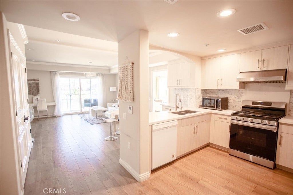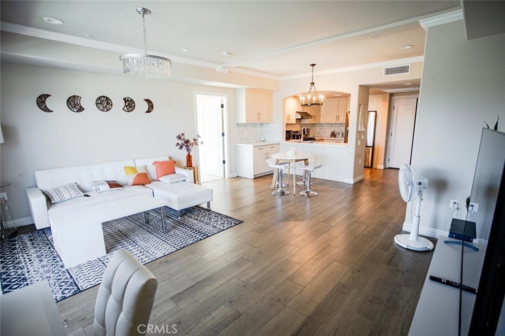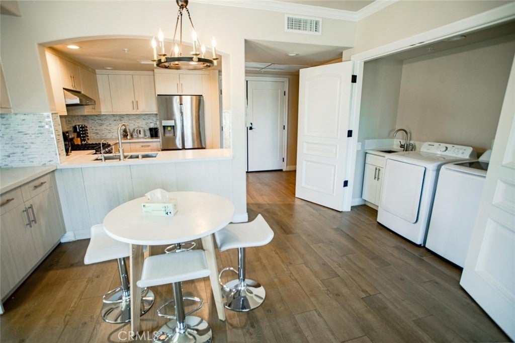 Welcome to this beautifully maintained 1-bedroom, 1-bath condo located at 1598 Long Beach Boulevard, Unit 201. Offering 910 sq ft of comfortable living space, this inviting residence features crown molding, crisp white walls, and a blend of wood-style flooring and plush carpet throughout. The modern kitchen is equipped with stainless steel appliances, perfect for everyday living and entertaining. The spa-inspired bathroom boasts a sleek, contemporary shower, creating a relaxing retreat. Enjoy the convenience of an in-unit washer and dryer tucked neatly into the closet with an added sink for extra functionality. From the living area, you'll have access to your private balcony, ideal for morning coffee or evening relaxation. This unit includes a rare attached 2-car garage and access to premium building amenities, including a welcoming lobby and a fully equipped fitness center. Centrally located with easy access to shopping, dining, and major freeways, this condo offers the perfect blend of style, comfort, and convenience.