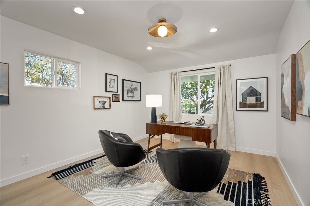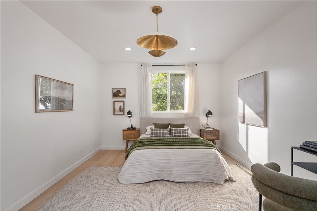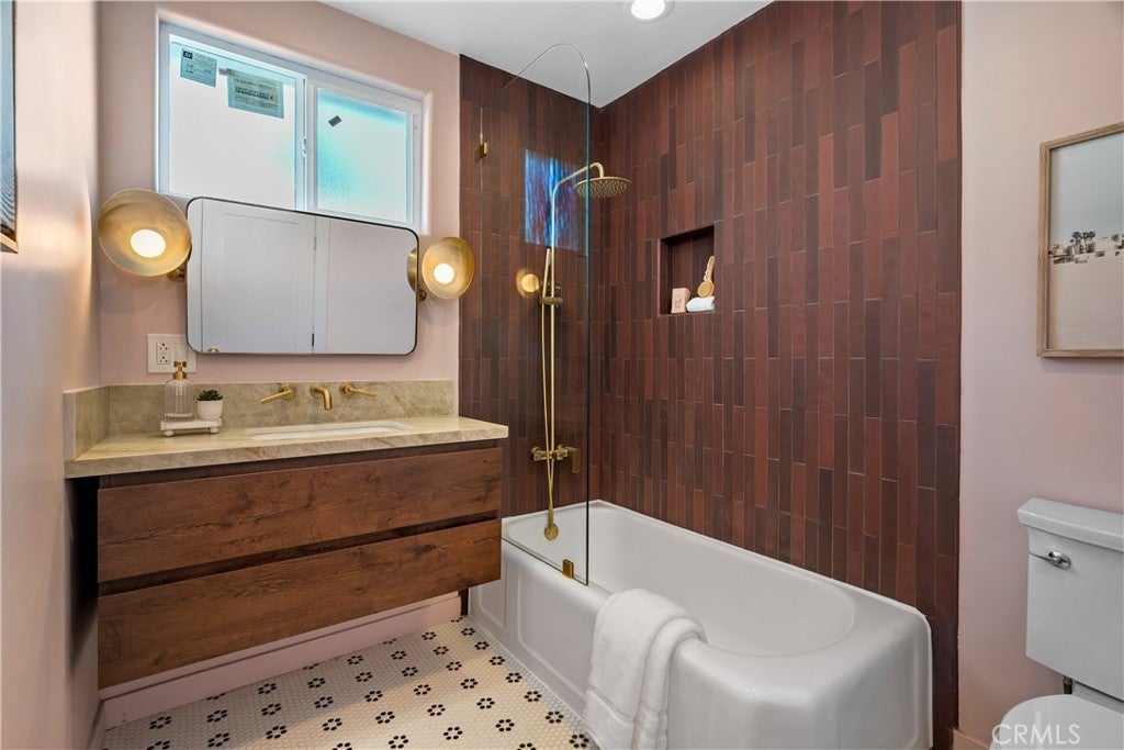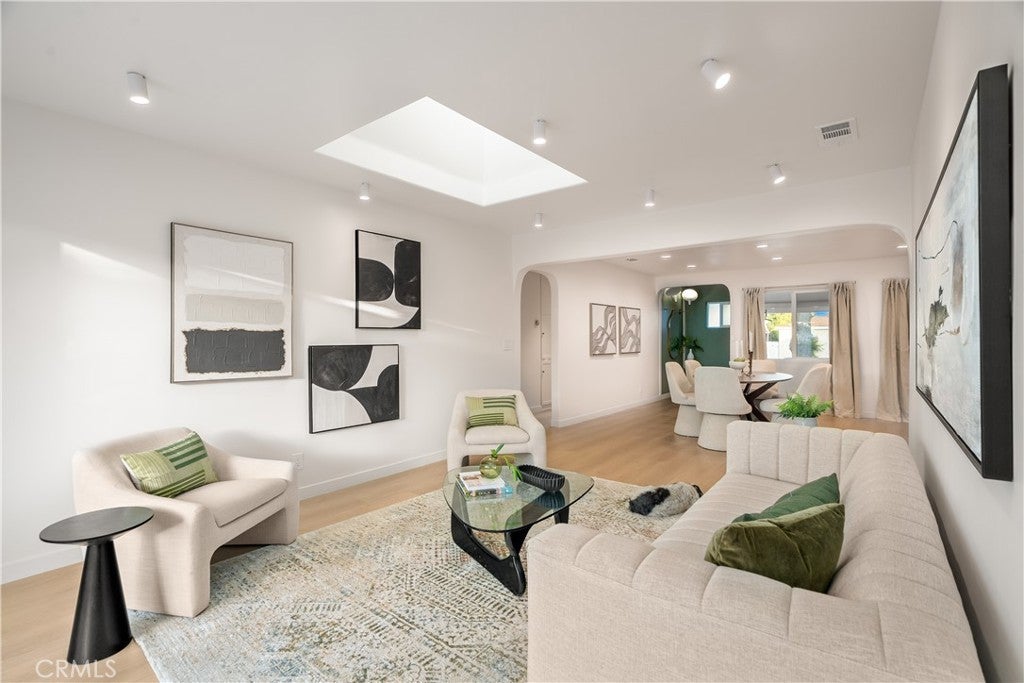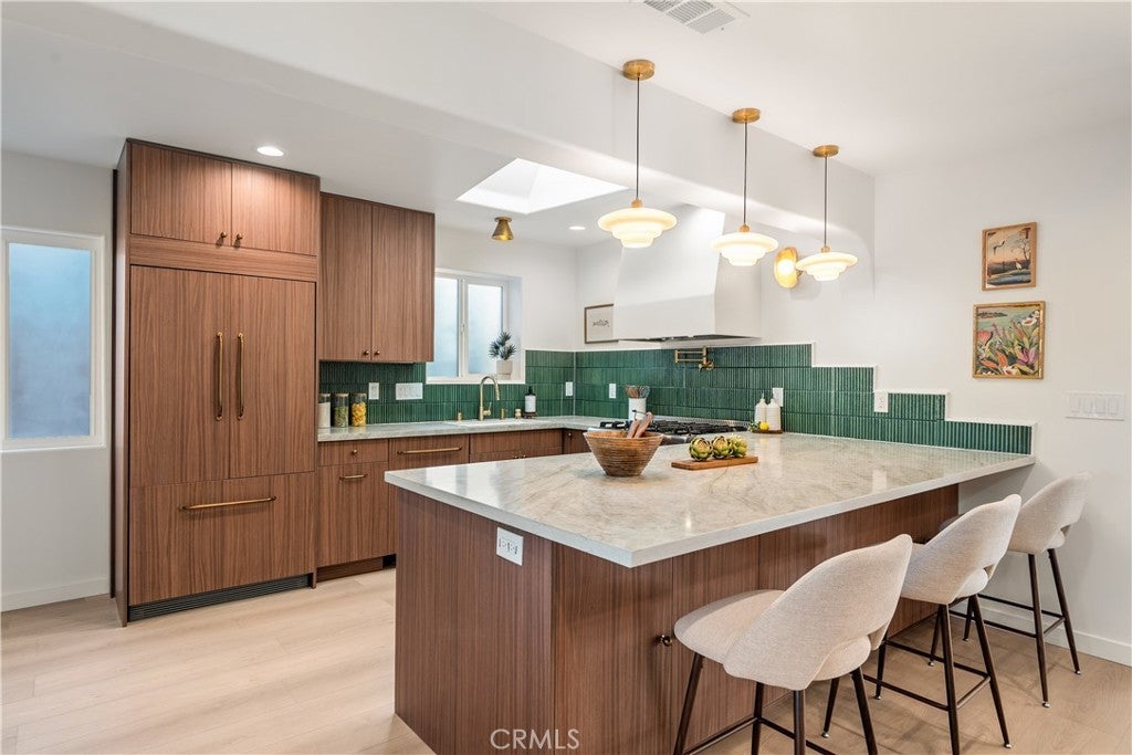 Fully reimagined with intention and care, this beautifully redesigned Valley Village home blends classic Mid-Century inspiration with modern finishes to create a space that feels warm, welcoming, and truly special. Rich walnut cabinetry, handmade statement lighting, and refined brass accents add depth and character throughout, while clean lines and an open layout give the home an effortless flow. Skylights fill the interiors with natural light, highlighting the thoughtful materials and creating a bright, inviting atmosphere. At the heart of the home, the kitchen pairs a sleek slab island, vertical green tile backsplash, and sculptural integrated range hood to form a space that is both functional and expressive. Expansive bifold doors open to the backyard, extending the living space outdoors and making it easy to gather, relax, and entertain. The insulated garage has been thoughtfully converted into a finished flex space, offering approximately 350 square feet of additional usable space ideal for a home office, creative studio, gym, or quiet retreat. Thoughtfully designed and ready for you to make memories