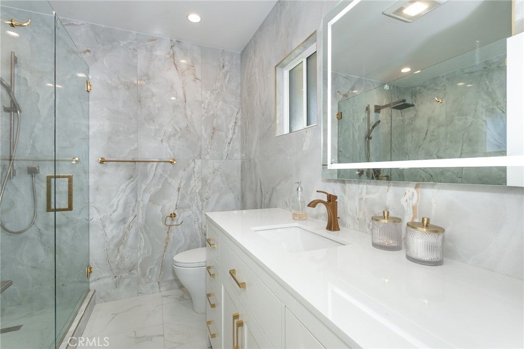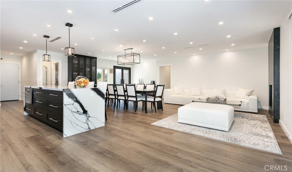 This fully renovated 3-bedroom, 2-bath home offers nearly 1,600 sq.ft. of thoughtfully redesigned living space, complemented by a detached ~400 sq.ft. studio and a heated in-ground pool installed in 2021. Completed in 2024, the renovation touched every part of the main home, creating a clean, cohesive layout designed for everyday living and entertaining. The interior was reconfigured to form a spacious open-concept great room, featuring updated vinyl flooring, fresh interior and exterior paint, all-new recessed lighting installed during the renovation, updated ducting, copper plumbing, dual-pane windows, and sliding glass doors. The large kitchen is seamlessly integrated into the living space and features custom cabinetry, quartz countertops, a generous center island with seating, stainless steel and matte black appliances, and a generously sized pantry. A striking floor-to-ceiling tiled gas fireplace provides a strong architectural focal point to the living area. Bathrooms were fully redesigned in 2024 with curated tile work, modern vanities, updated fixtures, and a refined, spa-inspired finish. Major system upgrades include an upgraded 400-amp electrical panel, central HVAC system installed during renovation, and a tankless water heater for the main house. The detached studio, also completely transformed in 2024, includes its own kitchen, bathroom, laundry, a mini-split air conditioning and heating unit, and separate tankless water heater. Set on an 8,341 sq.ft. lot, the property also features patio space and a large side yard, all tucked away on a quiet cul-de-sac in South Granada Hills, near highly regarded public and charter schools and everyday amenities.