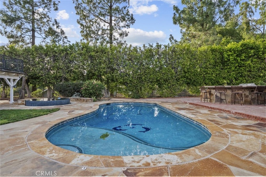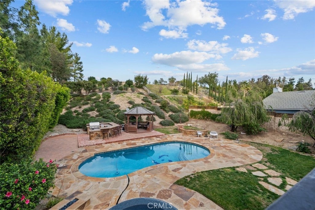 Located at the top of a hill in the desirable Chatsworth community, this beautiful 4-bedroom, 3-bath residence offers 2,757 sq ft of well-designed living space with scenic surroundings, privacy, and exceptional outdoor amenities. Set on an expansive lot, the property presents a rare opportunity with potential for multiple ADUs or a guest house, making it ideal for those seeking flexibility and future expansion. Inside, the home features elegant formal living and dining areas, highlighted by custom woodwork, crown molding, and statement lighting. The spacious layout is well-suited for both everyday living and entertaining. A beautifully upgraded bathroom showcases a spa-like walk-in shower with custom stone finishes, adding a refined touch. The backyard is designed for both relaxation and hosting, featuring a resort-style pool, raised spa, gazebo, and a large covered patio. The outdoor space is further enhanced by built-in barbecue with fiber optic countertops, creating an inviting ambiance for evening gatherings. Mature landscaping and generous open areas offer endless possibilities for customization. Additional highlights include a 3-car attached garage, generously sized bedrooms, and sweeping hillside views that create a peaceful, retreat-like setting. Conveniently located within walking distance to Sierra Canyon School, this special hilltop property offers a rare blend of privacy, lifestyle, and long-term potential in a prime Chatsworth location.